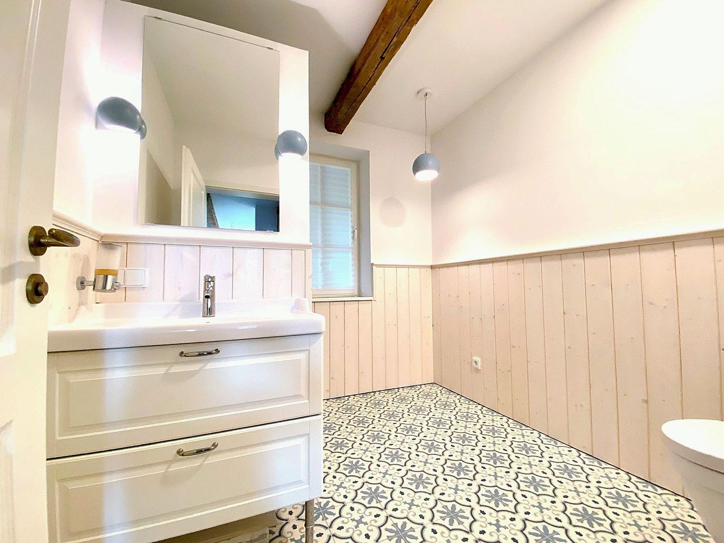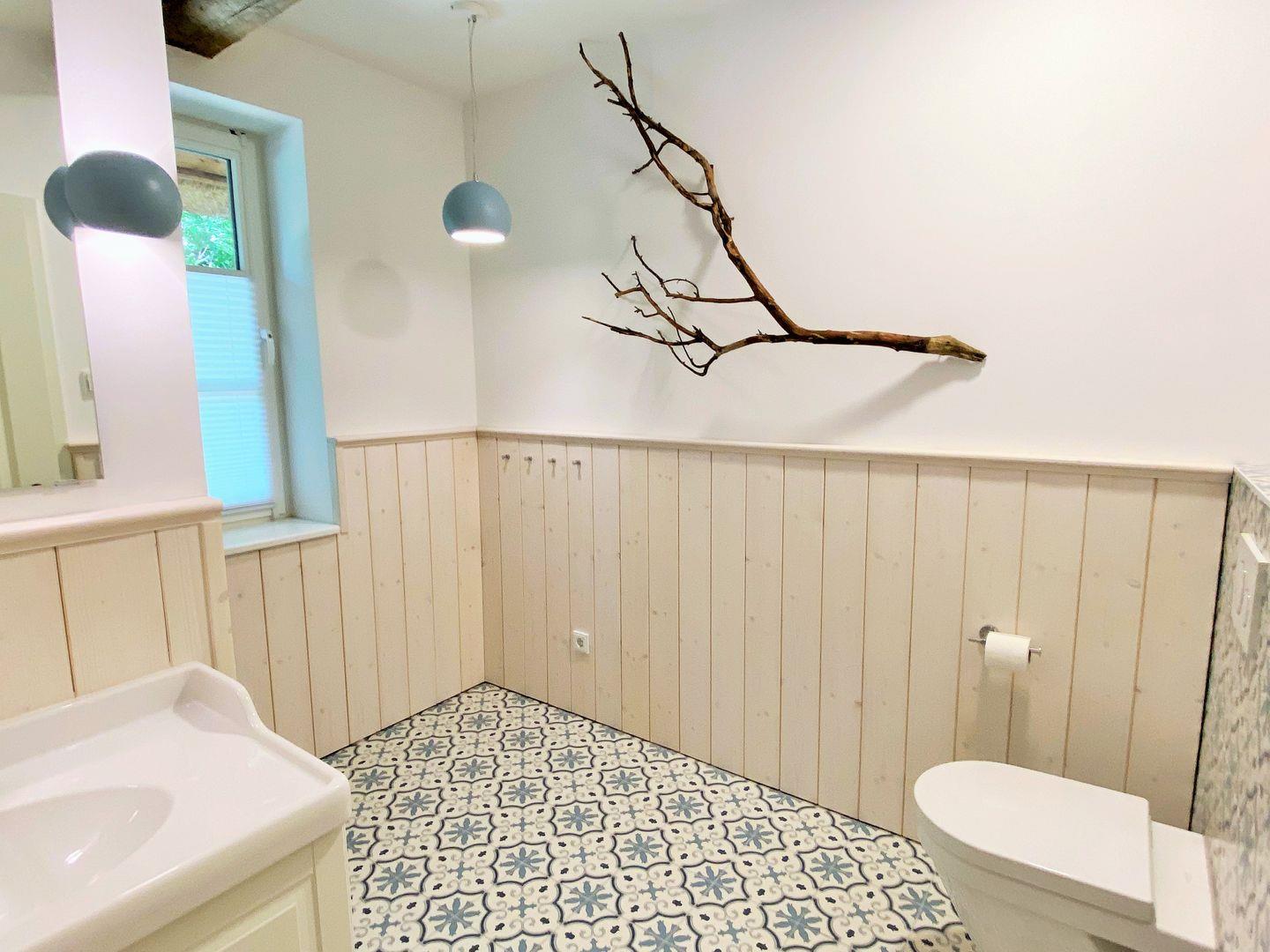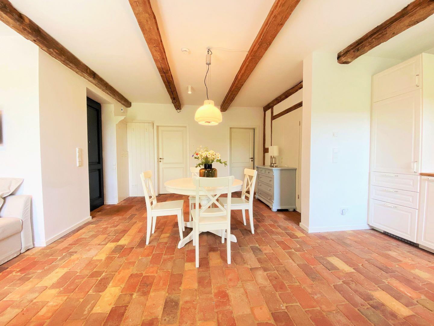 Die moderne, sehr gemütliche und großzügige 2-Zimmer-Wohnung (ca. 50 m²) im Erdgeschoss ist komplett eingerichtet. Der Bodenbelag der Wohnung ist Ziegelboden mit Fußbodenheizung, das Bad / WC sind gefliest.