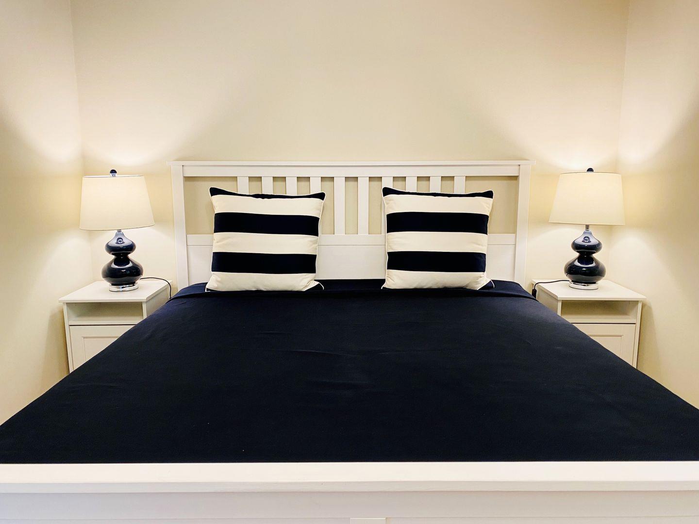 Das moderne und helle Schlafzimmer ist mit einem bequemen Doppelbett (180 x 200 cm), Nachttischen mit Lampen sowie einem geräumigen Kleiderschrank mit Regal eingerichtet.