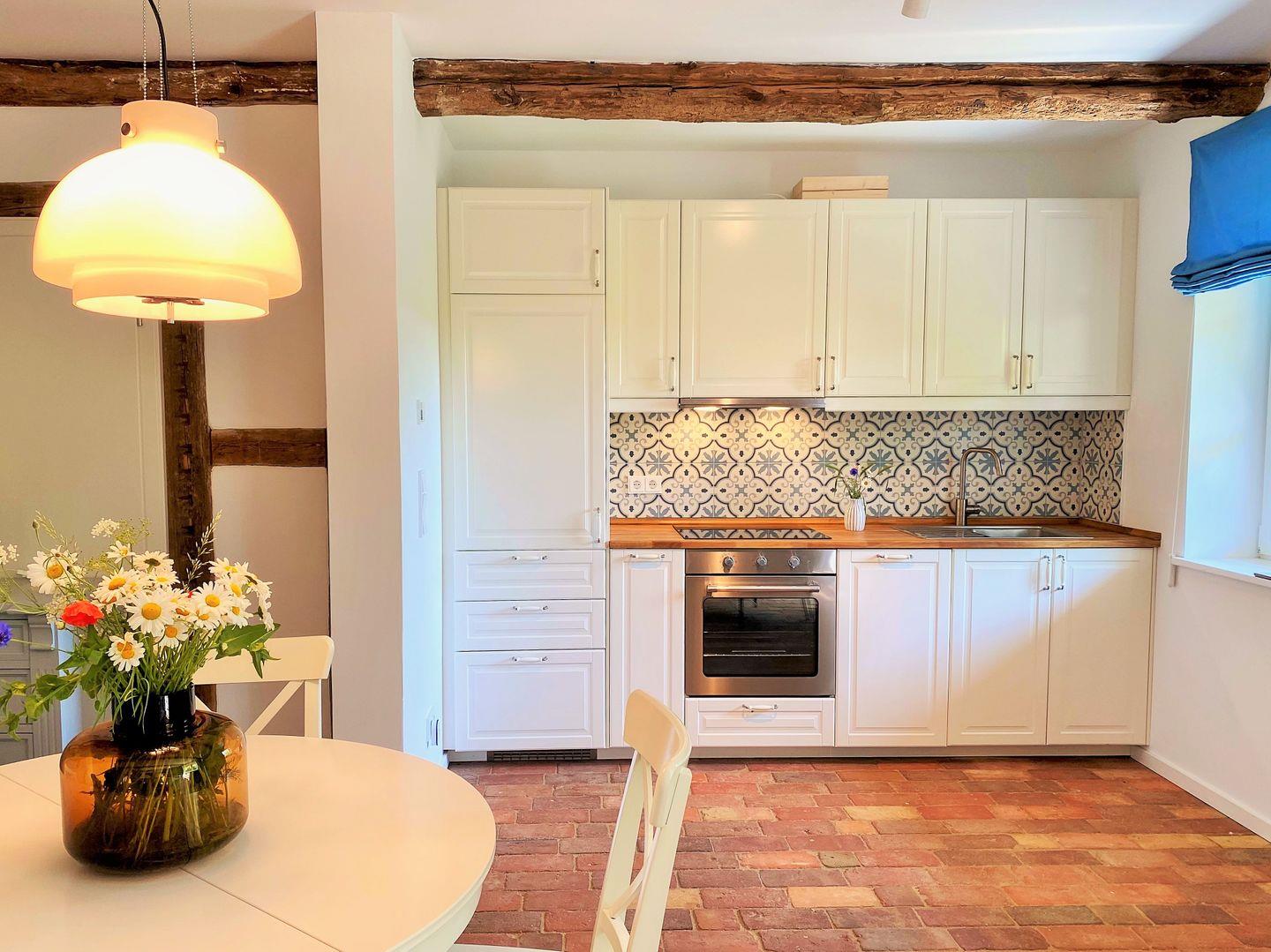 Die offene Küche beinhaltet eine voll ausgestattete Einbauküchenzeile in gehobener Ausstattung mit 4-Platten-Induktionsherd, Backofen, Dunstabzug, Kühlschrank mit Gefrierfach, Geschirrspülmaschine, Kaffeemaschine, Wasserkocher und Toaster. Die Küche ist mit Geschirr, Gläsern, Besteck und Töpfen bestens und vollständig ausgestattet.