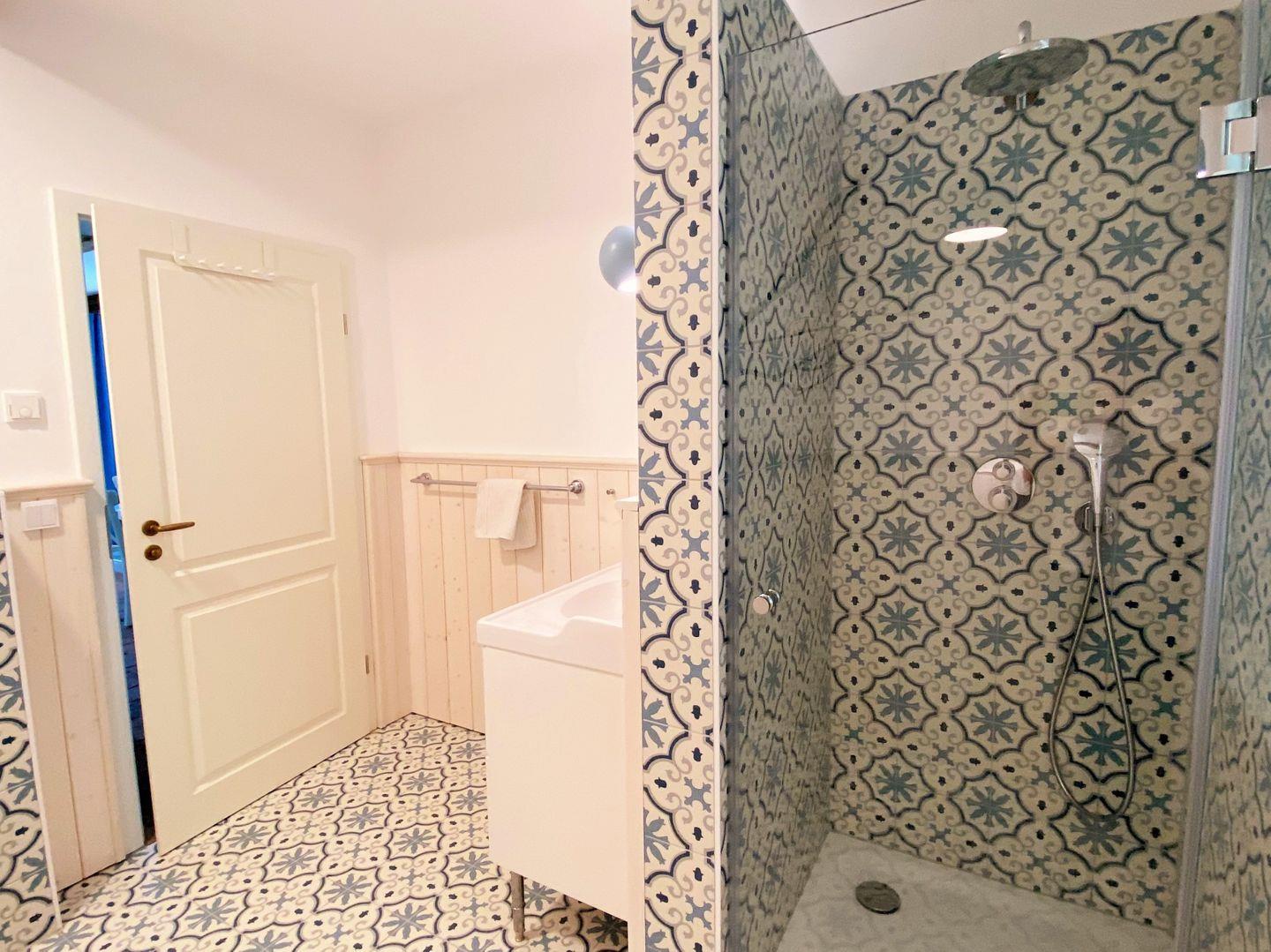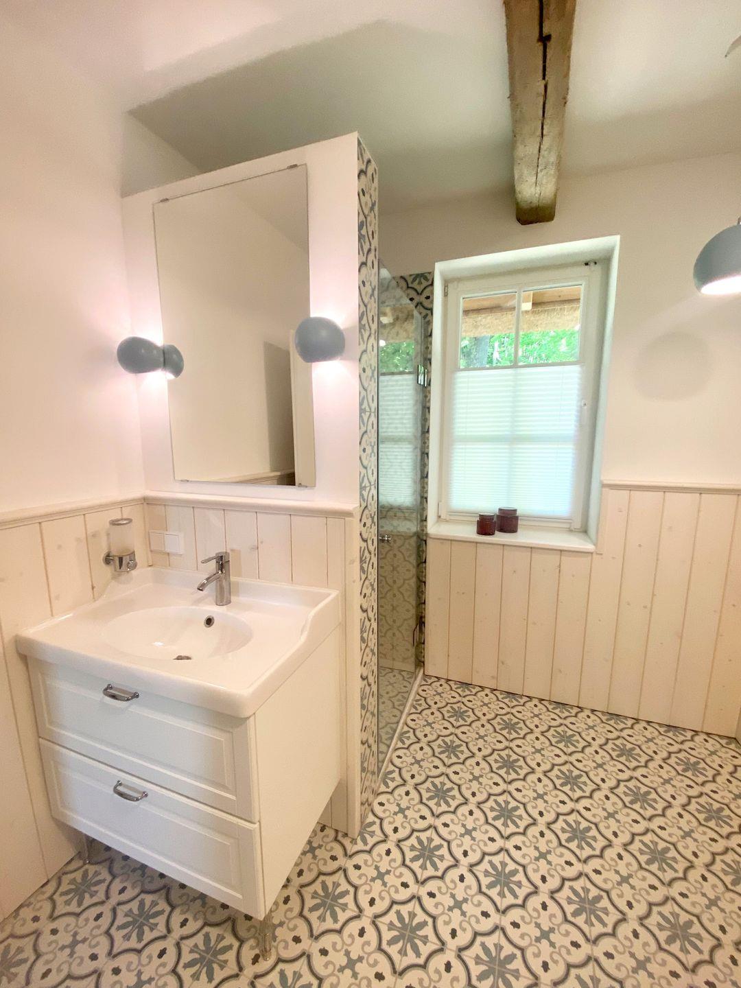 Das exklusive und hochwertige Badezimmer (mit Tageslicht / Fenster) verfügt über eine Echtglas-Dusche mit ebenerdigem Einstieg (seniorenfreundlich!), Waschtisch mit Unterschrank, WC, Fußbodenheizung, Föhn sowie ausreichend Ablagemöglichkeiten.