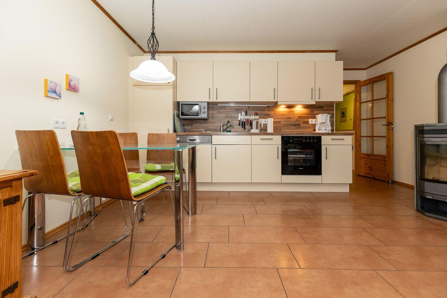 Die offene, voll ausgestattete Küche verfügt über Cerankochfeld, Backofen, Geschirrspüler, Kühlschrank mit Gefrierfach, Kaffeemaschine, Toaster und Wasserkocher. Der angrenzende Essbereich lädt zu gemeinsamen Mahlzeiten mit Blick ins Grüne ein.