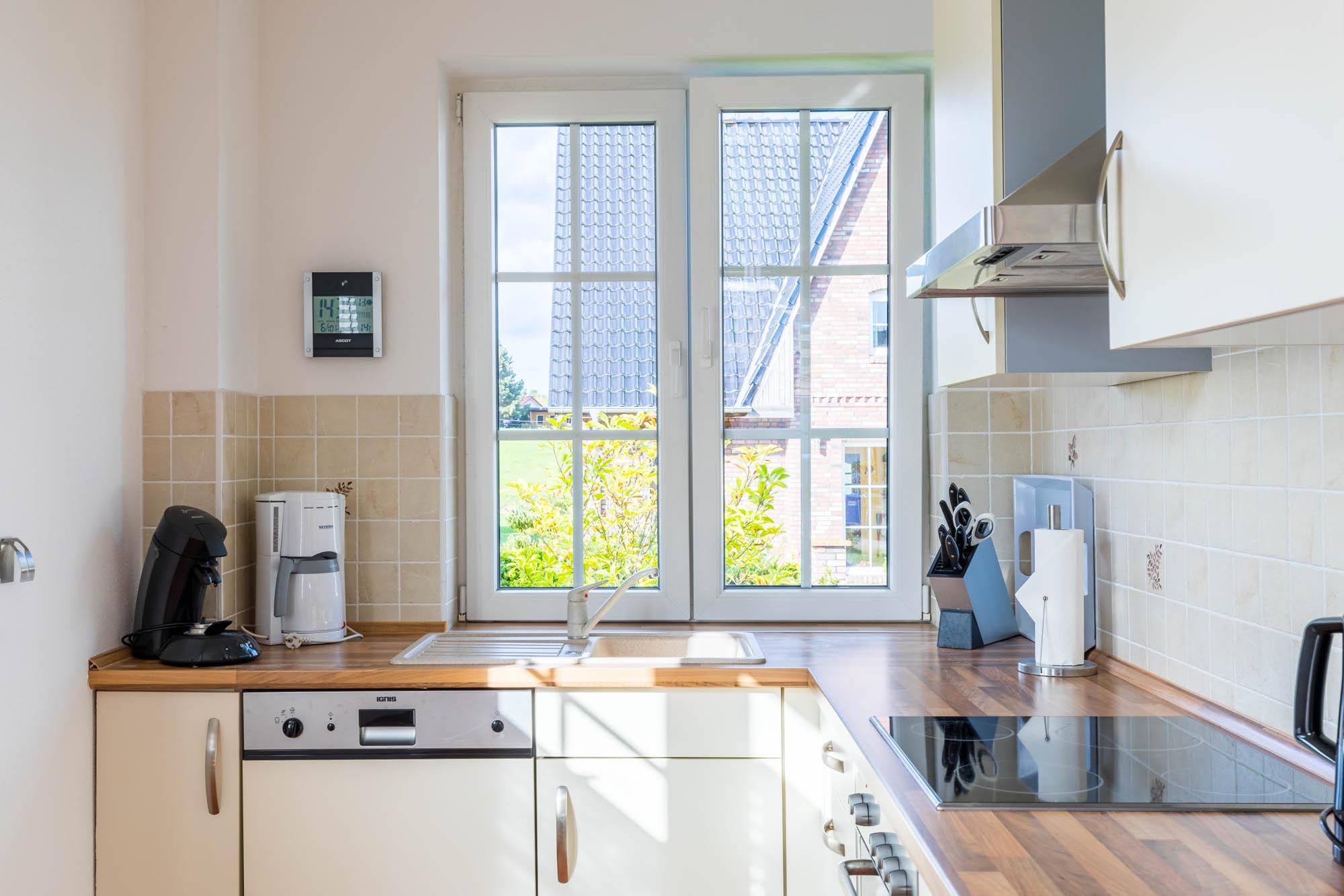 Die offene Wohnküche ist komplett und zeitgemäß ausgestattet und sorgt für eine problemlose Selbstversorgungsmöglichkeit. So finden Sie hier neben einem Wasserkocher, einer Kaffeemaschine, Herd und Kühlschrank z.B. auch eine Spülmaschine.