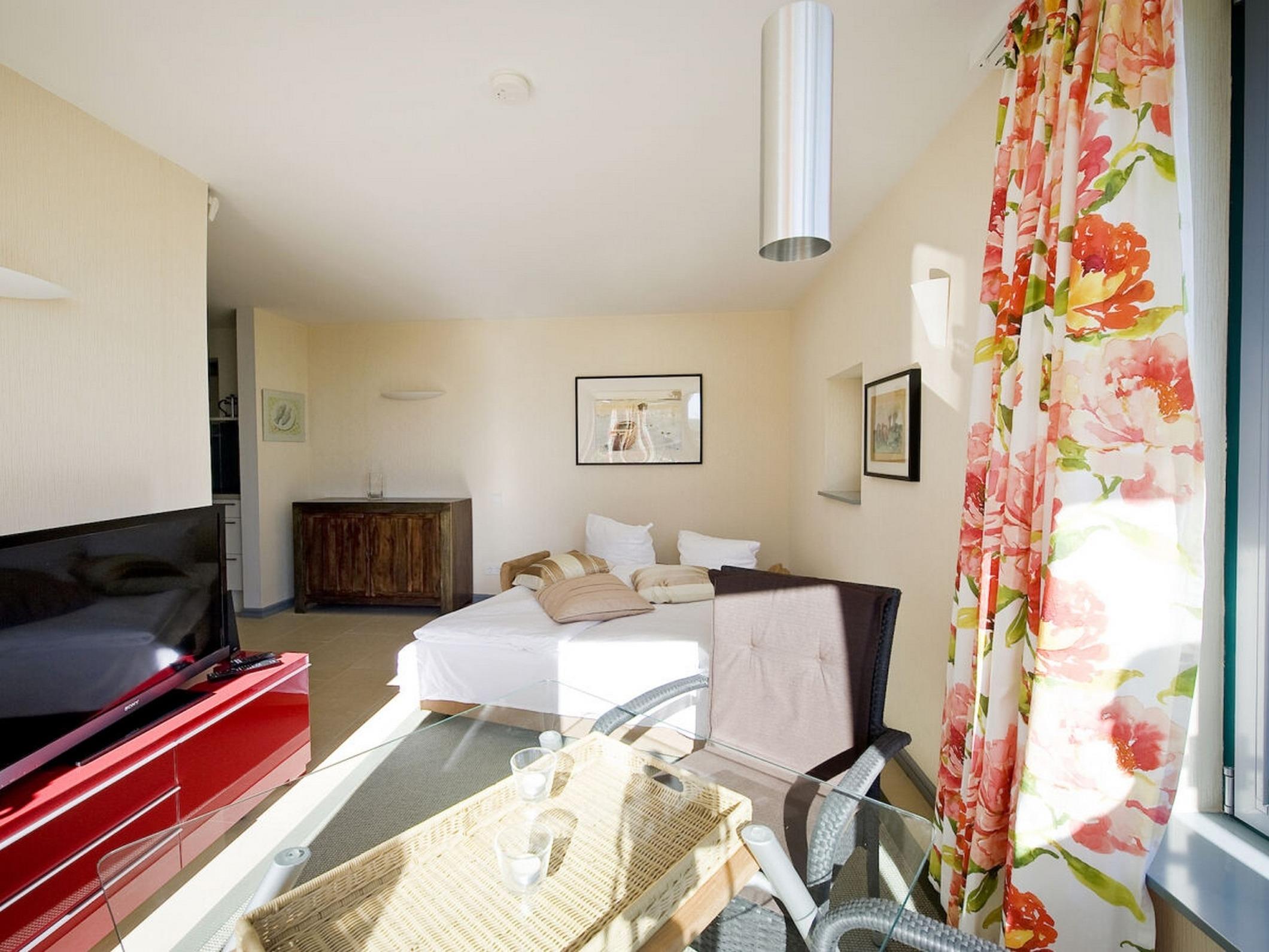Wenn Sie das Appartement betreten, werden Sie von einer Sitzecke mit TV-Bereich (Sat-LCD-TV) empfangen. Hier können Sie gern auch Ihre Mahlzeiten einnehmen.