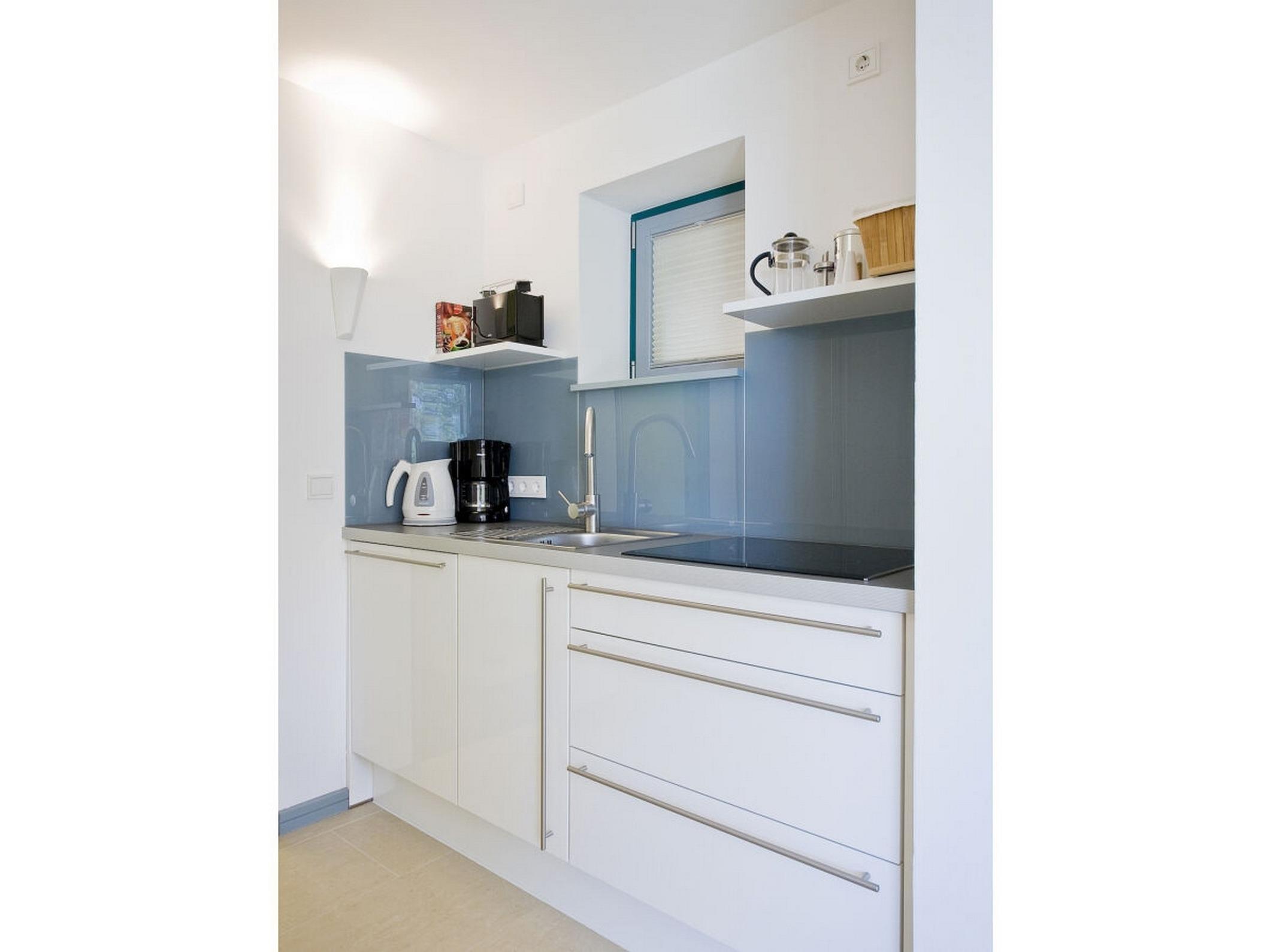 Die angrenzende offene Küchenzeile ist ausgestattet mit Geschirrspüler, Herd mit Ceranfeld, Kühl-/Gefrierschrank, Kaffeemaschine, Wasserkocher und Toaster.