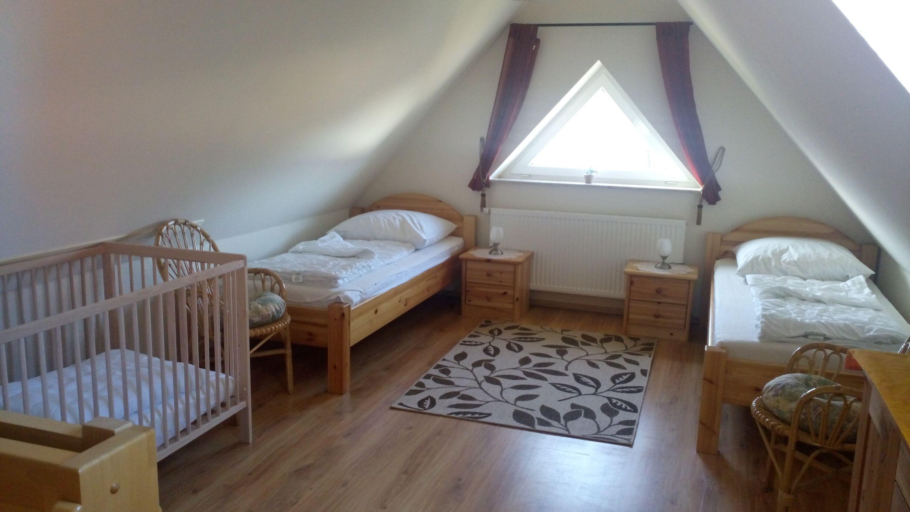 Das Obergeschoss verfügt über ein komfortables Schlafzimmer mit großem Kleiderschrank. Außerdem befindet sich hier das großzügige Duschbad, ausgestattet mit Dusche, Waschbecken, WC, Föhn, Waschmaschine und einer eigenen Sauna im Haus – ideal für entspannte Wellnessmomente. Auch hier sorgt eine Fußbodenheizung für wohlige Wärme. Ein weiteres Schlafzimmer liegt im Spitzboden und ist mit zwei Einzelbetten sowie einem Kinderbett ausgestattet – ein gemütlicher Rückzugsort, besonders für die kleinen Gäste.