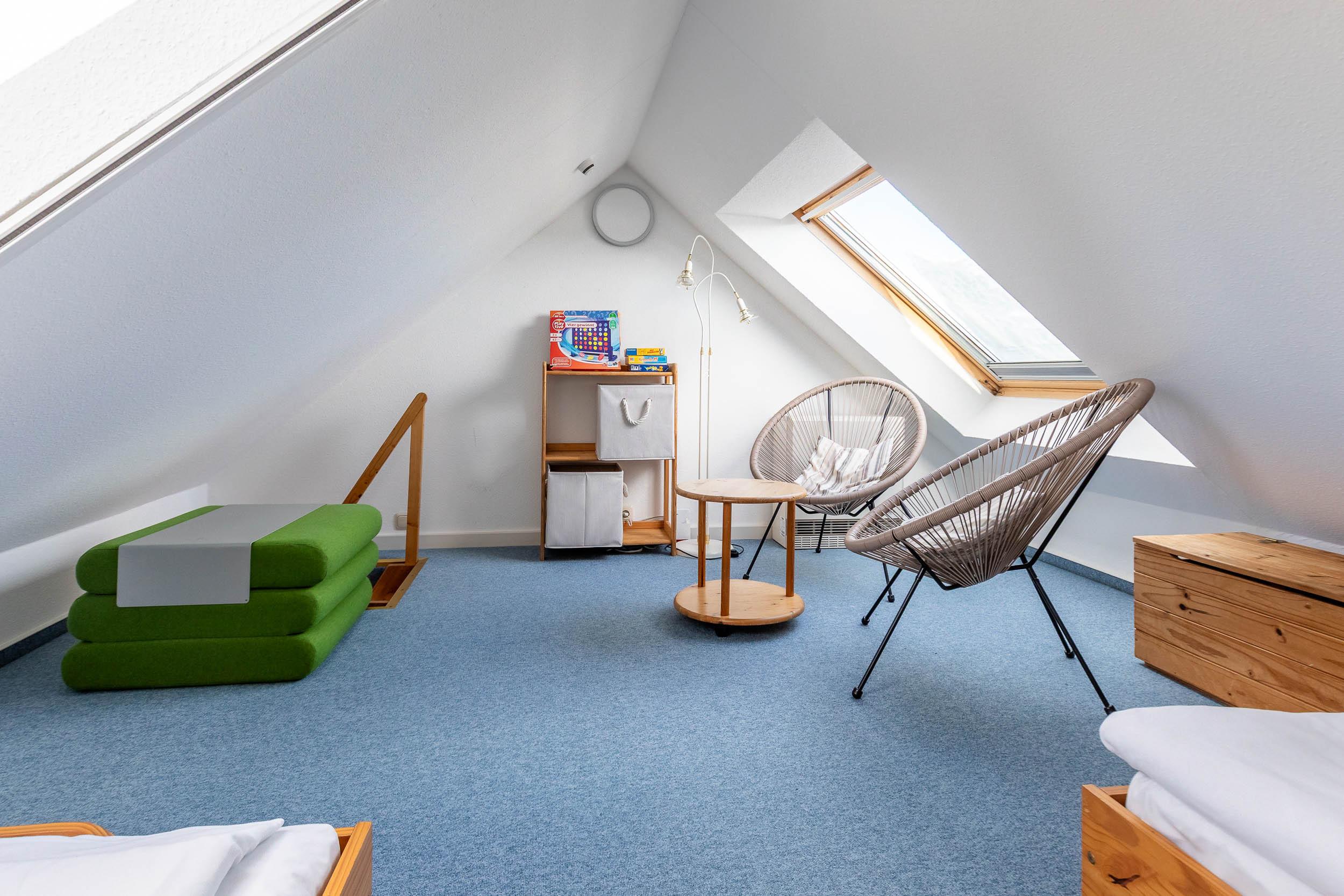 Hier können Sie in der offenen Schlafgalerie in Urlaubsträumen schlummern. Zwei Einzelbetten sowie eine Urlaubsbibliothek mit Sitzecke stehen bereit.