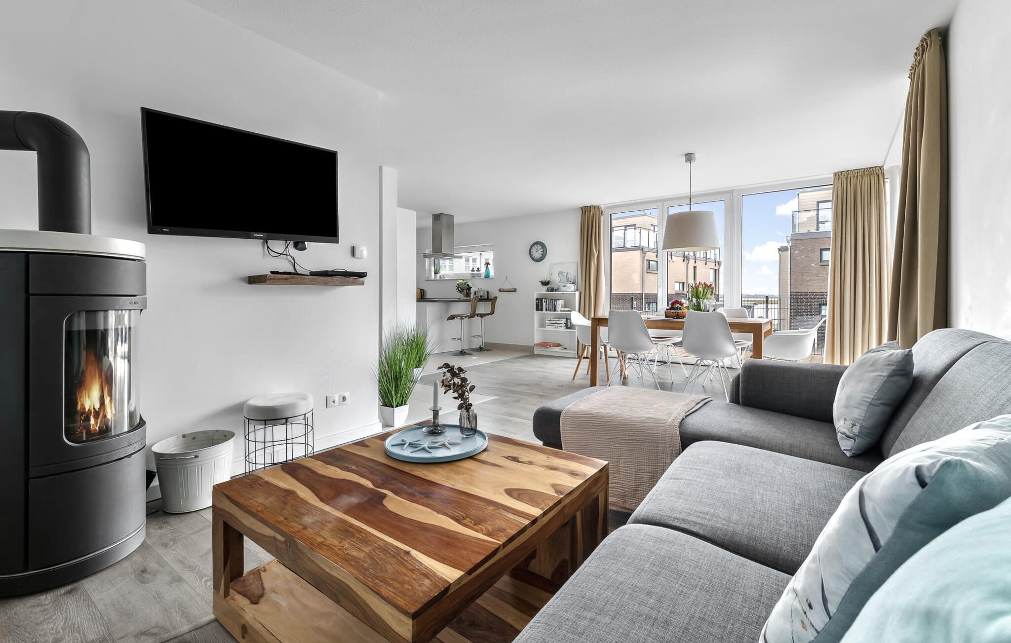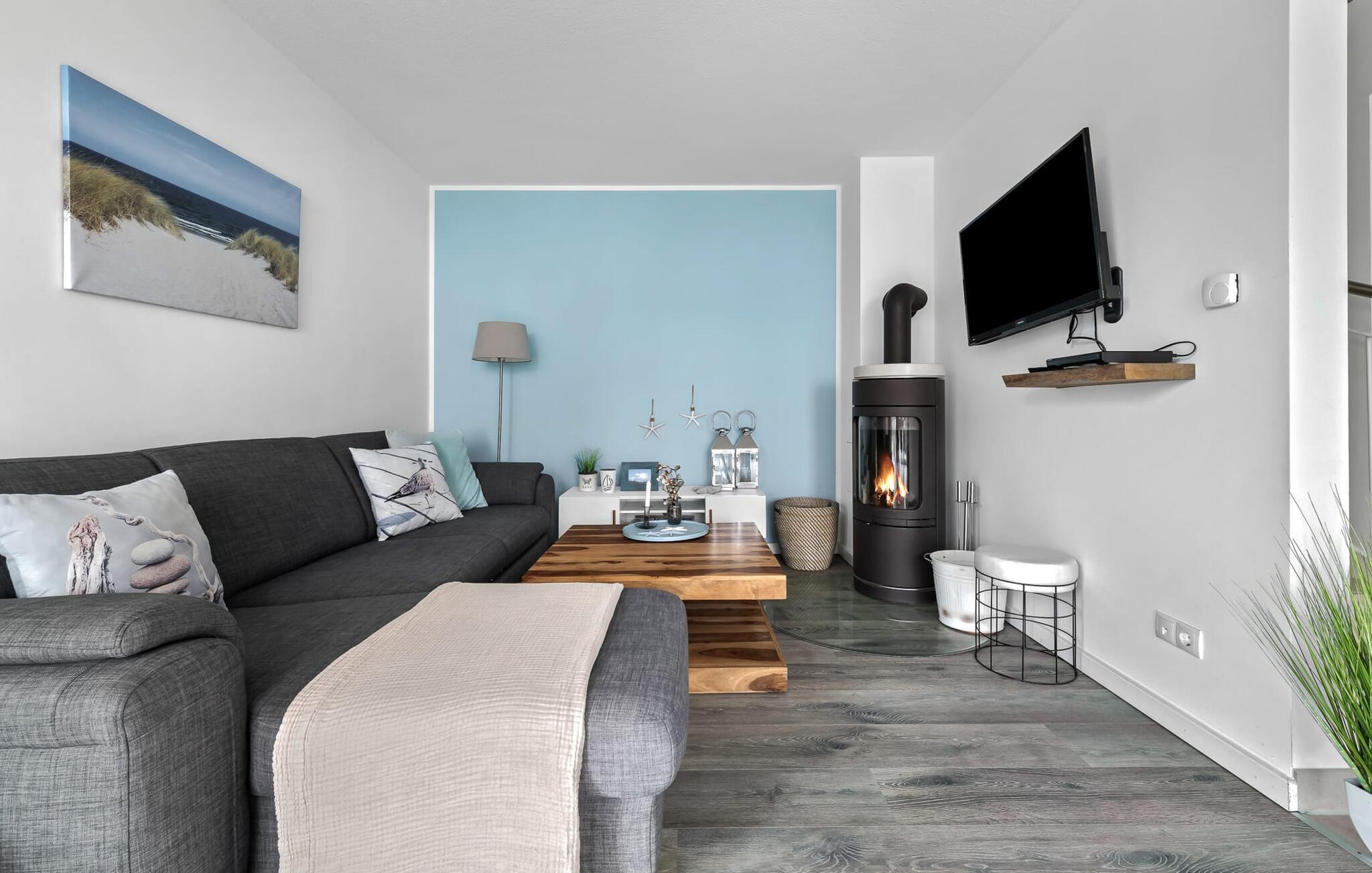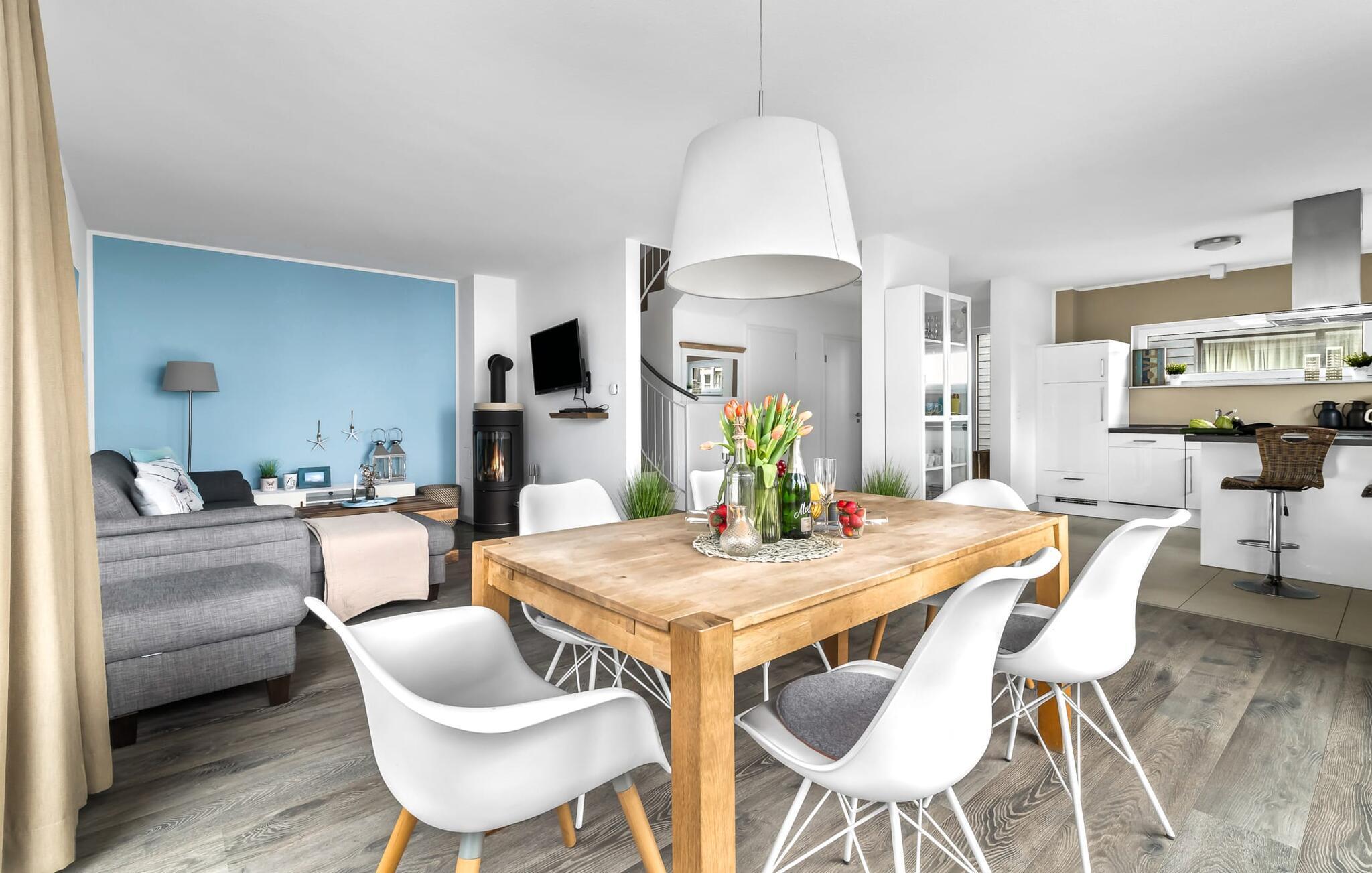 Im Erdgeschoss erwartet euch ein großzügiger Wohn-/Essbereich mit einem bequemen Sofa (inklusive Schlaffunktion), einem heimeligen Kaminofen und einem Smart-TV. Der Essbereich grenzt an die moderne und offene Küche, die mit allen Annehmlichkeiten ausgestattet ist. Von hier aus gelangt ihr auf die erste sonnige Terrasse, die einen seitlichen Blick auf die glitzernde Ostsee und den malerischen Hafen bietet.