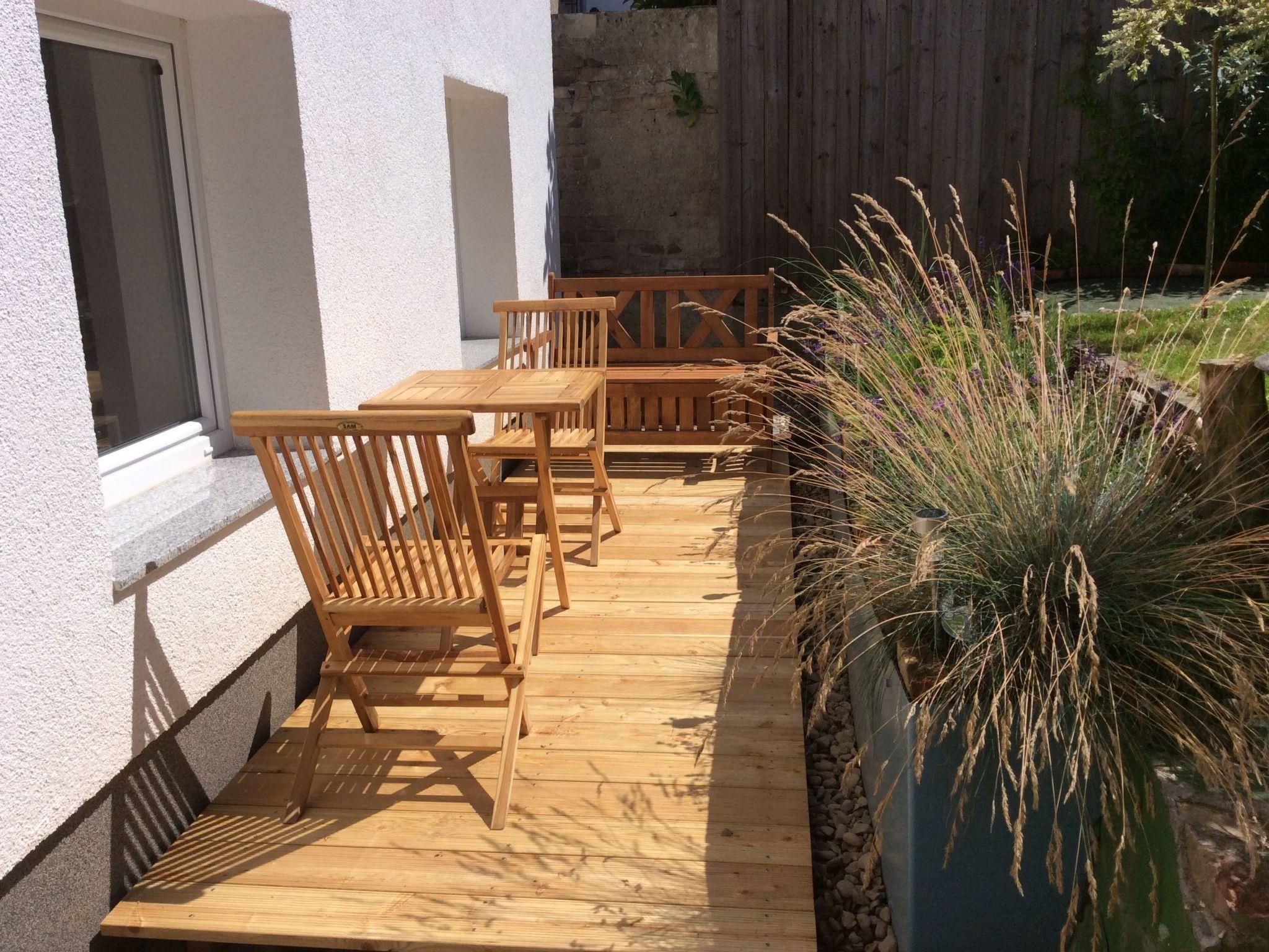 Der liebevoll gepflegte und voll umfriedete Garten lädt mit seinen Terrassen zu ruhigen, entspannten Momenten im Liegestuhl ein. Genießen Sie die Abgeschiedenheit und Ruhe, fernab des städtischen Trubels. Kostenlose, öffentliche Parkplätze finden Sie zudem stets in der angrenzenden Straße.