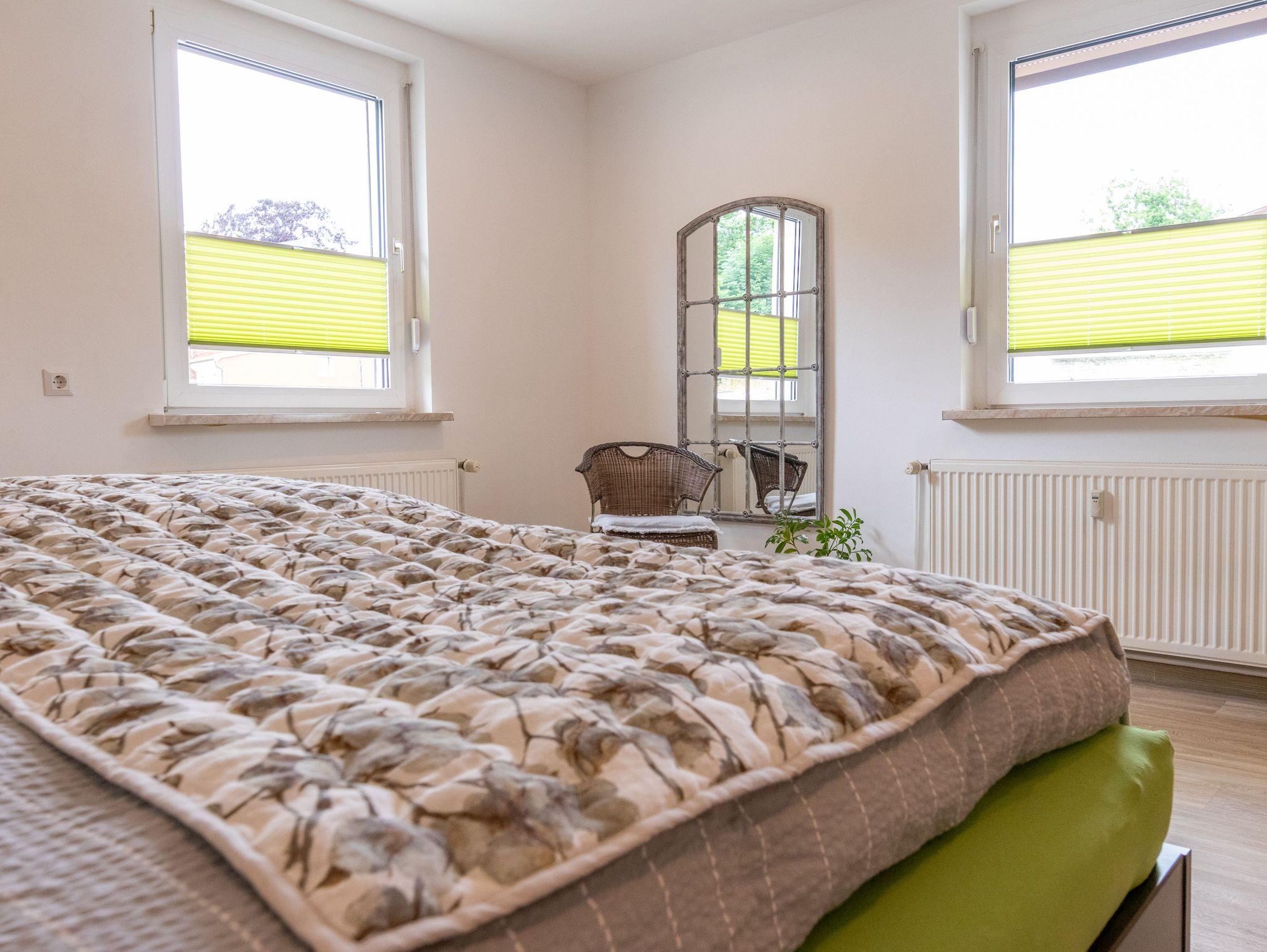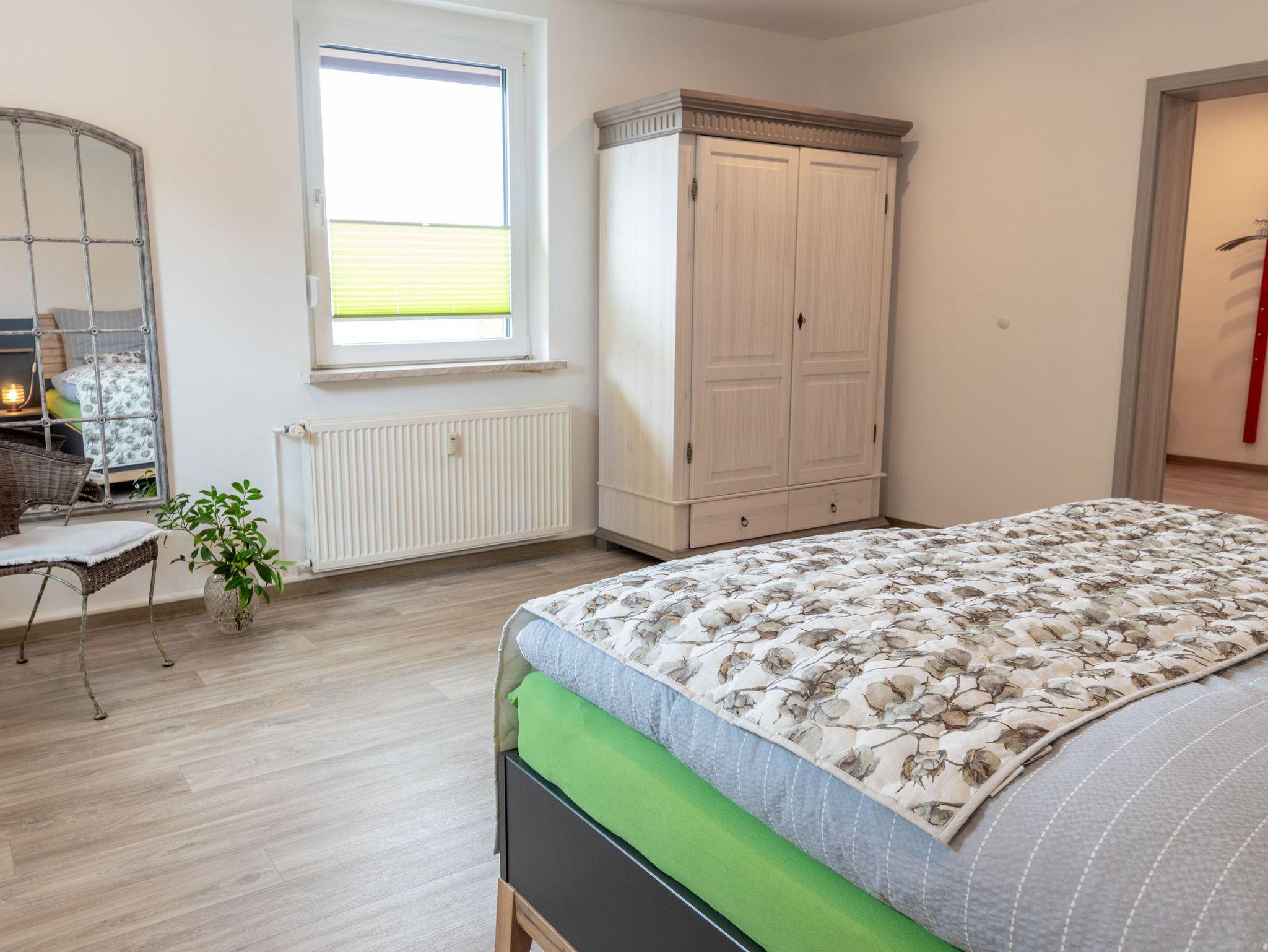 Die 70m² Ferienwohnung 1 bietet Platz für bis zu 2 Personen und 1 Kind bis 17 Jahre und befindet sich im Erdgeschoss des Zweifamilienhauses - mit separatem Eingang. Der großzügige Wohnraum ist mit einer gemütlichen Couch, einladenden Sesseln und Sat-TV ausgestattet. Eine offene Küchenzeile und ein Essbereich sind ebenfalls in den Wohnbereich integriert. Die Küchenzeile verfügt über einen Kühlschrank mit Gefrierfach, ein 2-Platten Ceranfeld, eine Mikrowelle mit Grillfunktion, eine Kaffeemaschine, einen Wasserkocher, sowie Toaster und Eierkocher. Im Bad findest du ein großes Waschbecken für zwei Personen, Bluetooth-Spiegel, ein Haartrockner, Dusche und WC. Das Schlafzimmer bietet dir mit einem Doppelbett mit getrennten Matratzen, zwei Nachttischen, zwei Kofferablagen, einem großen Kleiderschrank, Spiegel und einer Sitzmöglichkeit viel Stauraum und Komfort für erholsame Nächte. Vor der Wohnung erwartet dich eine eigene, möblierte Terrasse samt Grill, auf der du den Tag entspannt ausklingen lassen kannst.