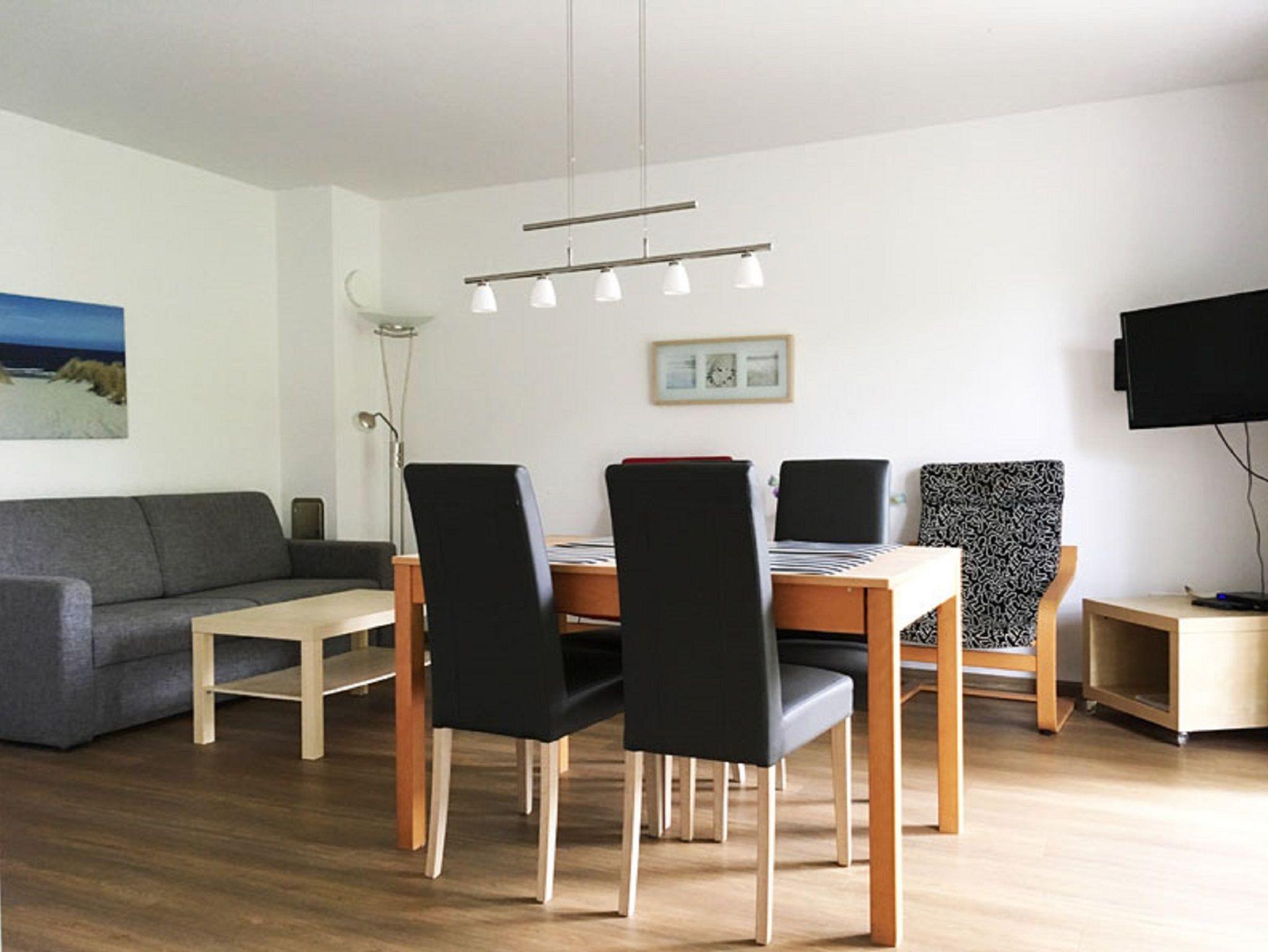 Die Ferienwohnung Achterwasser befindet sich im Erdgeschoss des Hauses und ist ca. 59 m² groß. Das geräumige Wohnzimmer ist ausgestattet mit einem gemütlichen Sofa, Sessel zum Lesen und Fernsehen, mit einem Fernseher und mit einem Radio, sowie mit einem Esstisch und vier Stühlen. Durch das große Terrassenfenster haben Sie einen schönen Ausblick ins Grüne. Die offene Küchenzeile verfügt über eine Ausstattung zum alltäglichen Kochen: Geschirr, Kochgeschirr, Ceranfeld, Backofen, Kühlschrank, Spülmaschine, Mikrowelle, Kaffeemaschine, Wasserkocher und Toaster.