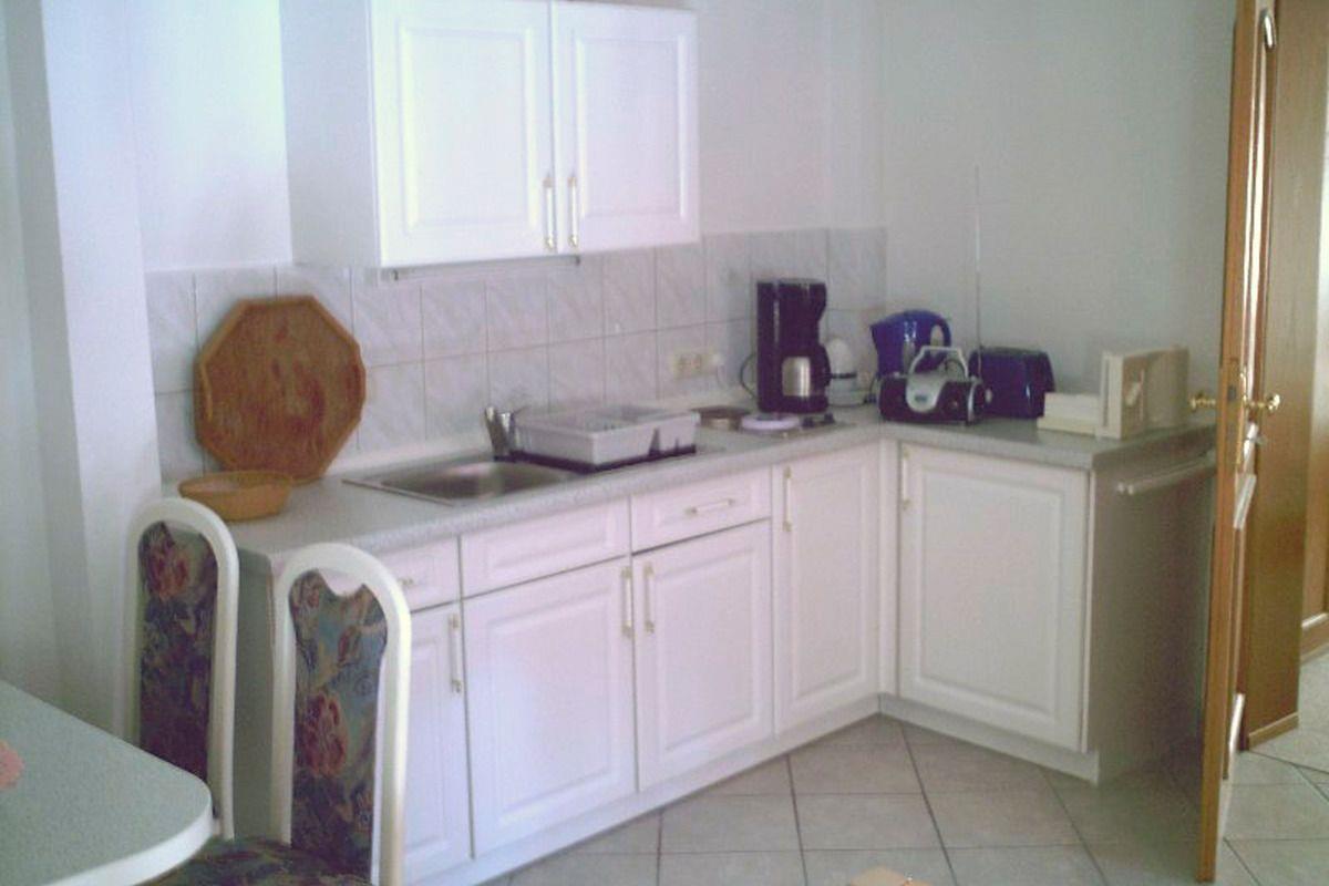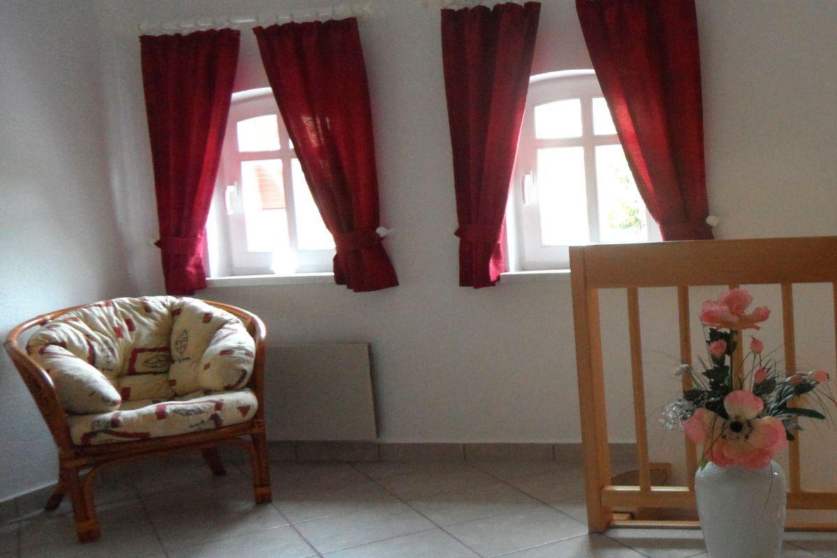 Die 45 m² Ferienwohnung wurde 2016 saniert und geht über zwei Etagen. Im Erdgeschoß befindet sich das Wohnzimmer, das mit einer Doppelbettcouch, zwei Sesseln, einem Schrank, einer Garderobe und einem Flachbild-Kabel-TV möbliert ist. Über eine viertel gewendelte Treppe gelangen Sie ins Obergeschoß. Hier befindet sich die Küche, das Bad und das Schlafzimmer. Die Küche ist komplett eingerichtet mit Essecke und Einbauküche mit 2 Elektroherdplatten, einer Spüle, einem Toaster, einem Eierkocher, einem Kaffeemaschine, einem Wasserkocher, einer Mikrowelle, einem Minibackofen und einem Kühlschrank mit Tiefkühlfach. Das Schlafzimmer ist mit zwei Betten, einem Schlafsessel, diversen Einbauschränken und einem Flachbild-TV mit Kabelanschuss eingerichtet. An kühleren Tagen spendet die elektrische Heizung in der Wohnung wohlige Wärme. Das große Bad mit Fenster ist raumhoch gefliest und verfügt über WC, Waschbecken, Dusche, Stuhl und diverse Ablagemöglichkeiten. Auch ein Fön ist vorhanden. Direkt vor der Wohnung können Sie im Freien in geselliger Runde beisammen sein und den herrlichen Blick über die Kastanienbäume hinweg auf den Kirchturm genießen. Auf der Terrasse steht Ihnen ein Strandkorb, ein Tisch und Stühle zur Verfügung. Auf Wunsch kann gegrillt werden. Für Ihre Kinder steht eine Spielesammlung bereit.