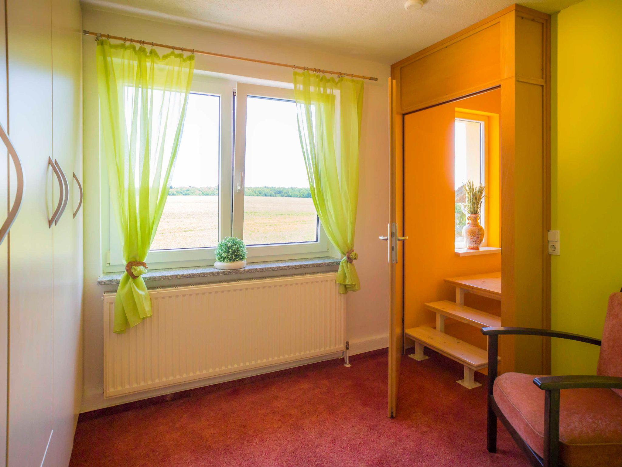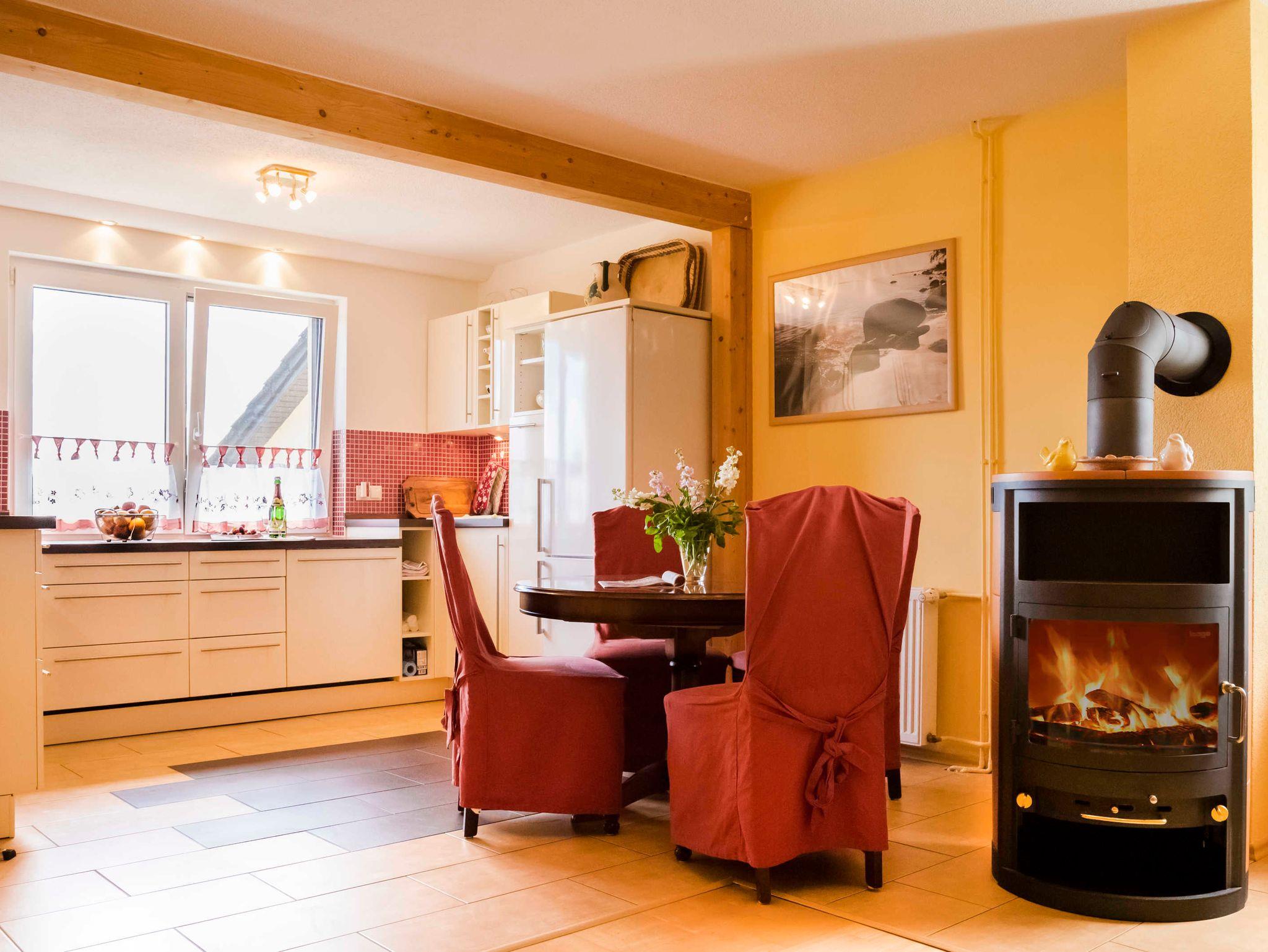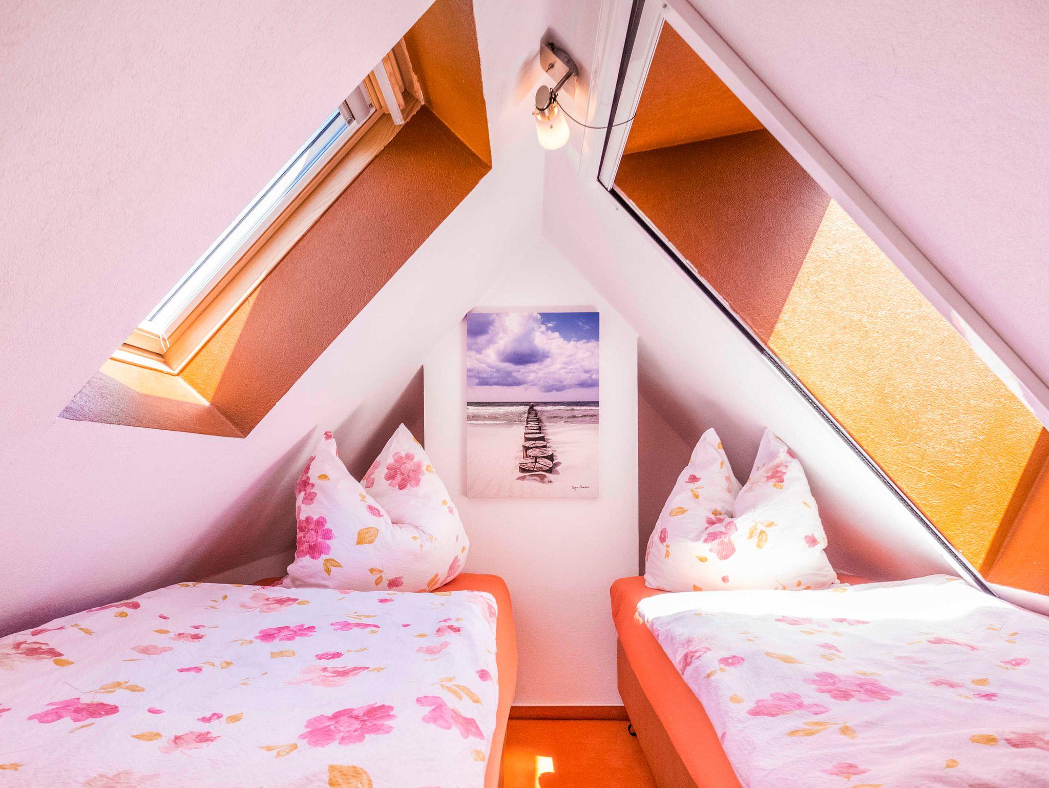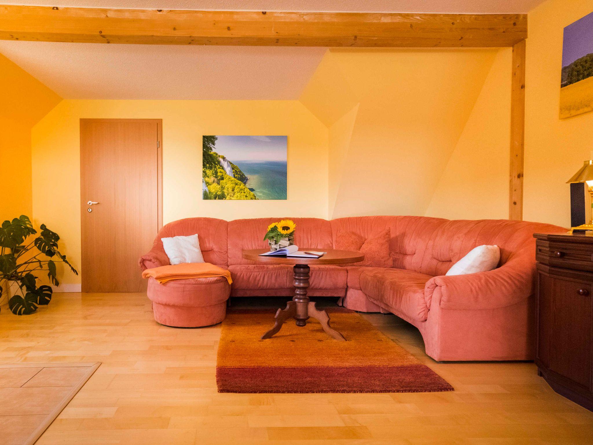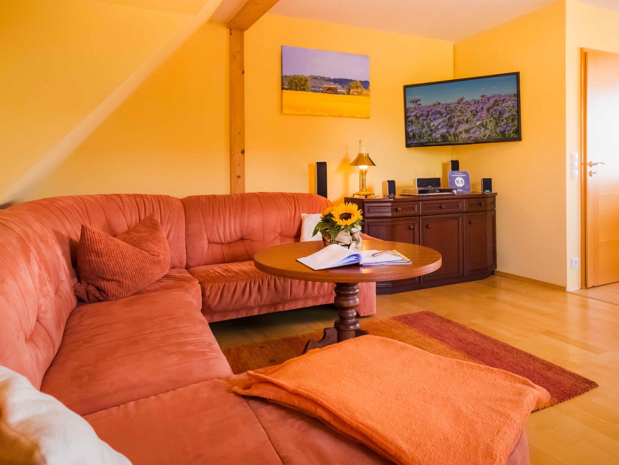 Eine großzügige Nichtraucher-Ferienwohnung befindet sich im Obergeschoss unseres Hauses und ist nur über eine Treppe erreichbar. Das Wohnzimmer ist mit Kaminofen und Parkettfußboden ausgestattet. Hier befinden sich eine große Eckcouch für kuschelige Kamin- und Fernsehabende. Zusätzlich befinden sich dahinter 2 Schlafsofas für je einen Erwachsenen. Das Bad hat eine Fußbodenheizung, Badewanne und Dusche. Es gibt ein kleines Ankleidezimmer mit großem Kleiderschrank, Schreibtisch und Sessel, durch welches Sie über eine Treppe auf den Dachboden gelangen. Hier geht es kuschelig zu. Dort befinden sich in niedriger Raumhöhe (ca. 1.75 m an höchster Stelle des Spitzdaches) ein Schlafzimmer mit Doppelbett sowie ein Schlafzimmer mit einem Kinderbett (Länge 1,30 m). Im Bett liegend können Sie durch die Dachfenster den Sternenhimmel bewundern.