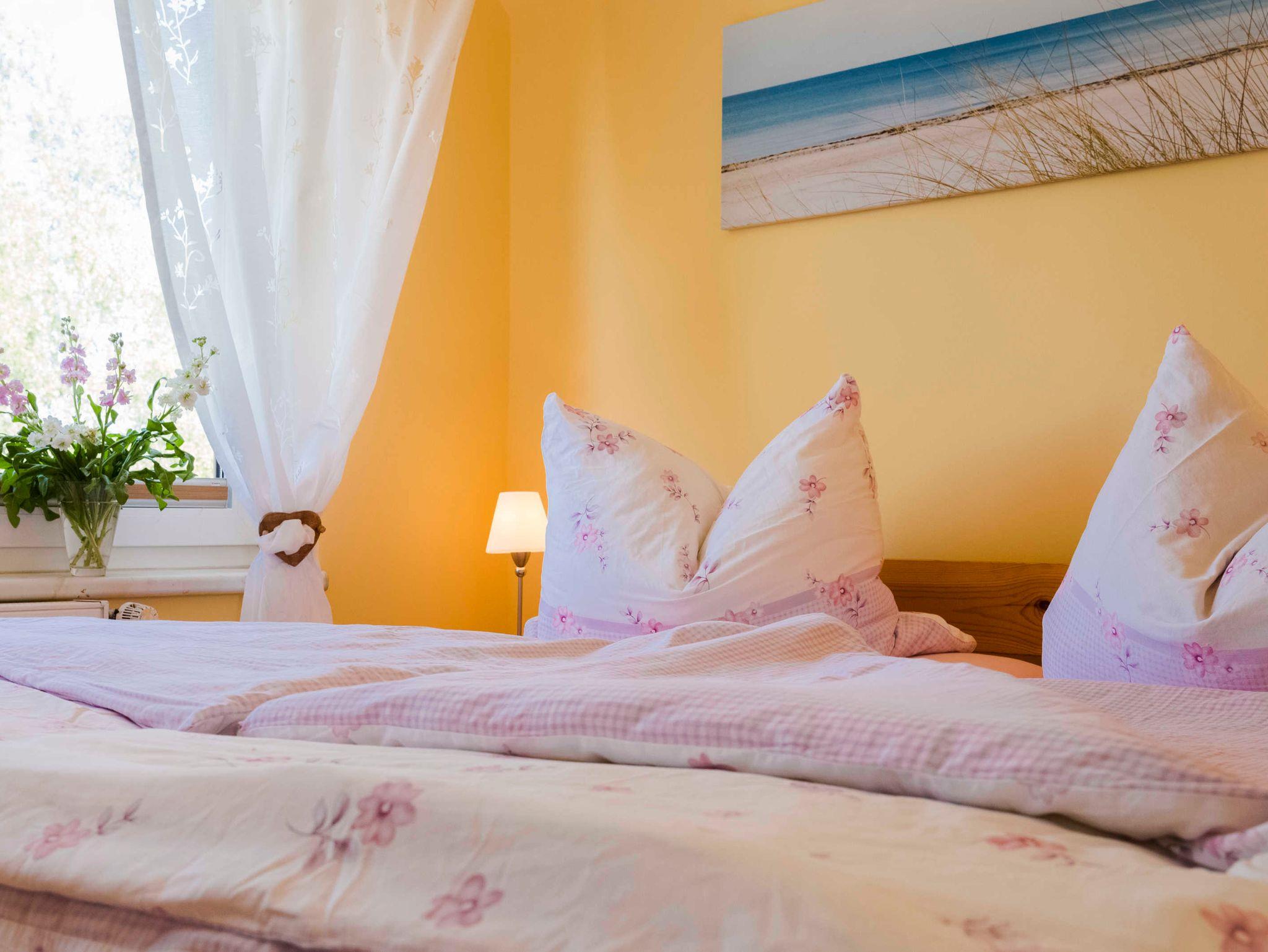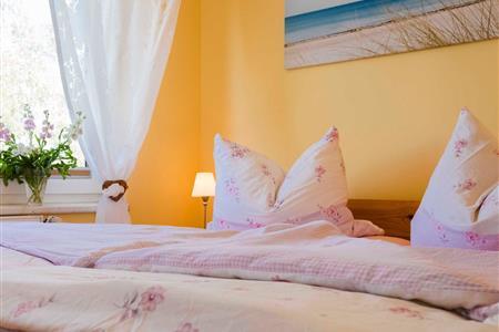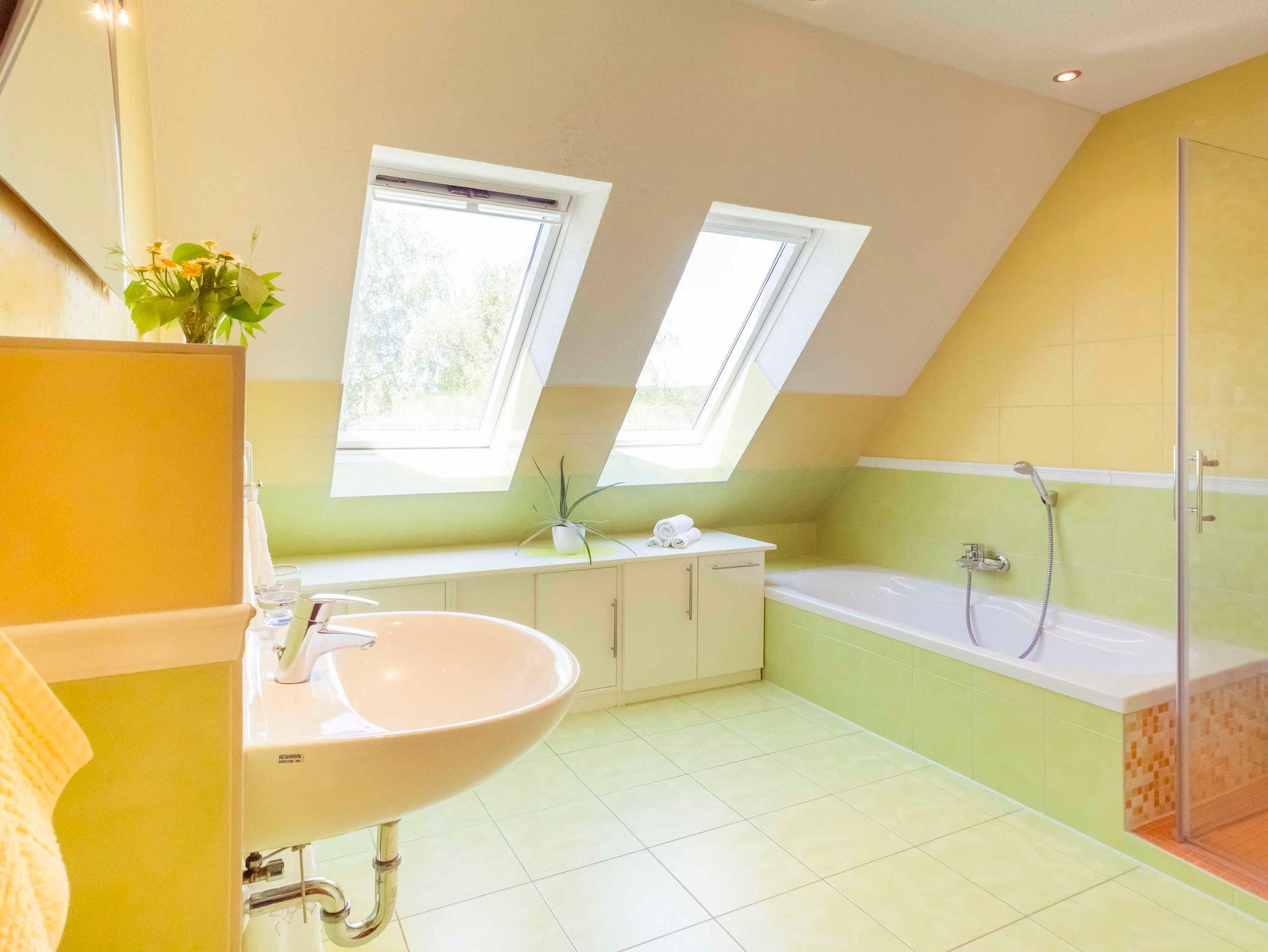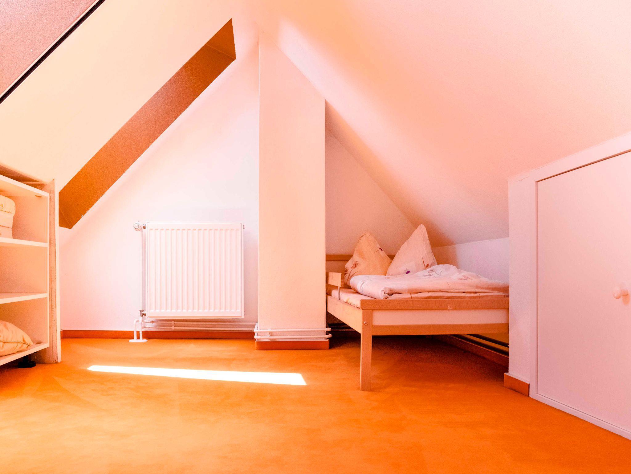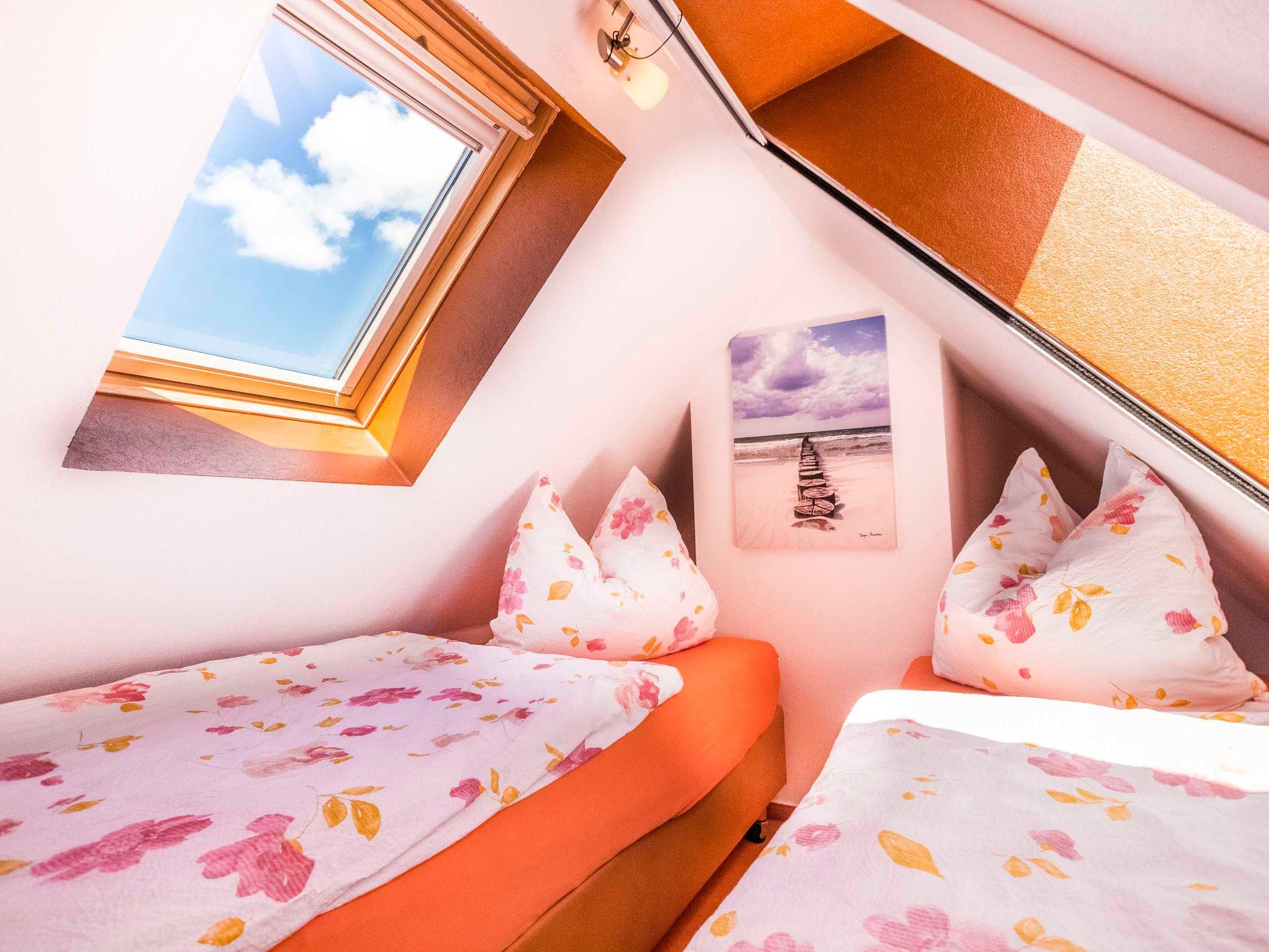 Eine großzügige Nichtraucher-Ferienwohnung befindet sich im Obergeschoss unseres Hauses und ist nur über eine Treppe erreichbar. Das Wohnzimmer ist mit Kaminofen und Parkettfußboden ausgestattet. Hier befinden sich eine große Eckcouch für kuschelige Kamin- und Fernsehabende. Zusätzlich befinden sich dahinter 2 Schlafsofas für je einen Erwachsenen. Das Bad hat eine Fußbodenheizung, Badewanne und Dusche. Es gibt ein kleines Ankleidezimmer mit großem Kleiderschrank, Schreibtisch und Sessel, durch welches Sie über eine Treppe auf den Dachboden gelangen. Hier geht es kuschelig zu. Dort befinden sich in niedriger Raumhöhe (ca. 1.75 m an höchster Stelle des Spitzdaches) ein Schlafzimmer mit Doppelbett sowie ein Schlafzimmer mit einem Kinderbett (Länge 1,30 m). Im Bett liegend können Sie durch die Dachfenster den Sternenhimmel bewundern.