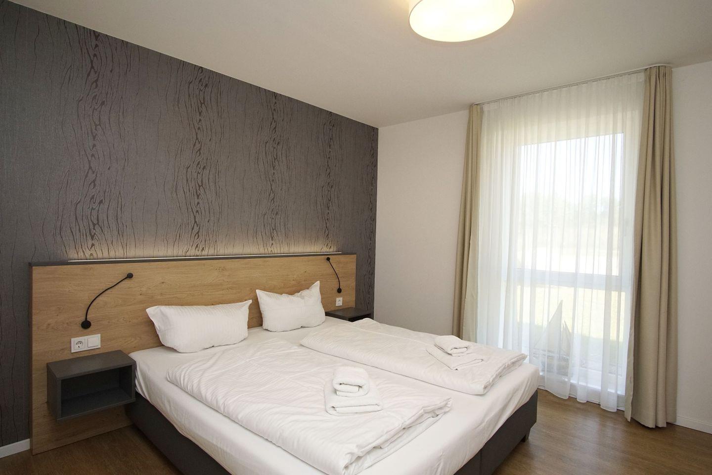 SCHLAFEN // ein Schlafzimmer mit bequemem Doppelbett, Couch mit Schaffunktion im Wohnzimmer ++