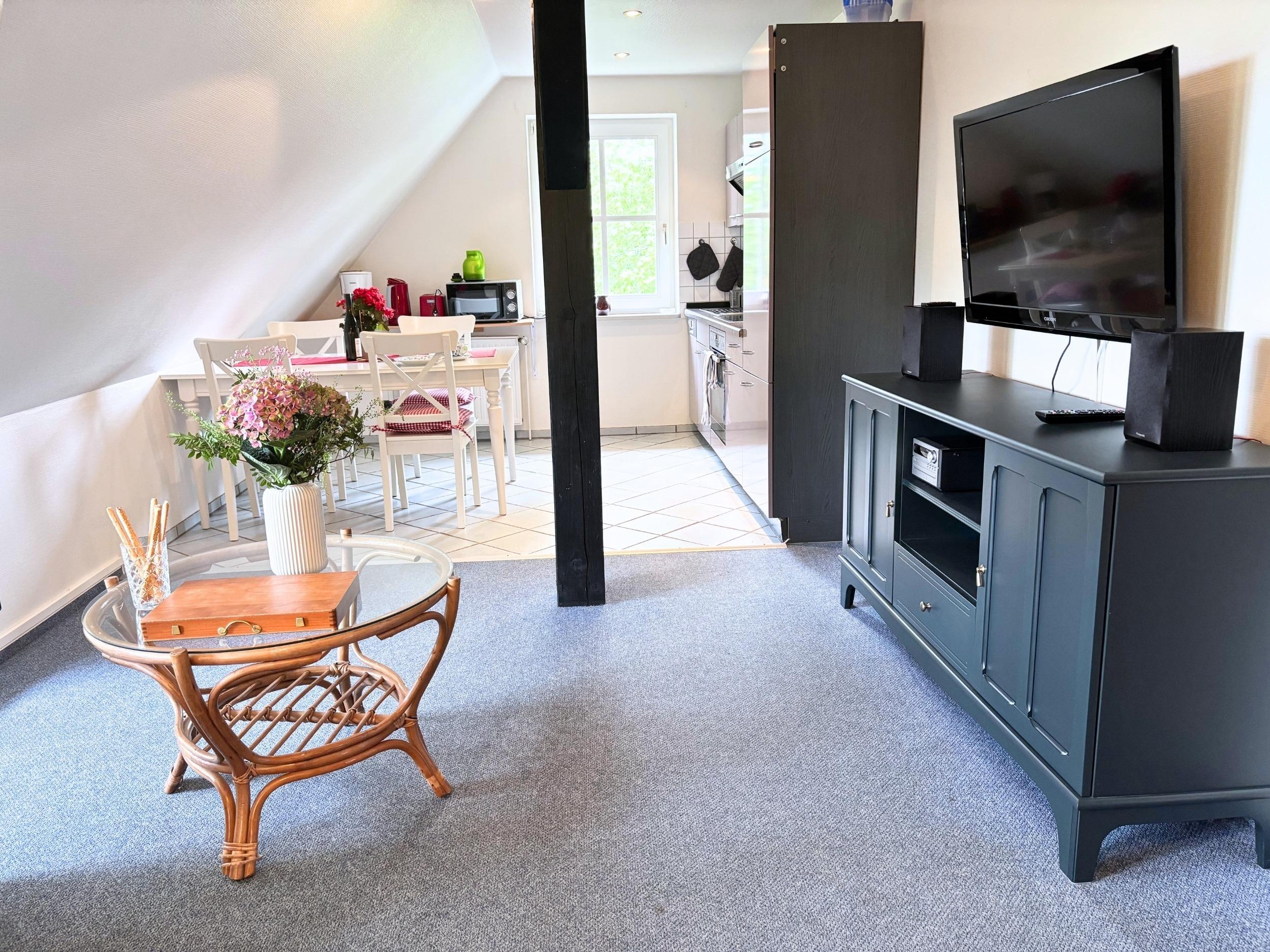 Karl Sonnenstrahl befindet sich im rechten Obergeschoss des Hauses am Teich. Die schöne Ferienwohnung mit Balkon ist für vier Personen ausgestattet und hat zwei Schlafzimmer - einer davon ist über eine weitere Treppe erreichbar. Der Balkon geht von der Wohnküche ab und ist gen Westen gerichtet. Hier können Sie die Abendsonne einfangen.