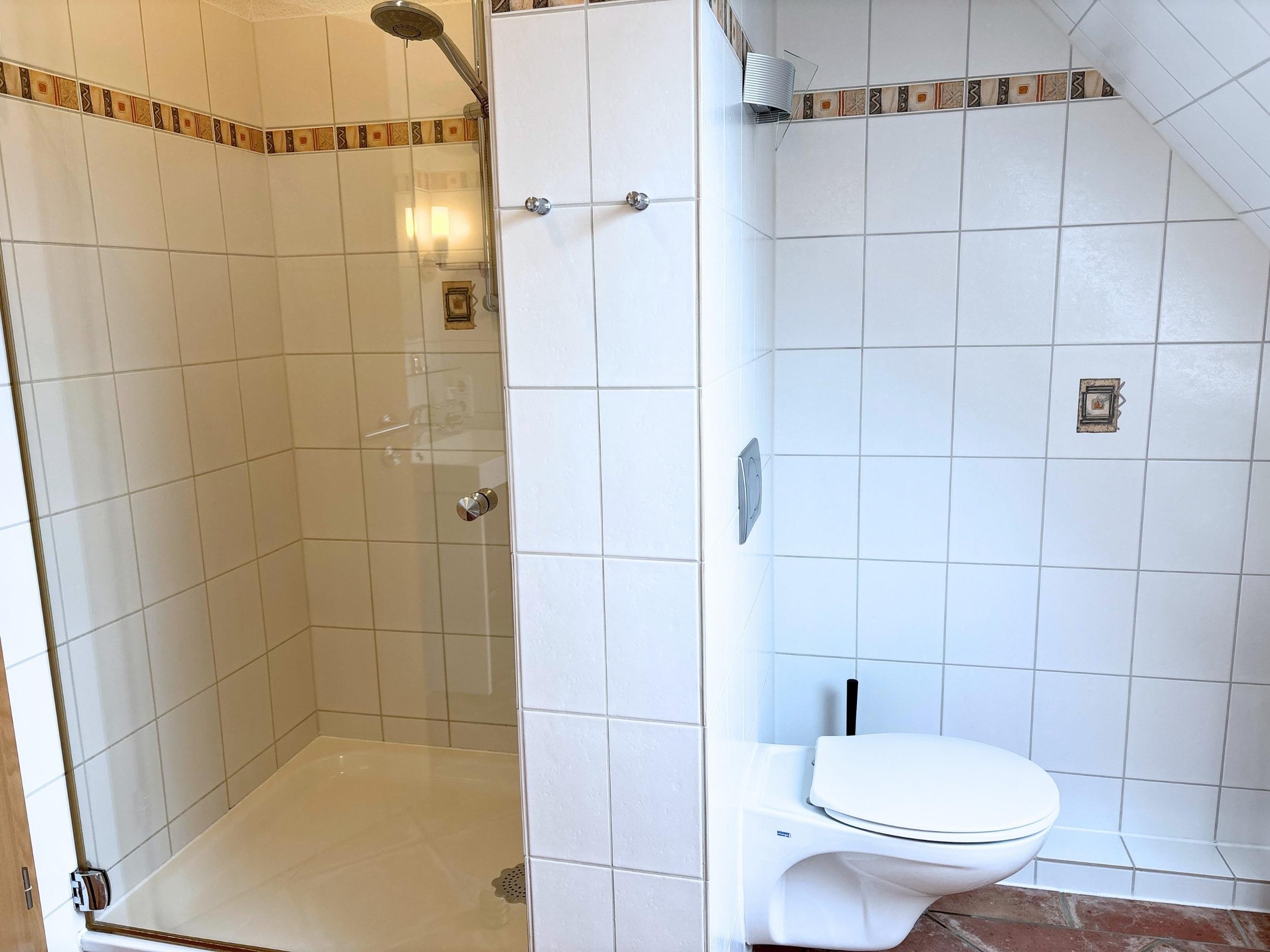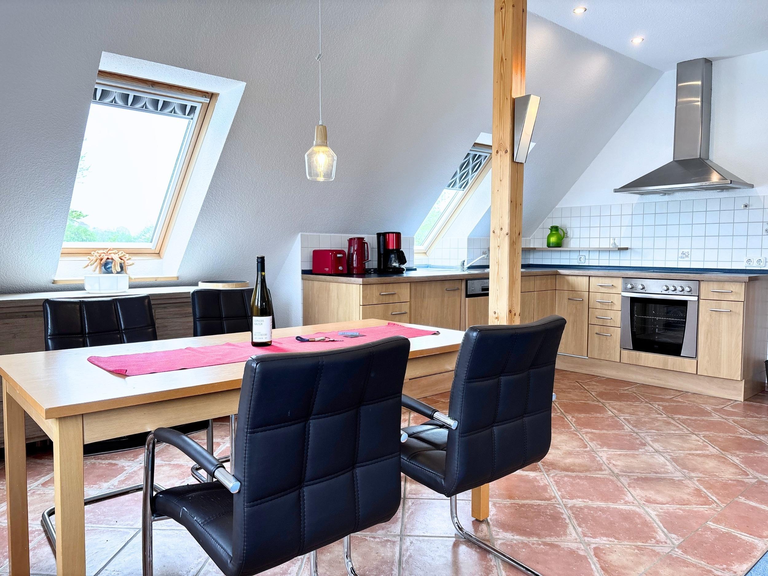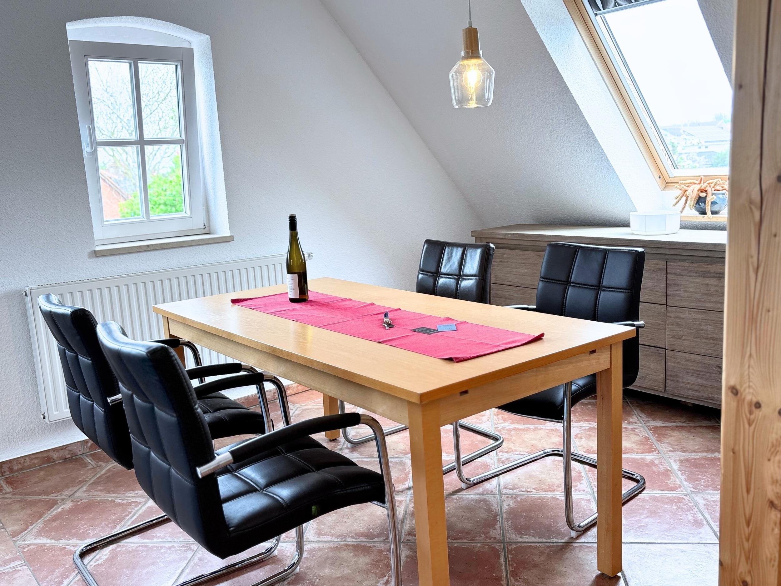 Das Loft – unsere Luise von der Wiese befindet sich im Obergeschoss der Hofscheune. Die Ferienwohnung ist für bis zu 3 Personen ausgelegt. Besonders einladend ist hier die großzügige Wohnküche – ein heller Raum mit Sofalandschaft. Es gibt ein Schlafzimmer (Einzelbett und Doppelbett), das über eine kleine Treppe erreichbar sind. Das Badezimmer mit Dusche und Badewanne hat ein Fenster zur Nordseite.
