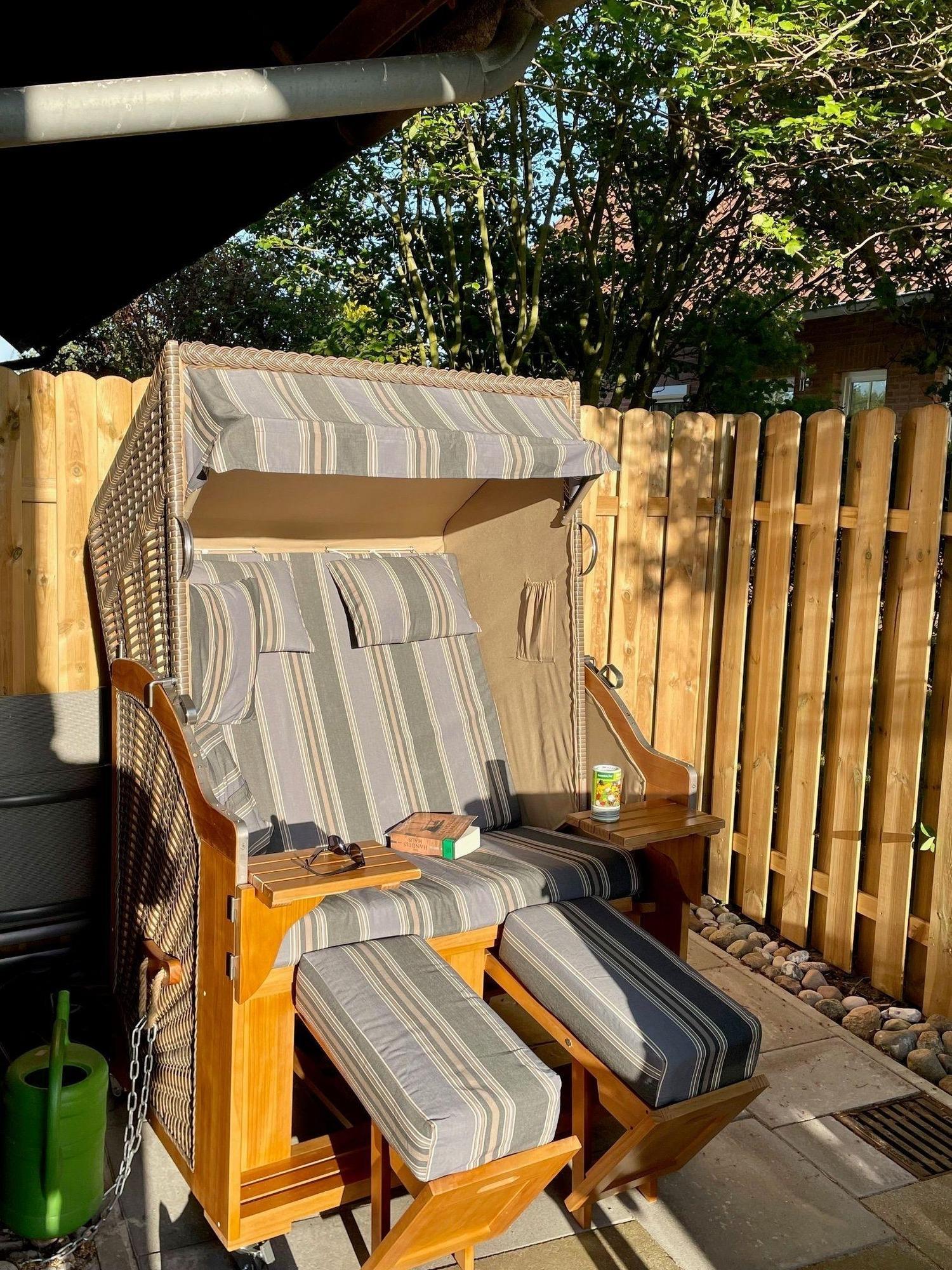 Die Südwest-Terrasse ist mit Strandkorb und Gartenmöbeln ausgestattet. Sitzauflagen befinden sich im Haus, Grill im Carport-Abstellraum, in dem auch mitgebrachte Fahrräder eingeschlossen werden können. Der zwischen Terrasse und Carport liegende Gartenanteil eignet sich als Spielzone für Kleinkinder.