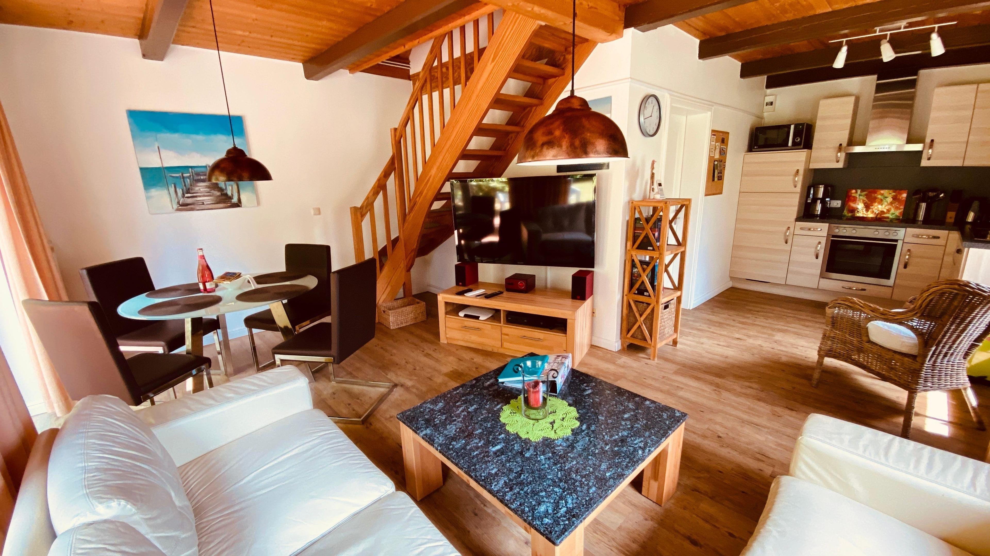 Das Ferienhaus ist hell und komfortabel eingerichtet. Im Wohnzimmer gibt es einen HD-Fernseher mit komplett freigeschaltetem Sky-Programm,XBox One, Blu-Ray Player und Stereoanlage. Die Küche ist zum Wohnzimmer hin offen und verfügt über eine komplette Ausstattung. Im oberen Bereich des Hauses befinden sich zwei Schlafzimmer, mit Doppelbett bzw. zwei Einzelbetten.