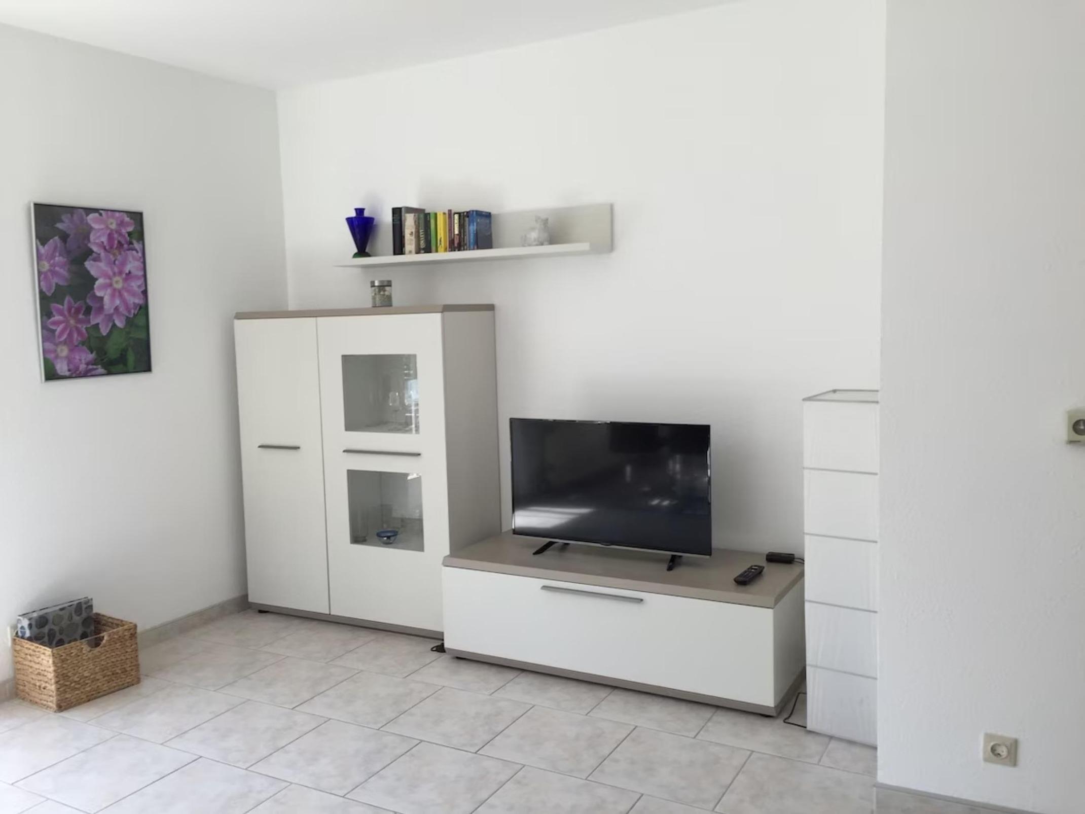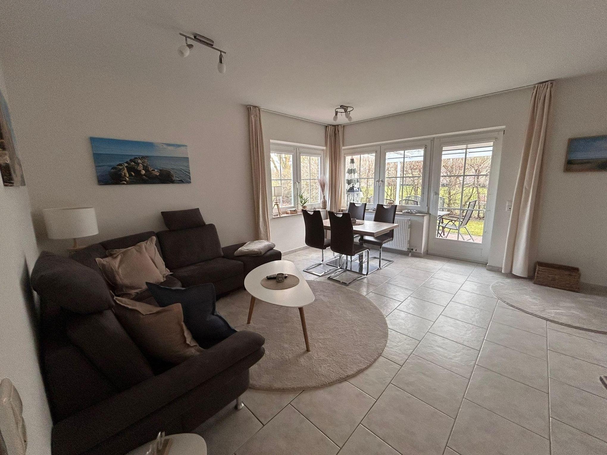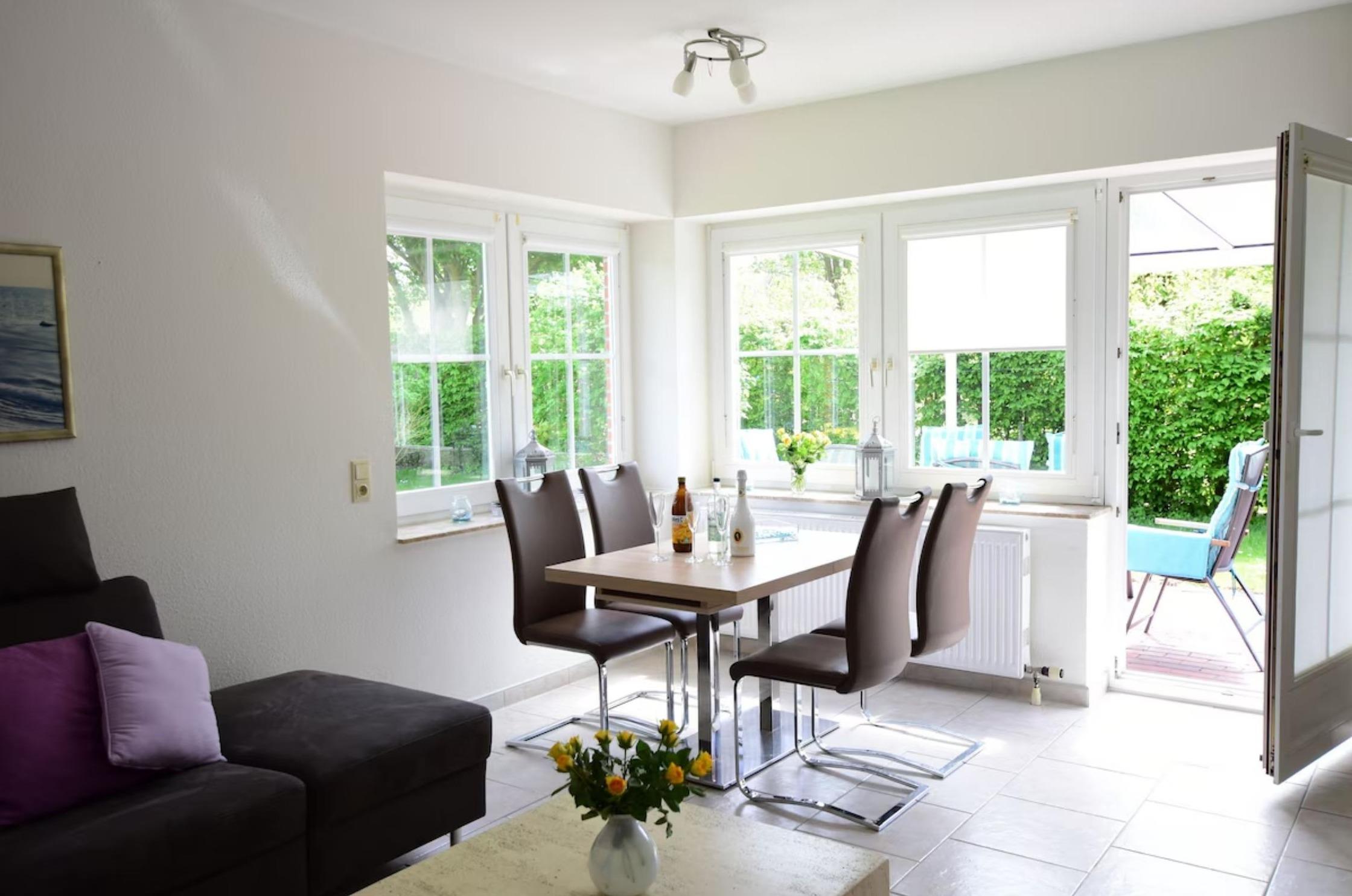 - helles Wohnzimmer mit Sitzecke, TV, Essbereich und Zugang zum Garten