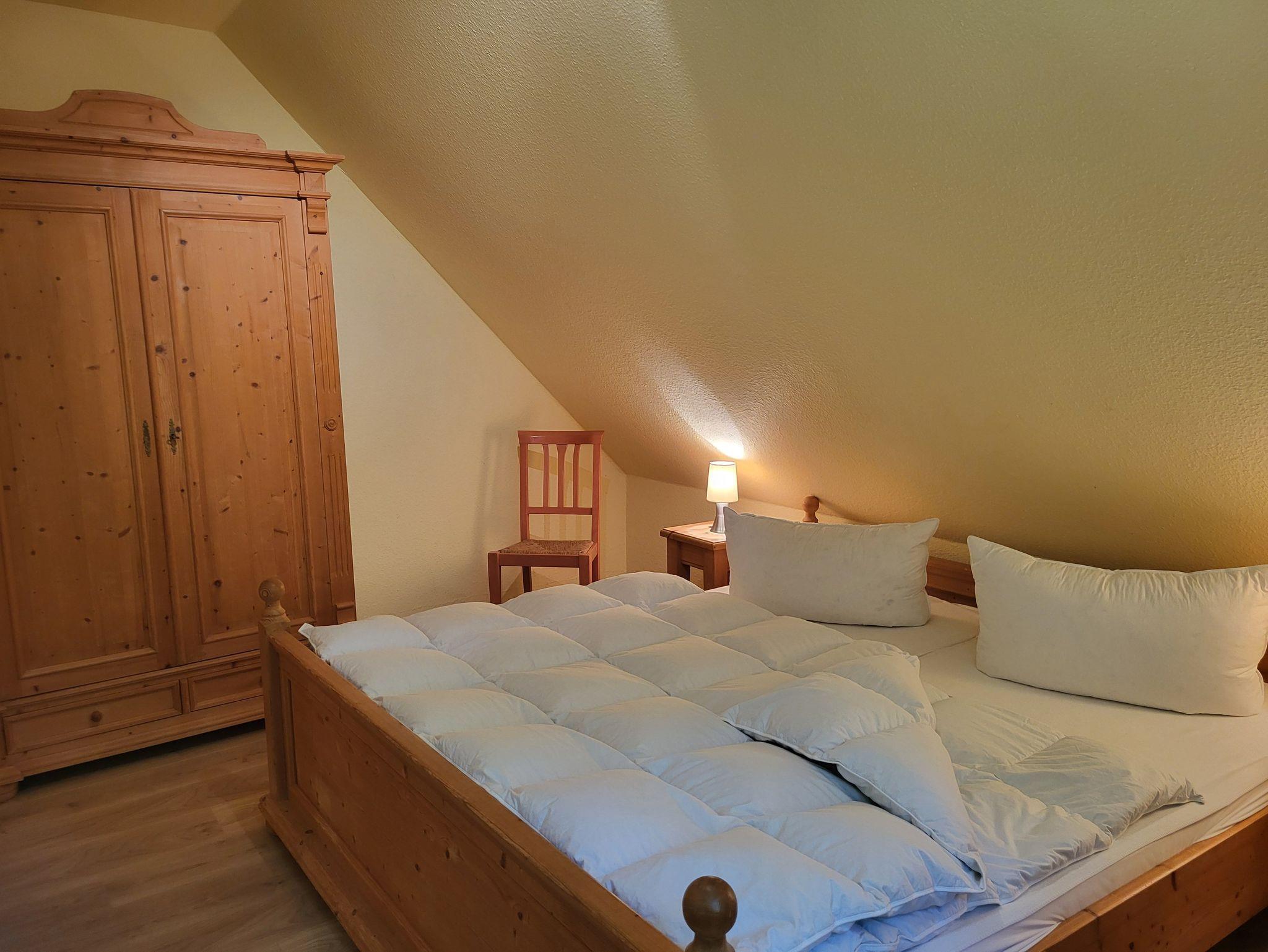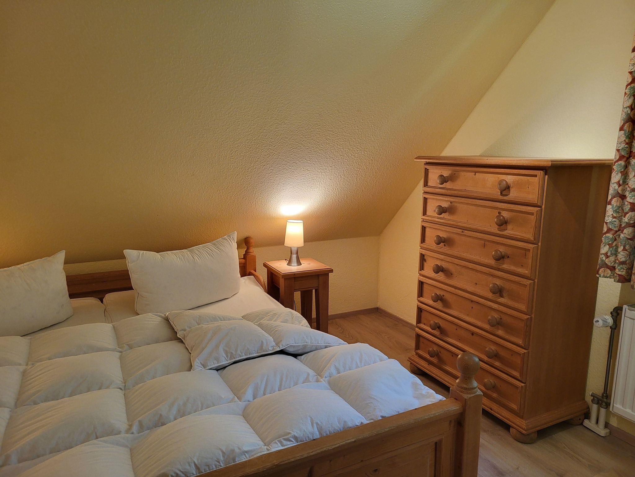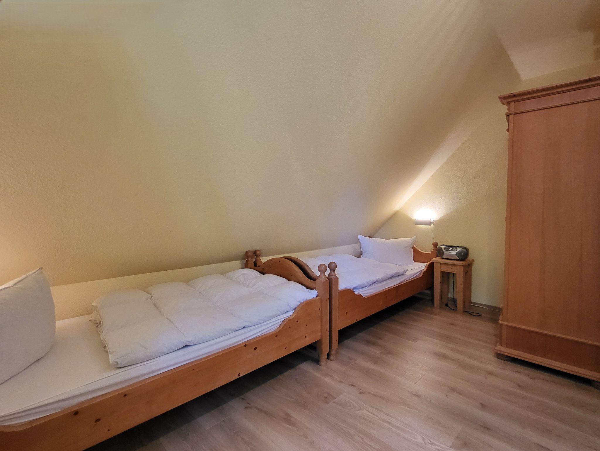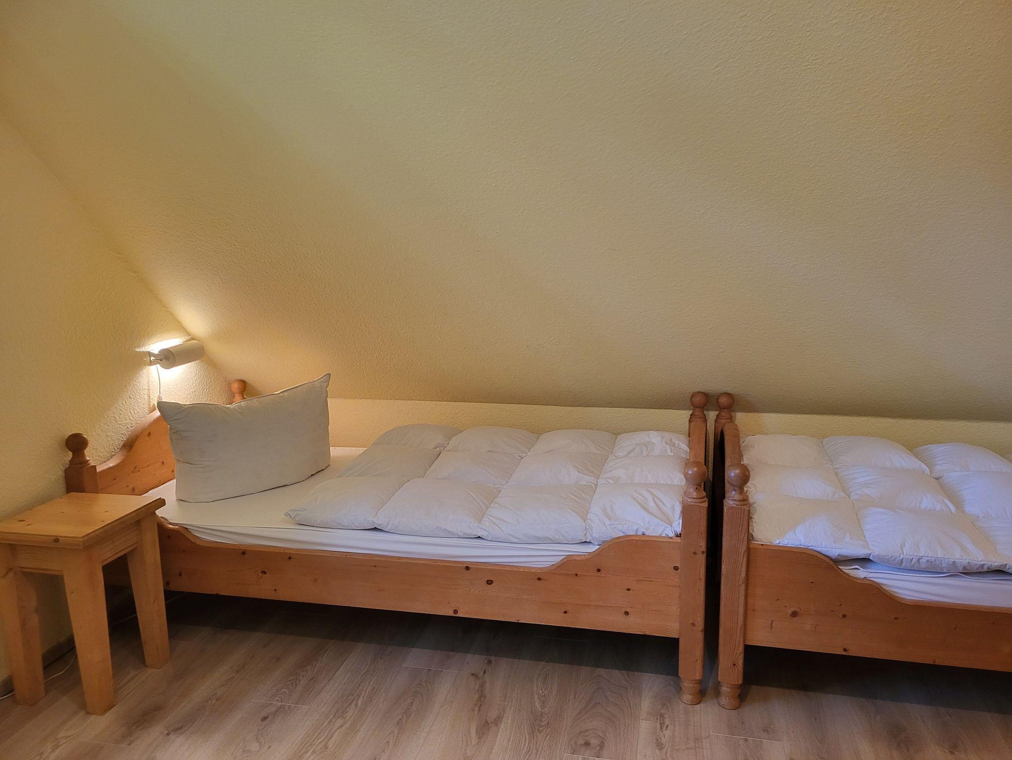Im Obergeschoss befinden sich 2 Schlafzimmer und ein Gäste- WC. Das 1. Schlafzimmer ist ausgestattet mit einem Doppelbett 1,80 x 2,00 m (getrennte Matratzen) und das 2. Schlafzimmer mit zwei Einzelbetten, jeweils 0,90 x 2,00 m. Die Bettwäsche und die Handtücher sind nicht inklusive, können aber über die Zimmervermittlung dazu gebucht werden ( Bettwäsche 12,50 € und Handtücher 7,00 € (1 Badetuch, 1 Handtuch). Beide Schlafzimmer sind mit Mückenschutz ausgestattet.