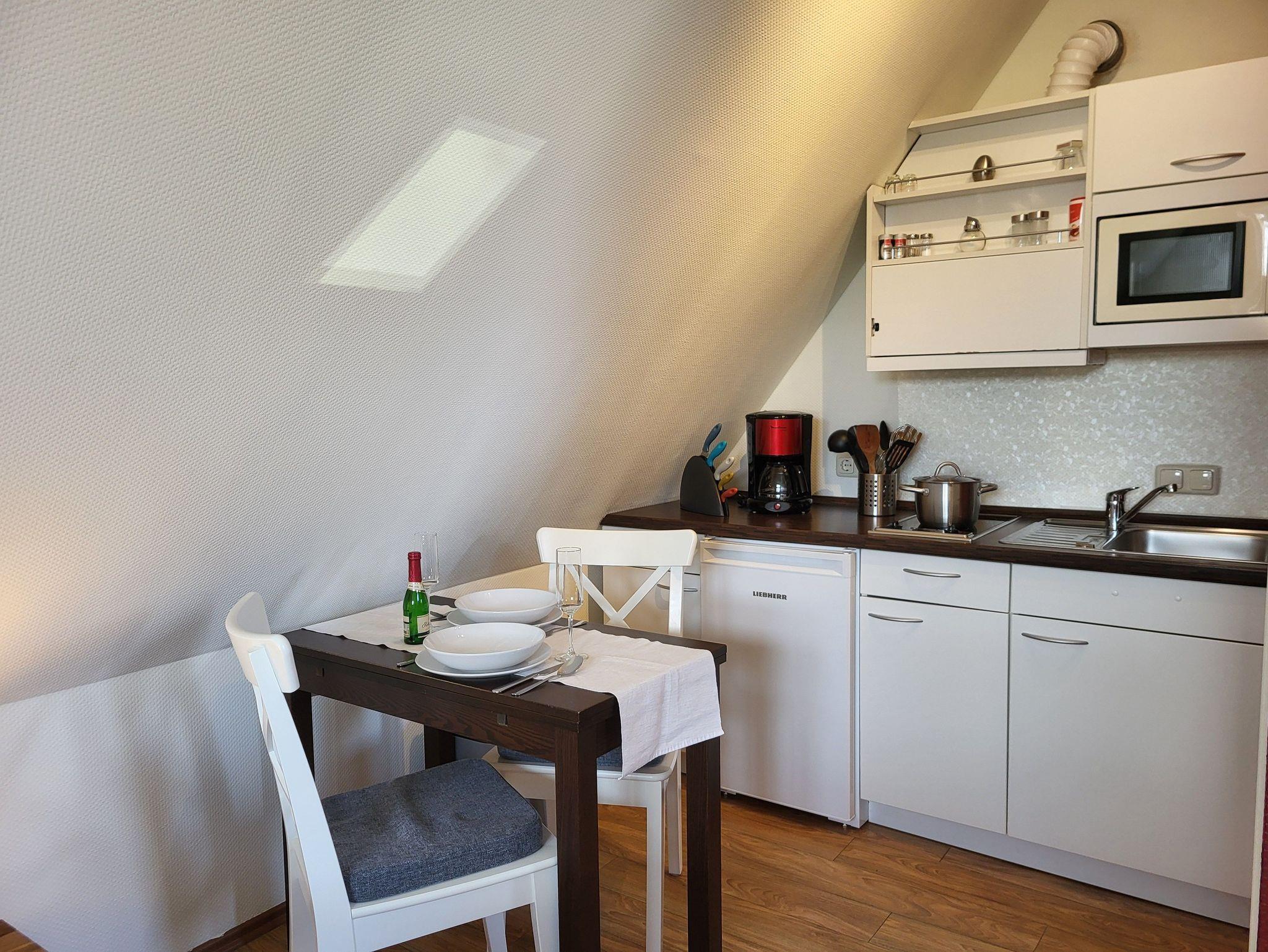 das kleine und gemütliche Appartement Bianca im Obergeschoss erreichen Sie über eine Aussentreppe, und liegt in der Nähe der Ostsee- Kurklinik. Die Terrasse befindet sich unten und ist mit einem Sitzplatz ausgestattet. Den feinsandigen Strand erreichen Sie in ca. 250 m. Ein Parkplatz zum Appartement befindet sich direkt auf dem Grundstück.Der Wohn- Schlafraum ist mit einem Doppelbett 1,80 x 2,00 m (getrennte Matratzen), einer kleinen Sitzgruppe und mit SAT- TV ausgestattet. Die kleine Küchenzeile mit Mikrowelle, bietet mit dem kleinen Essplatz Raum für 2 Personen.Das Bad ist ausgestattet mit einer Dusche. Das Appartement wird mit Bettwäsche übergeben, Handtücher können in der Zimmervermittlung für 7,00 € pro Person hinzugebucht werden (1 Badetuch, 1 Handtuch).