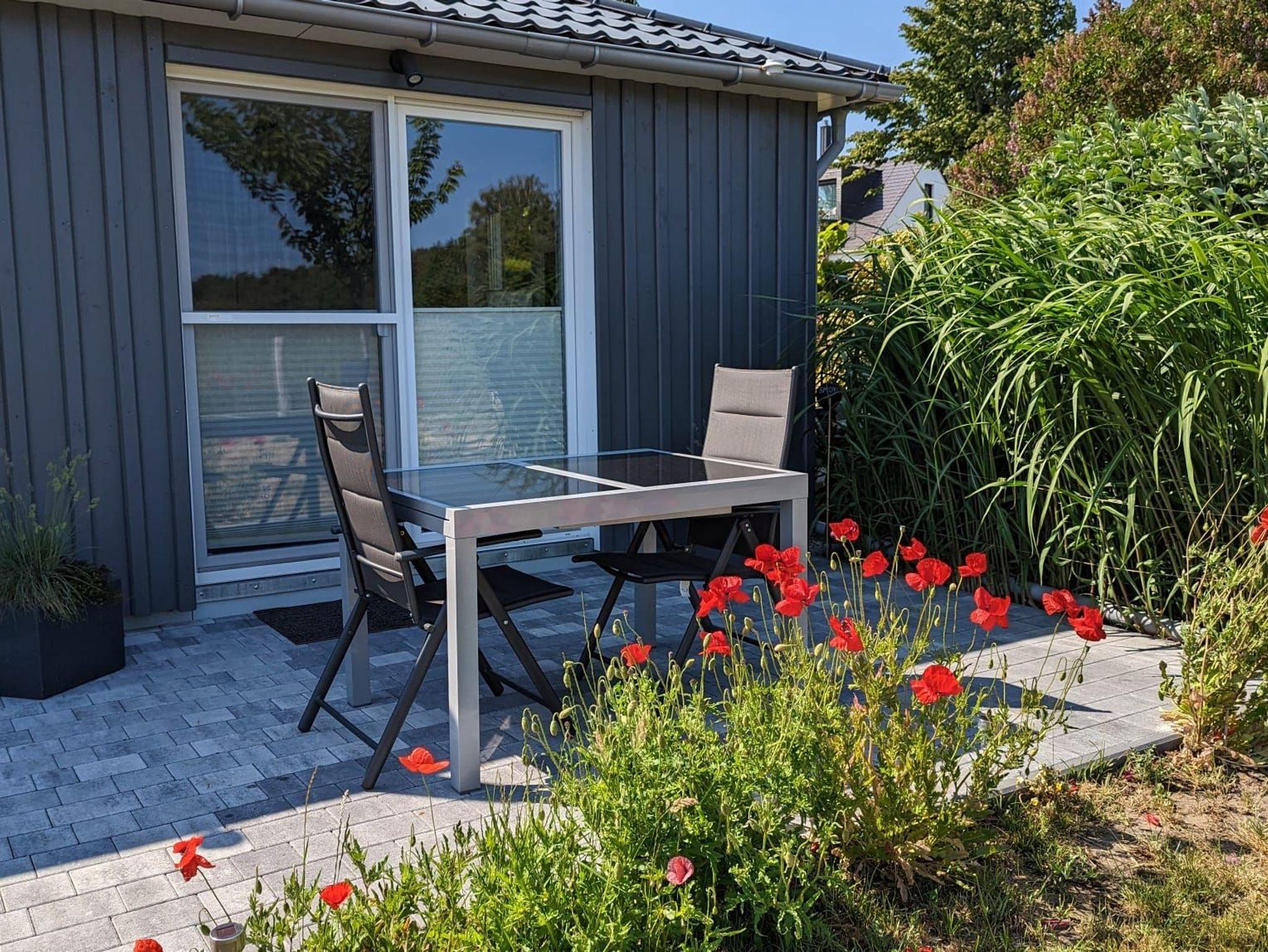 Neues Ferienhaus in Wustrow mit Blick zum Bodden, Terrasse und moderner Ausstattung für erholsamen Urlaub.