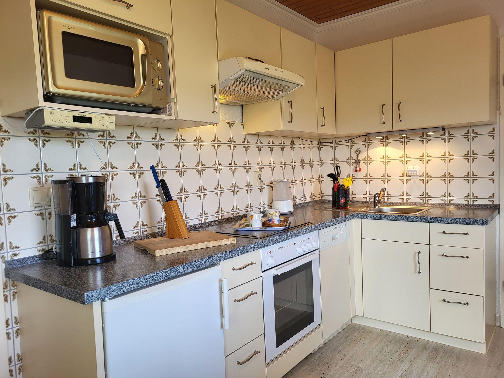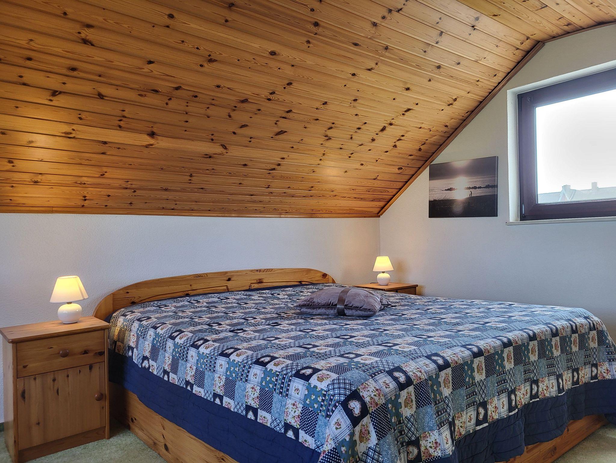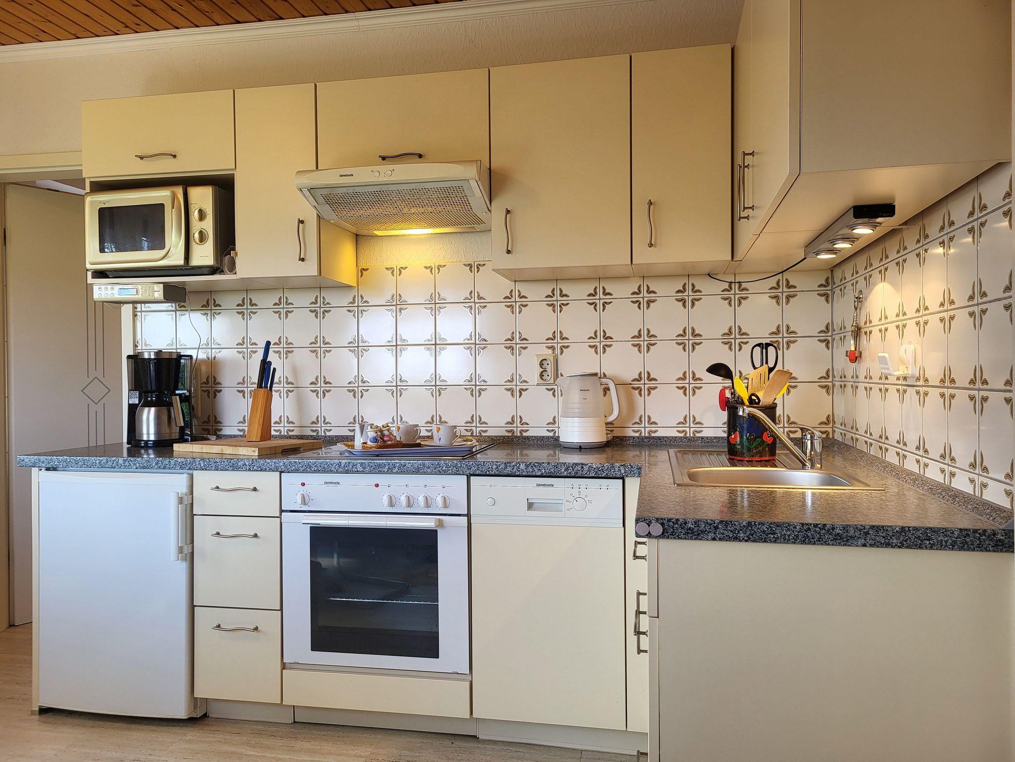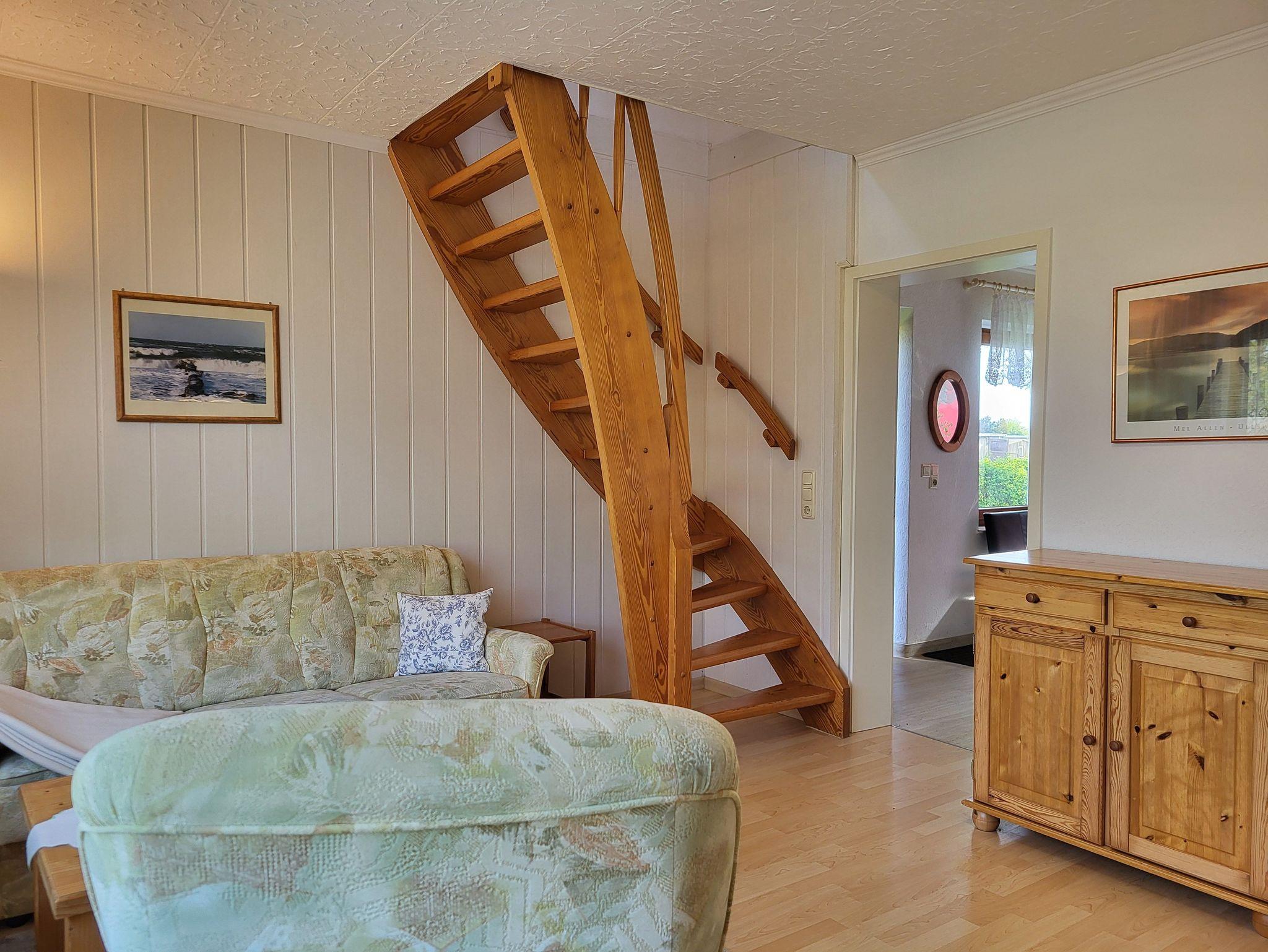 Im Erdgeschoss liegt das Wohnzimmer mit TV und Radio, ein Schlafraum mit Doppelbett 1,80 x 2,00 m (getrennte Matratzen) und die Küche mit Geschirrspüler, Spüle, E-Herd (Ceranfeld, 4 Kochplatten, Backofen) Kühlschrank mit Tiefkühlfach, Wasserkocher, Toaster, Kaffeemaschine, Mikrowelle und Essecke.Das Bad ist ausgestattet mit Dusche und WC. Im Obergeschoss finden Sie die offene Schlafgalerie mit einem Doppelbett 1,80 x 2,00 m (getrennte Matratzen). Die Bettwäsche ist inclusive, Handtücher können in der Zimmervermittlung für 7,00 € pro Person (1 Badetuch, 1 Handtuch) dazugebucht werden.