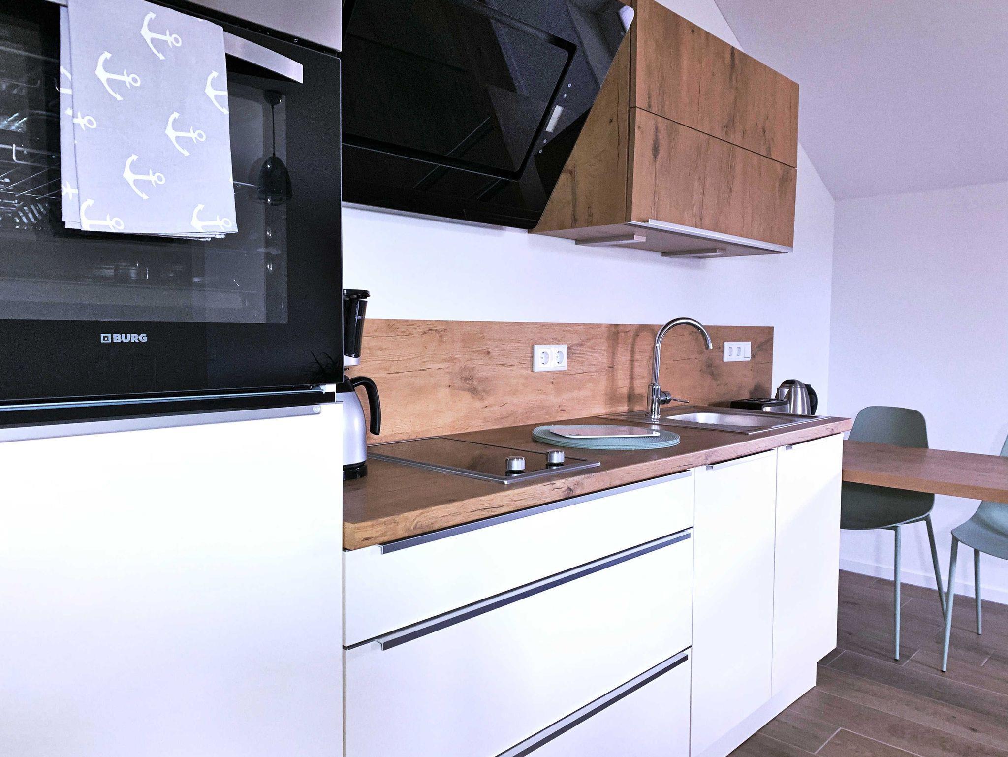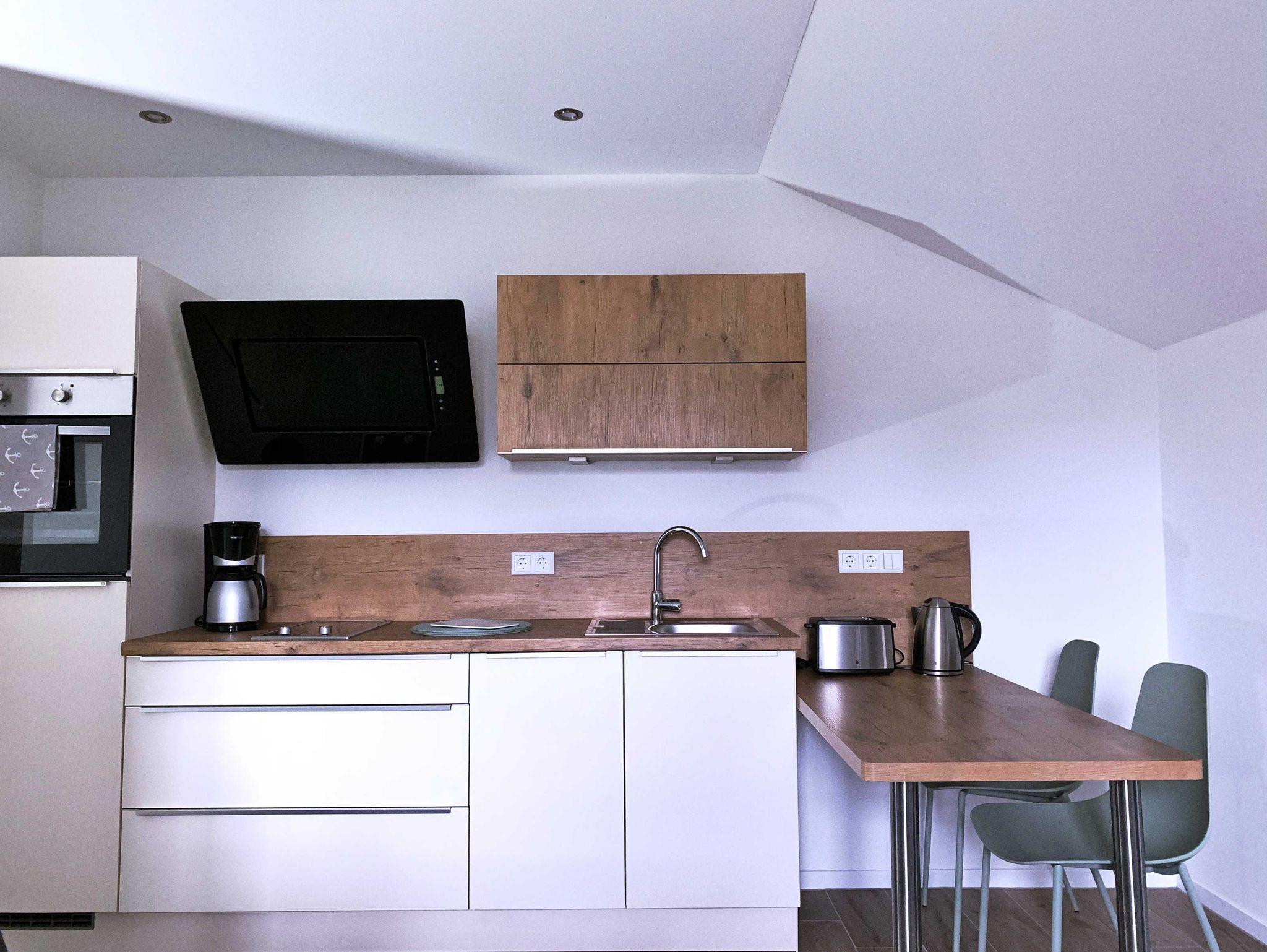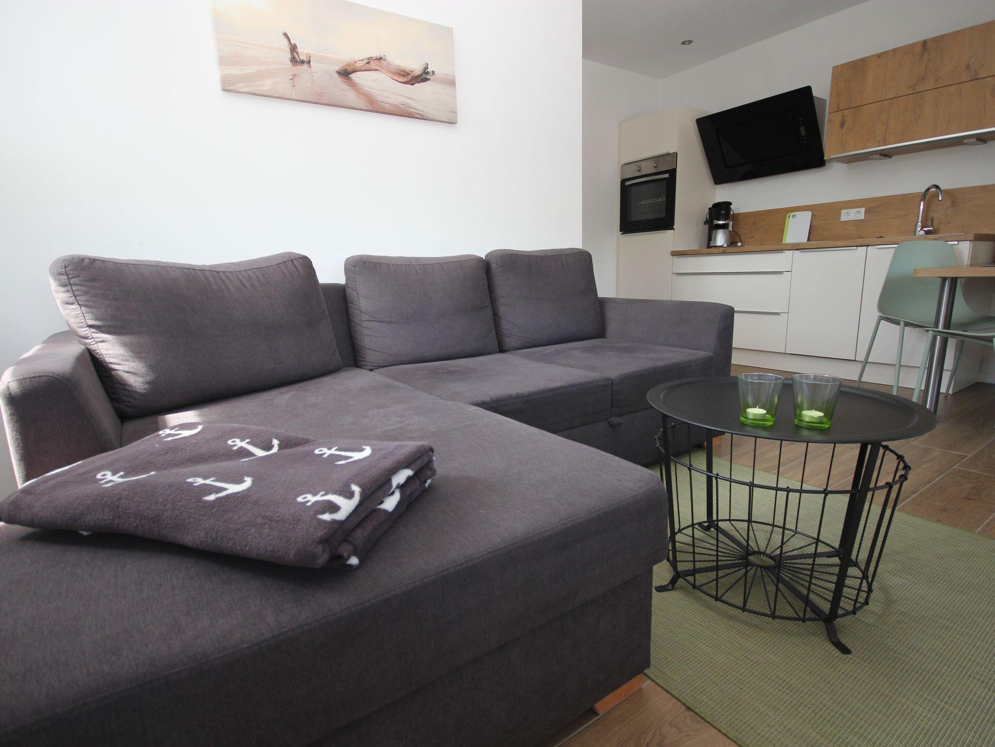 Die offene Wohnküche wurde mit SAT-TV, kostenlosem WLAN-Gastzugang, einer Küchenzeile und einer Schlafcouch ausgestattet.