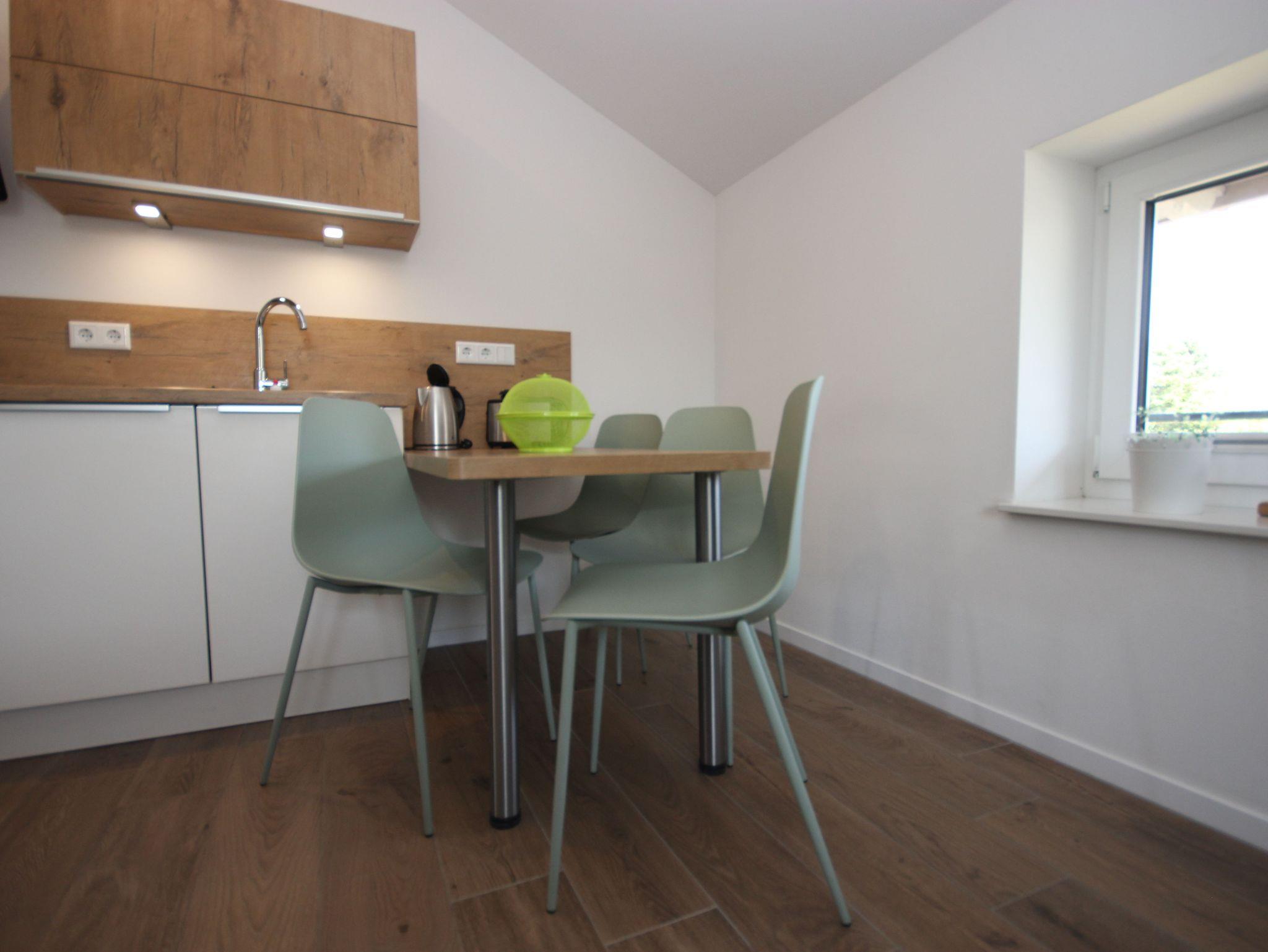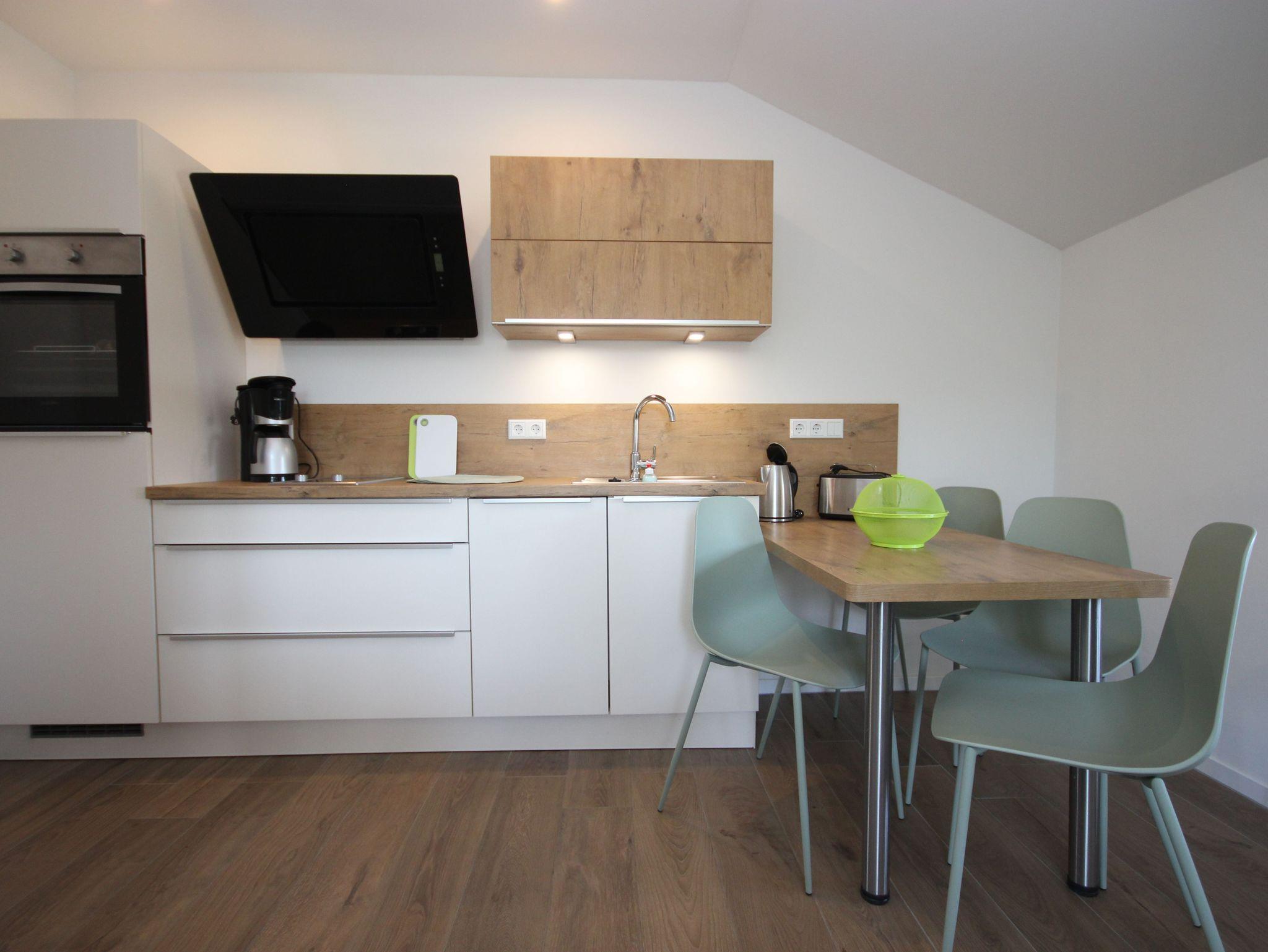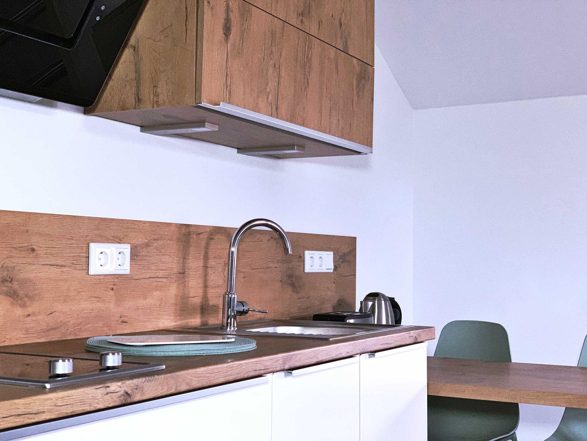 Die offene Wohnküche wurde mit SAT-TV, kostenlosem WLAN-Gastzugang, einer Küchenzeile und einer Schlafcouch ausgestattet.