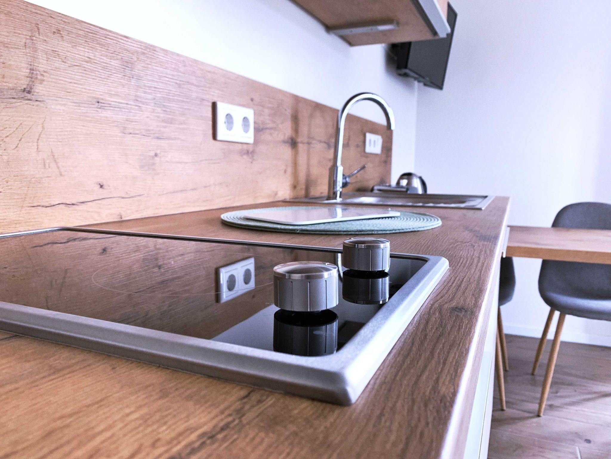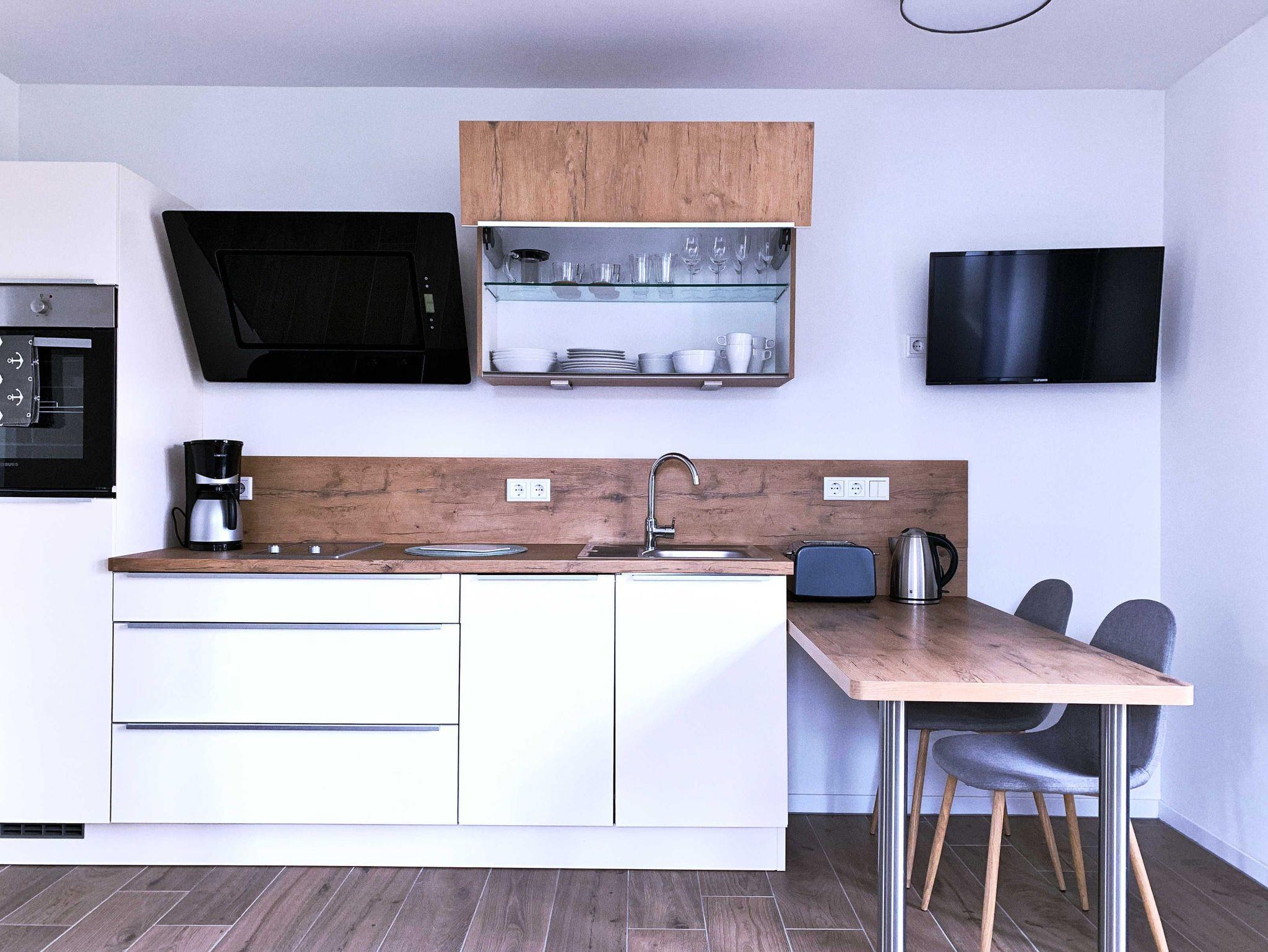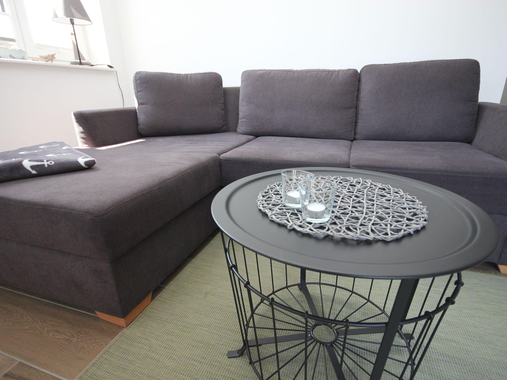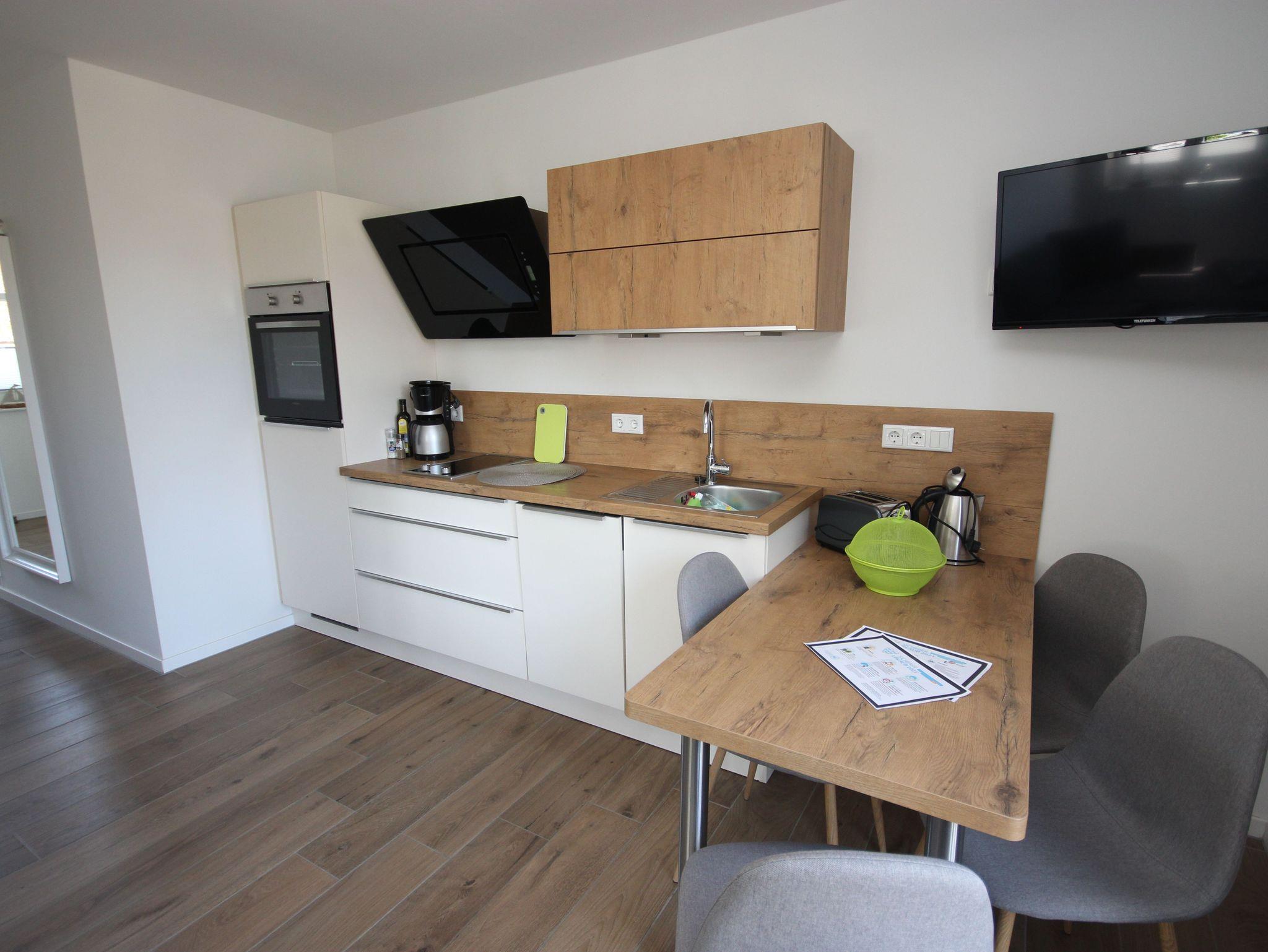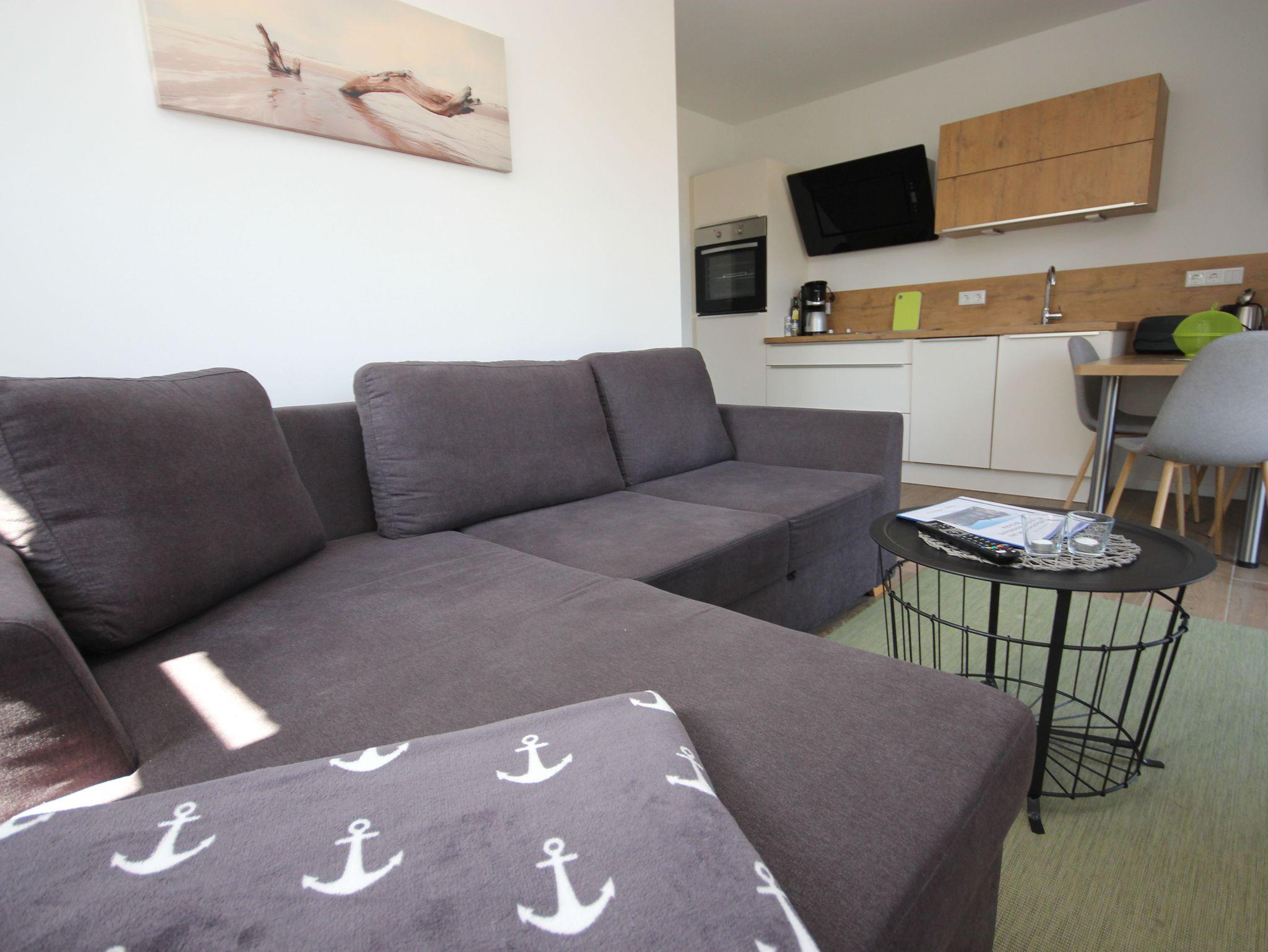 Die offene Wohnküche wurde mit SAT-TV, kostenlosem WLAN-Gastzugang, einer Küchenzeile und einer Schlafcouch ausgestattet.