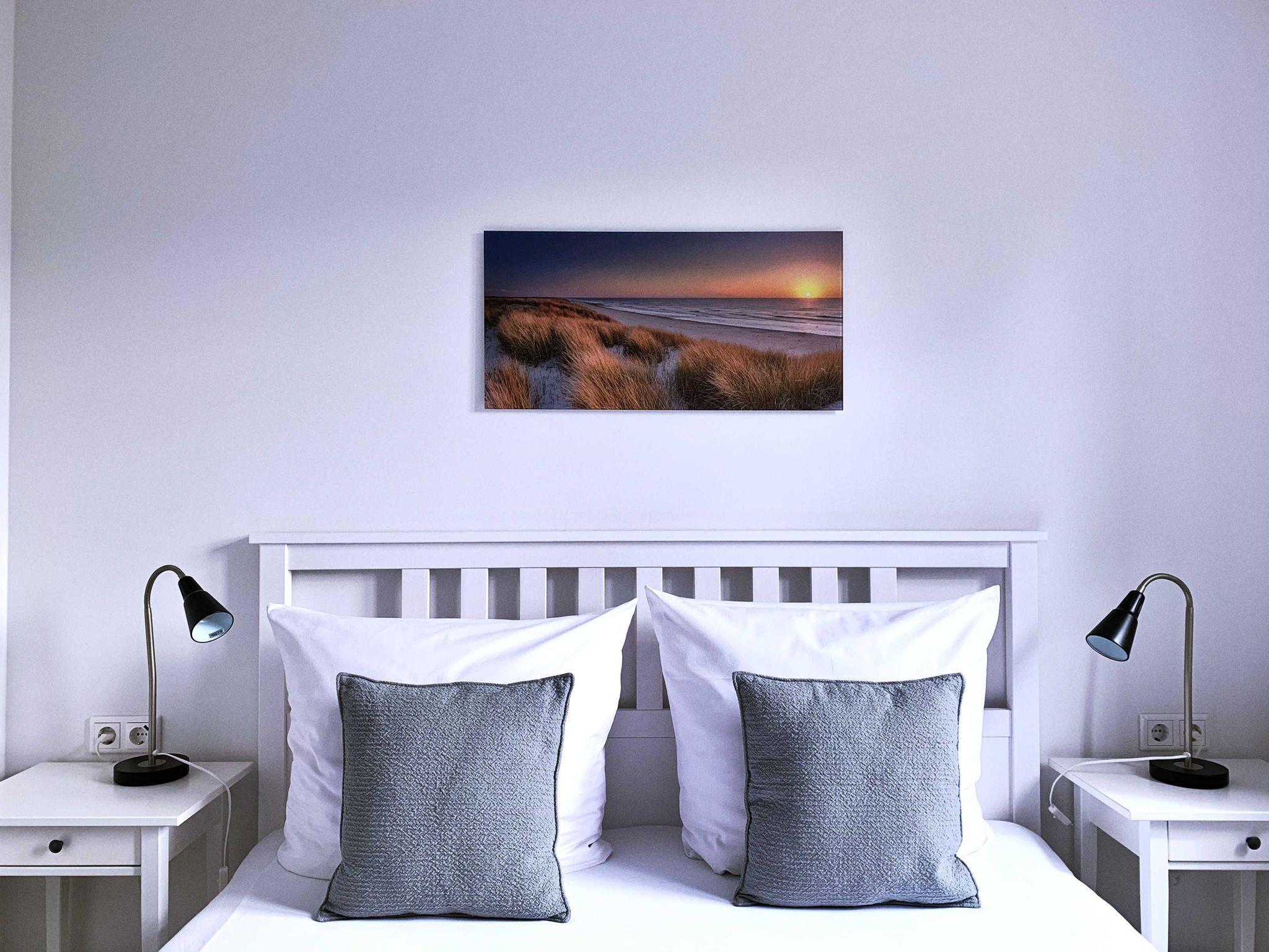 Der Schlafraum besitzt ein Doppelbett (1,60 x 2,00 m) mit getrennten Matratzen und einem Topper sowie einem Kleiderschrank mit genügend Stauraum. Bei Bedarf kann dort ein Kinderreisebett aufgestellt werden.