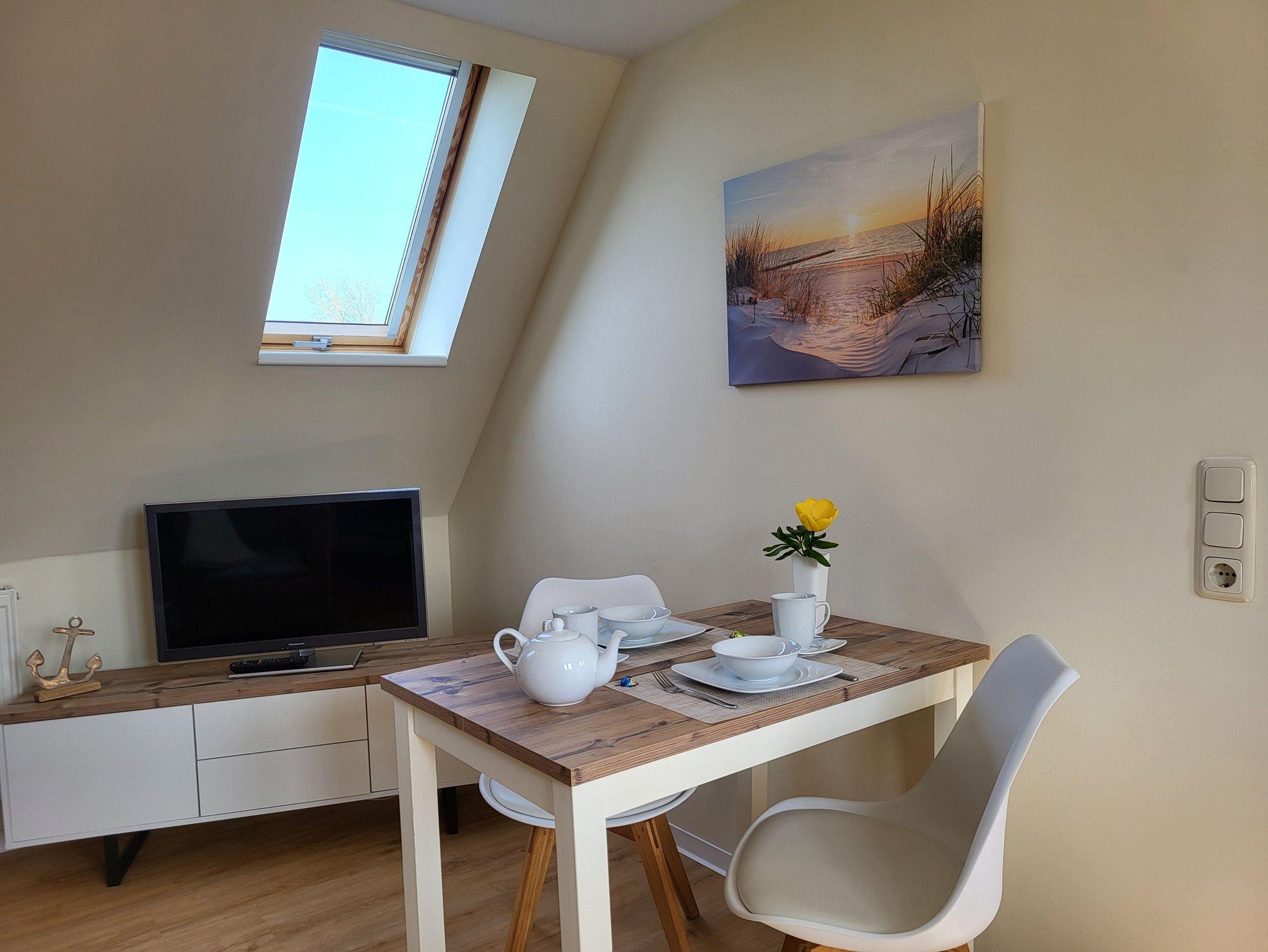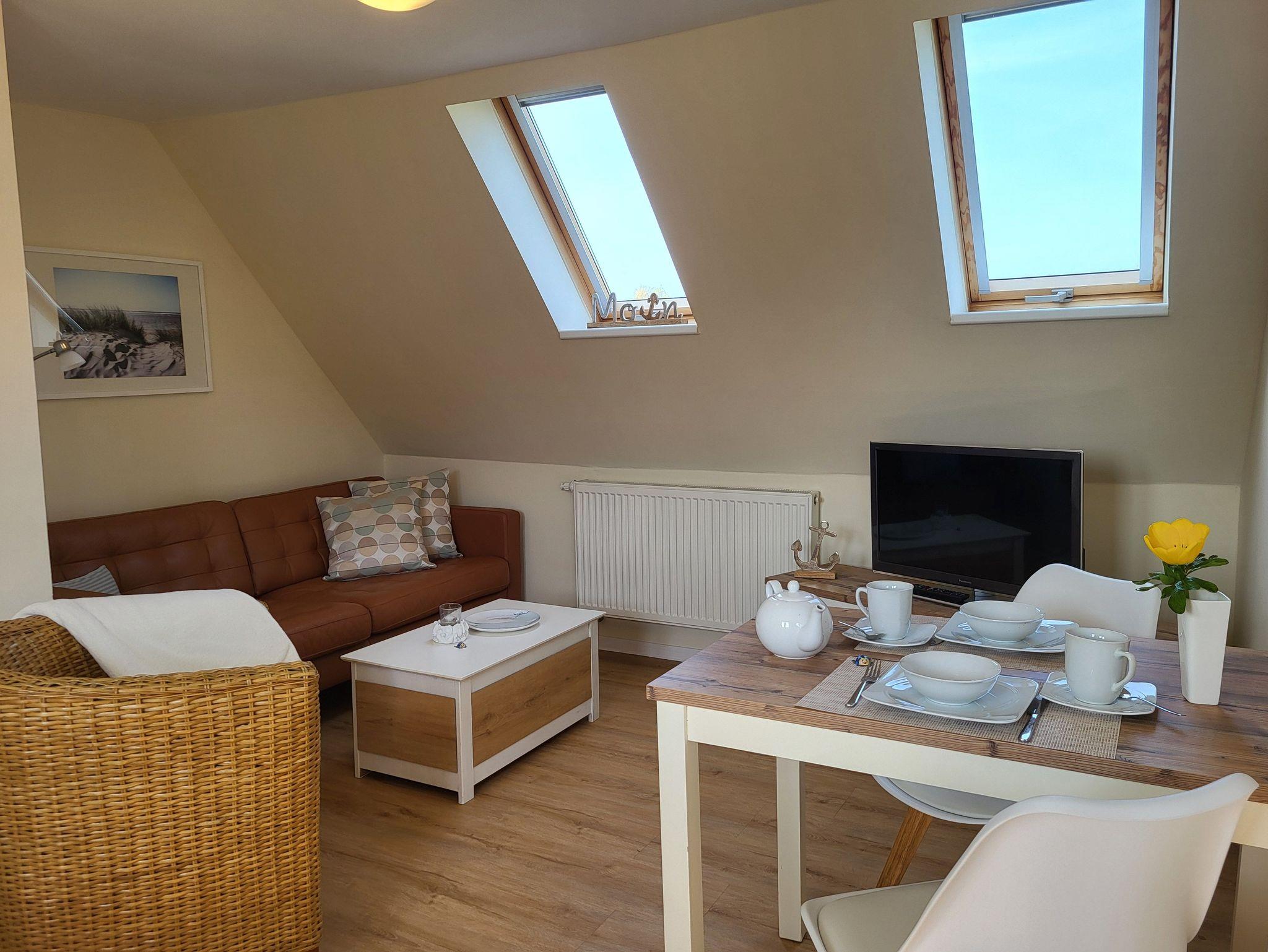 Die helle Ferienwohnung Am Küstenwald in Wustrow bietet Ruhe, Strandnähe und eine Terrasse zum Entspannen.