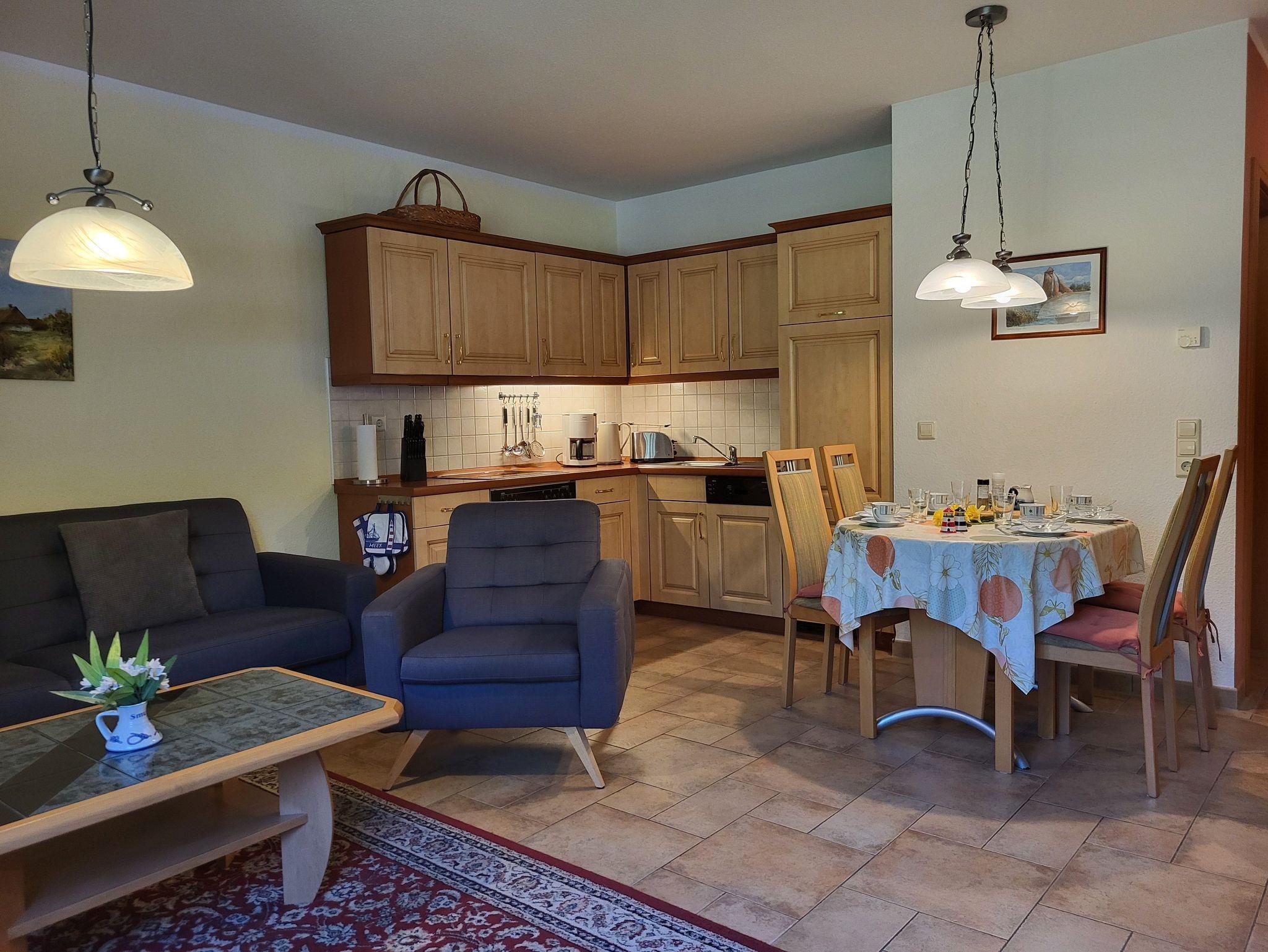 Die Ferienwohnung ist komfortabel mit hellen Möbeln, Radio, Sat-TV und DVD-Player ausgestattet. An die offene Eckküche mit Cerankochfeld, Backofen, Kaffeemaschine, Toaster, Geschirrspüler und Kühlschrank schließt sich der Essplatz an. Das Schlafzimmer verfügt über ein Doppelbett mit den Maßen 1,80 x 2,00 m (getrennte Matratze). Im Bad befindet sich eine Dusche mit niedrigem Einstieg. Im Haus gibt es einen kostenlosen WLAN- Zugang. Haustiere sind herzlich willkommen. Das Rauchen ist in der Ferienwohnung nicht gestattet. Auf dem Grundstück steht 1 PKW- Stellplatz zur Verfügung,