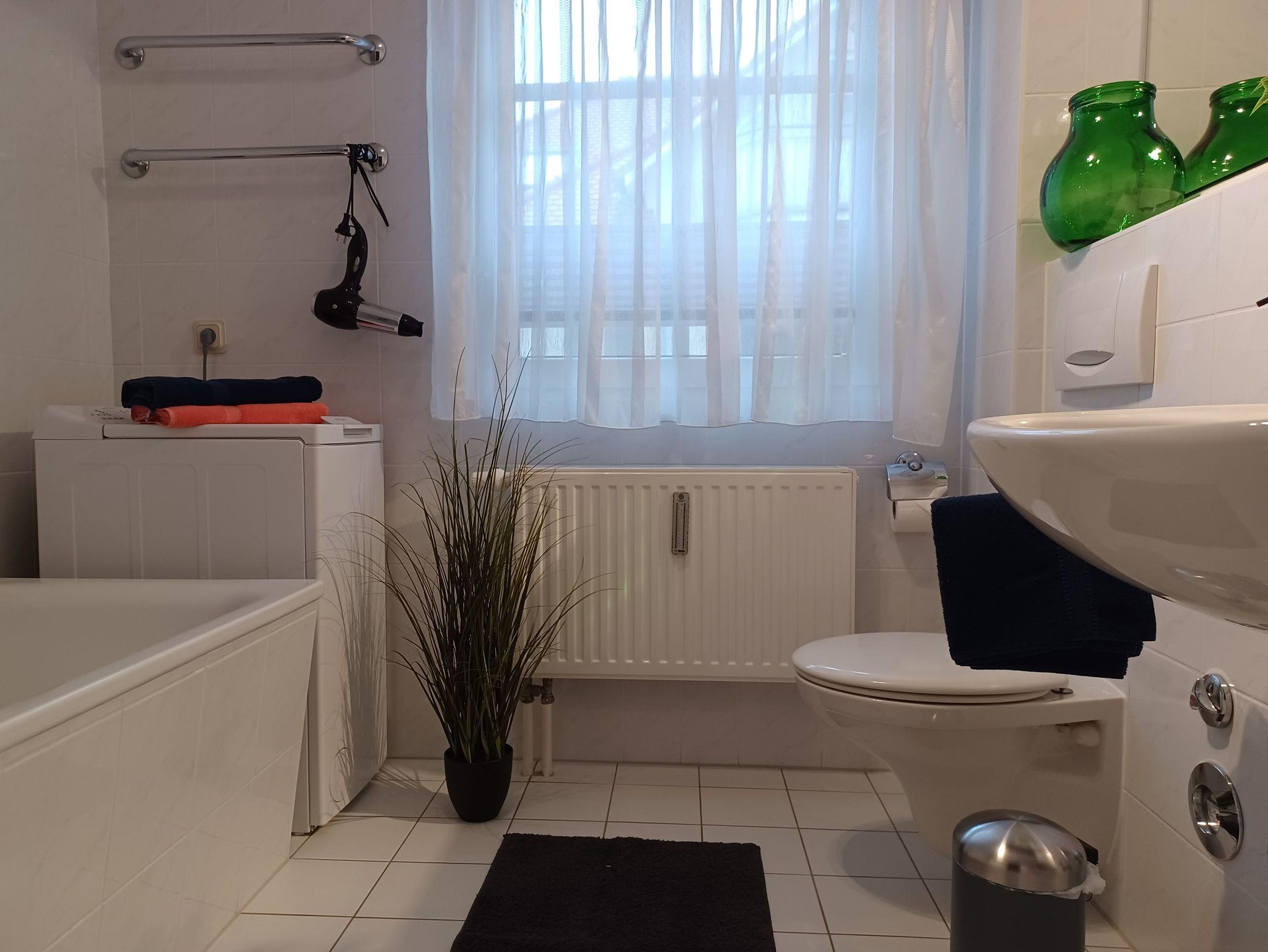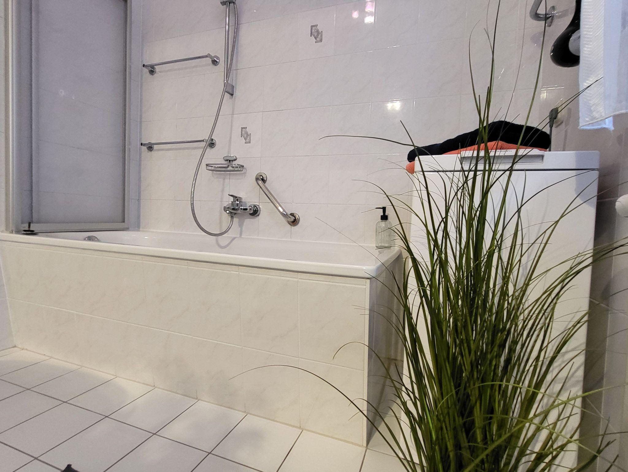 Das Badezimmer ist ausgestattet mit einer Badewanne, Waschmaschine und Fön. Ein Bügeleisen und Bügelbrett sind ebenfalls vorhanden.