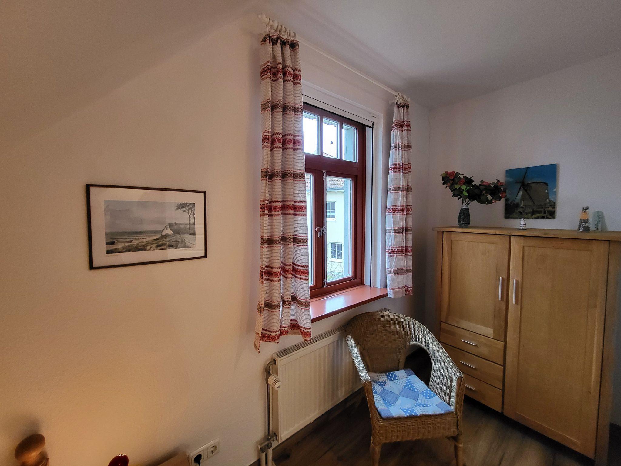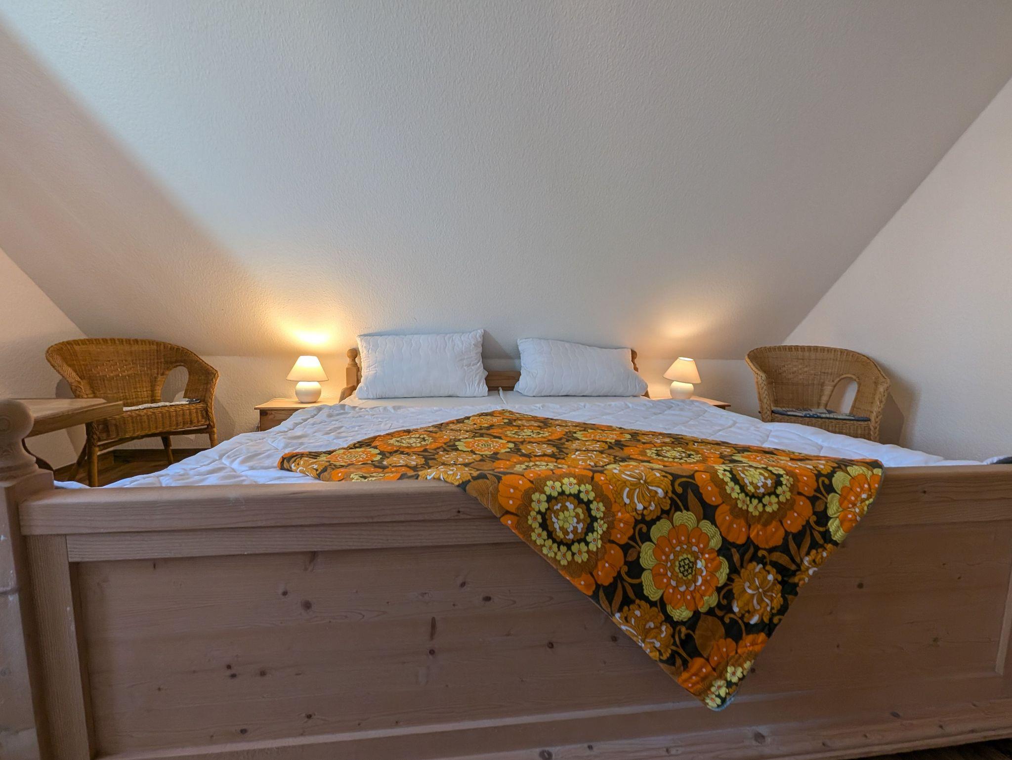 Im Obergeschoss befinden sich 2 Schlafzimmer, die bis zu 4 Personen Platz bieten und mit Mückenschutz ausgestattet sind. Das 1. Schlafzimmer ist ausgestattet mit einem Doppelbett 1,80 x 2,00 m (getrennte Matratzen) und das 2. Schlafzimmer mit zwei Einzelbetten (jeweils 0,90 x 2,00 m). Bettwäsche und Handtücher sind nicht inklusive, können aber über die Zimmervermittlung dazu gebucht werden (12,50 € pro Bettwäsche- Set und 7,00 € pro Handtuchpaket (1 Badetuch, 1 Handtuch).