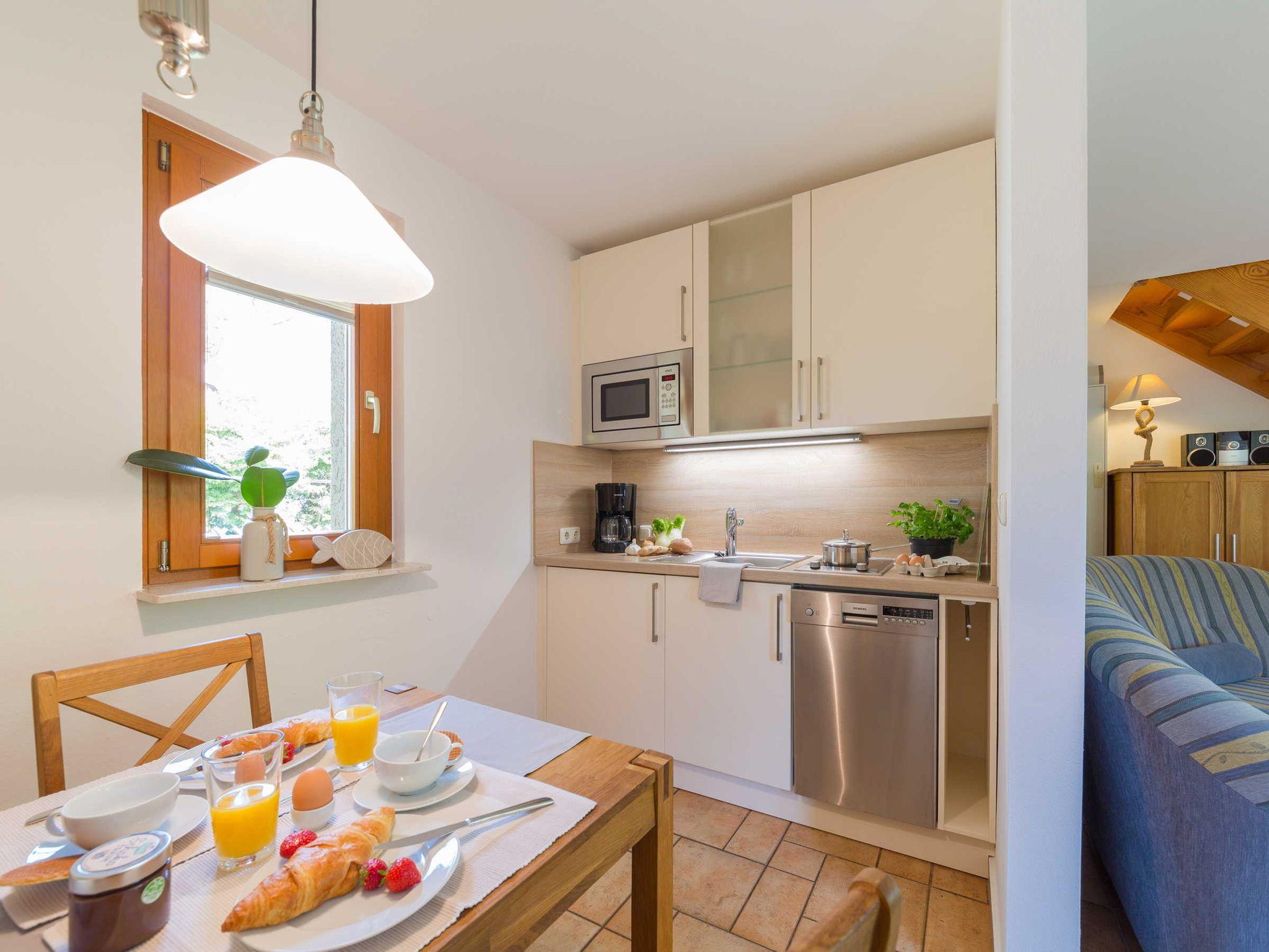 Die Küche ist eine komplett eingerichtete Küche und bietet u.a. Spülmaschine, 2-Felder-Ceran-Kochfeld, Kaffeemaschine, Toaster, Wasserkocher und eine Mikrowelle sowie einen großen Esstisch für 4 Personen. Der Kühlschrank besitzt ein Gefrierfach.