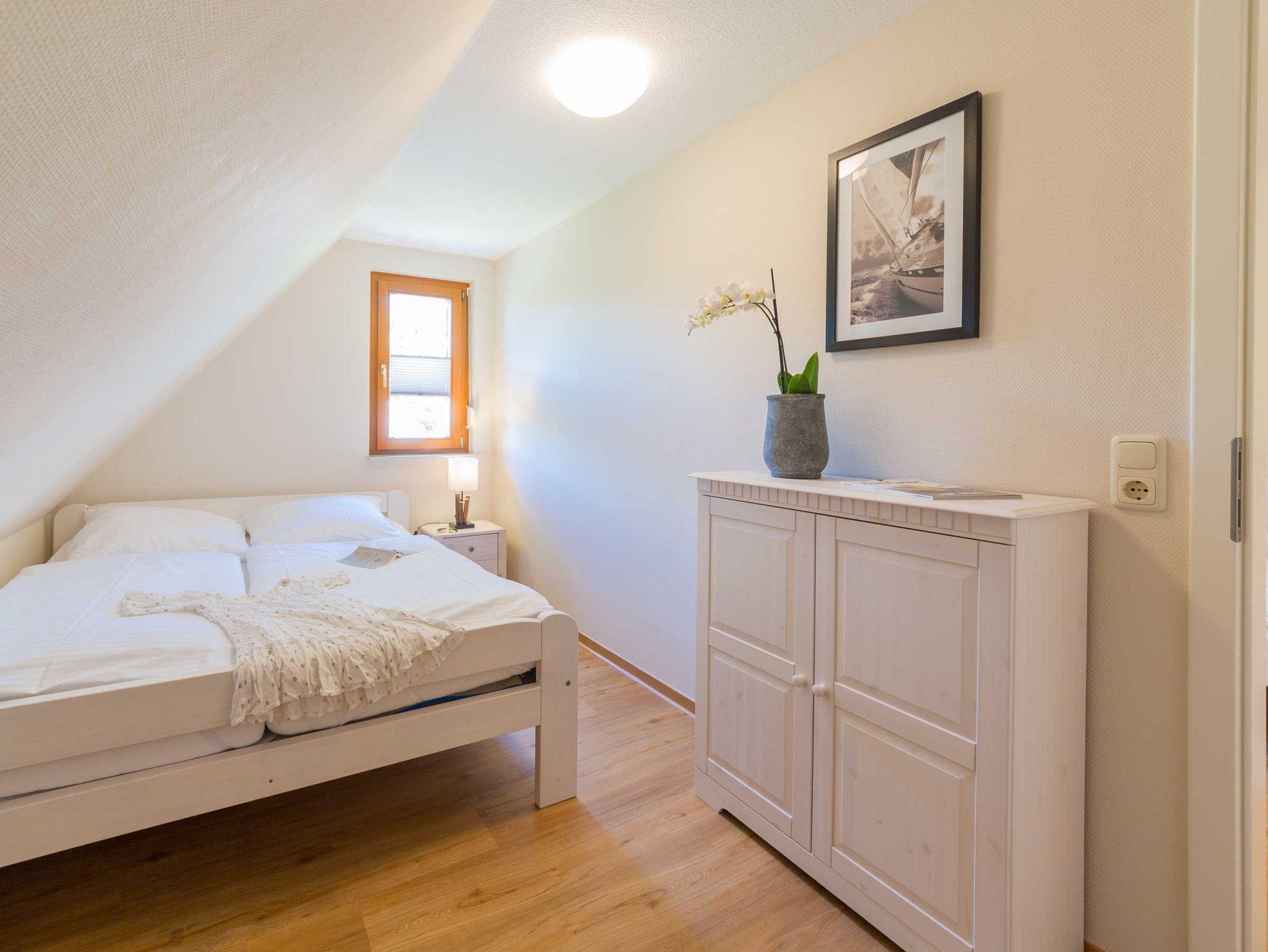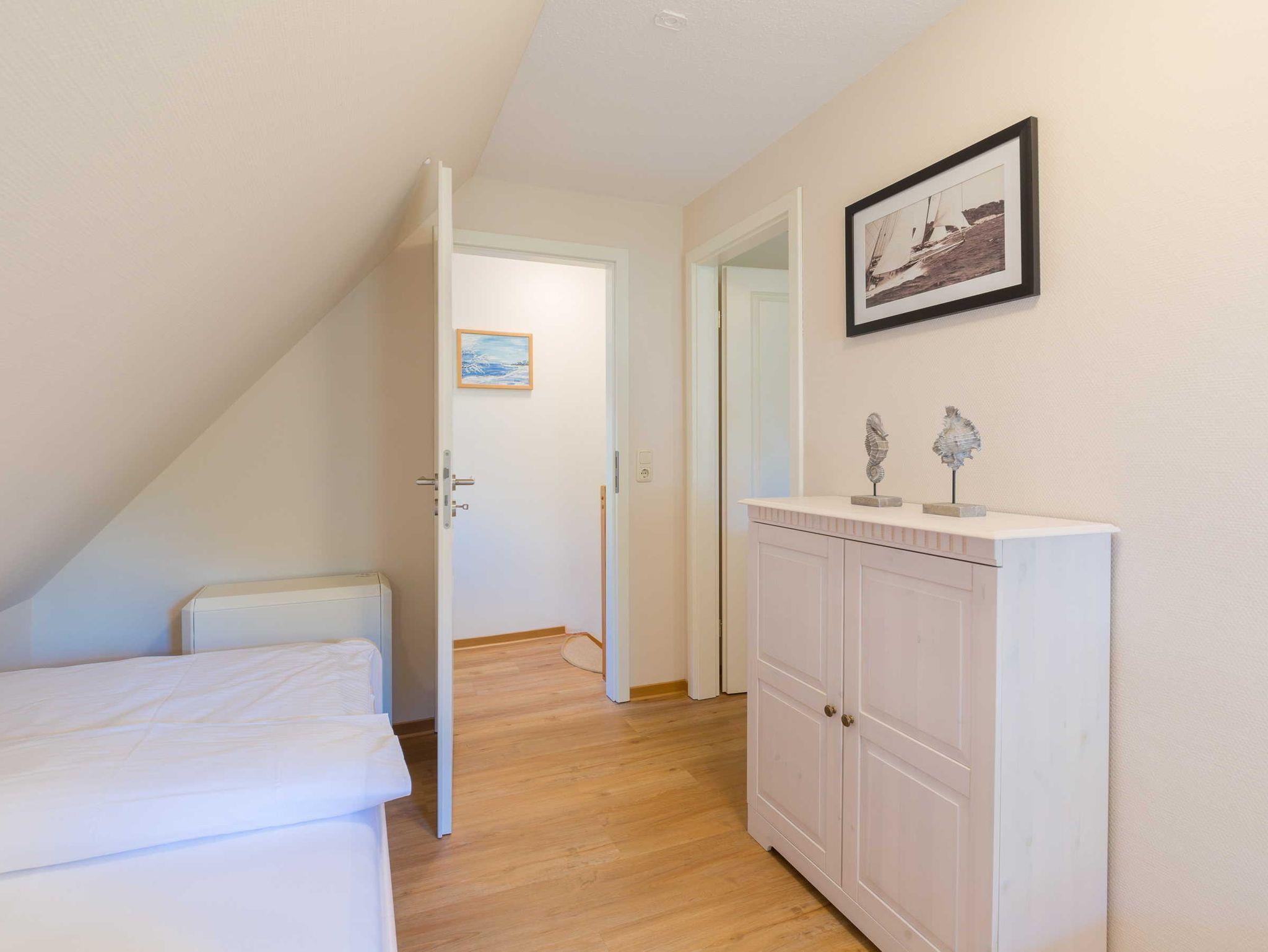 Im Obergeschoss gibt es ein Schlafzimmer mit Doppelbett und ein Schlafzimmer mit zwei Einzelbetten. Das Badezimmer hat Dusche/WC. Die Terrasse ist Richtung Zufahrtsstraße zur Halbinsel Fischland/Darß.
