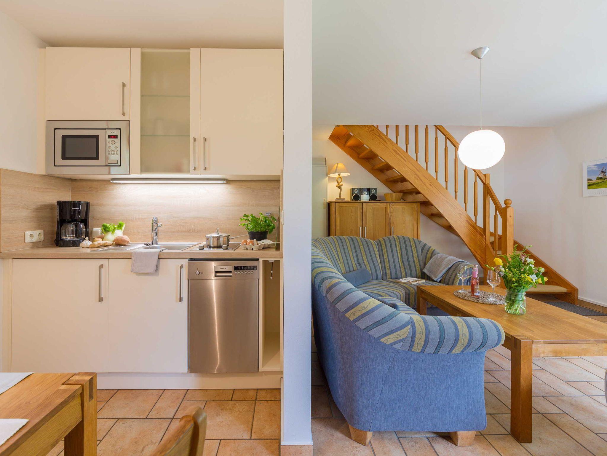 Das Ferienhaus in Wustrow ist ca. 60 qm groß und bietet Platz für bis zu 4 Personen. Im Erdgeschoss gibt einen großzügigen Wohnbereich, der mit einer offenen Küche kombiniert ist. Der Wohnbereich ist mit Couchgarnitur und Flachbildfernseher ausgestattet.