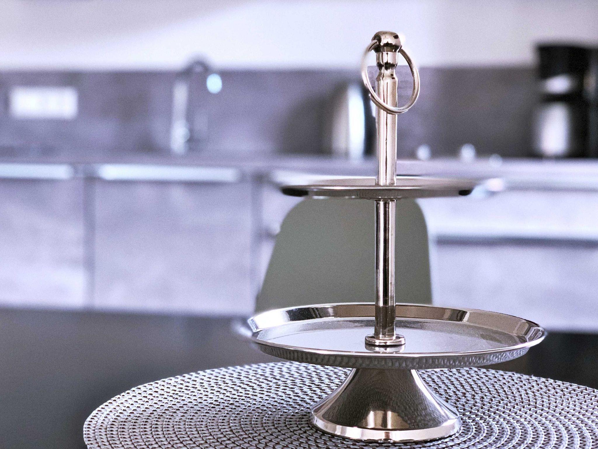 Die Küchenzeile ist umfangreich mit Geräten, Kochutensilien sowie Geschirr ausgestattet.