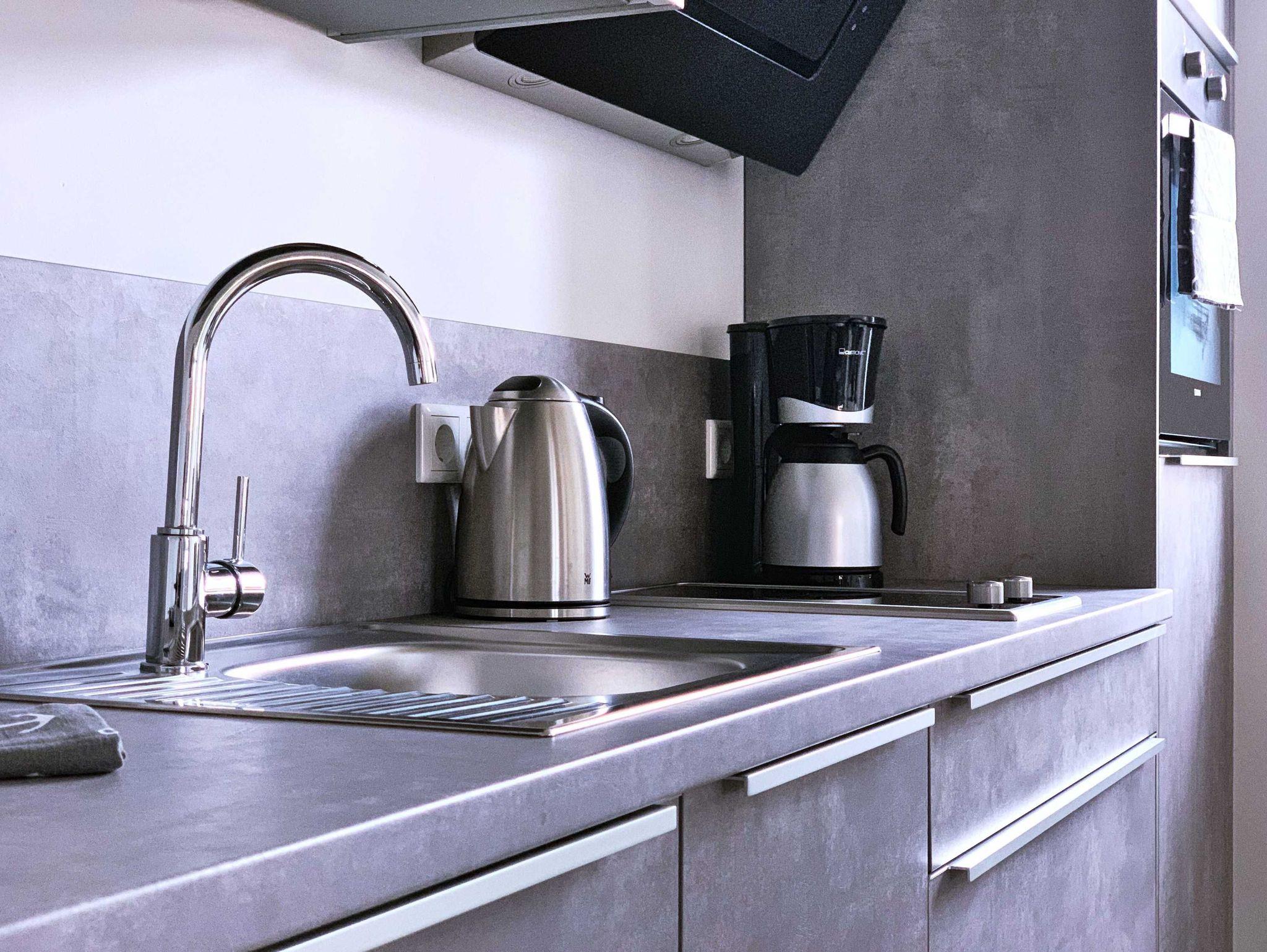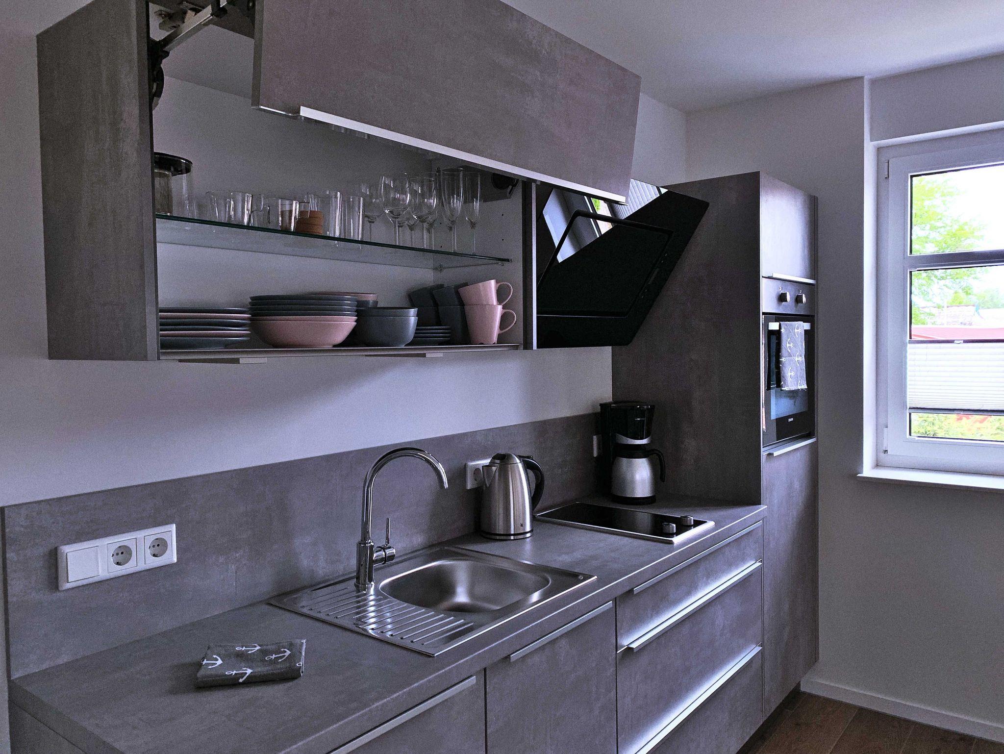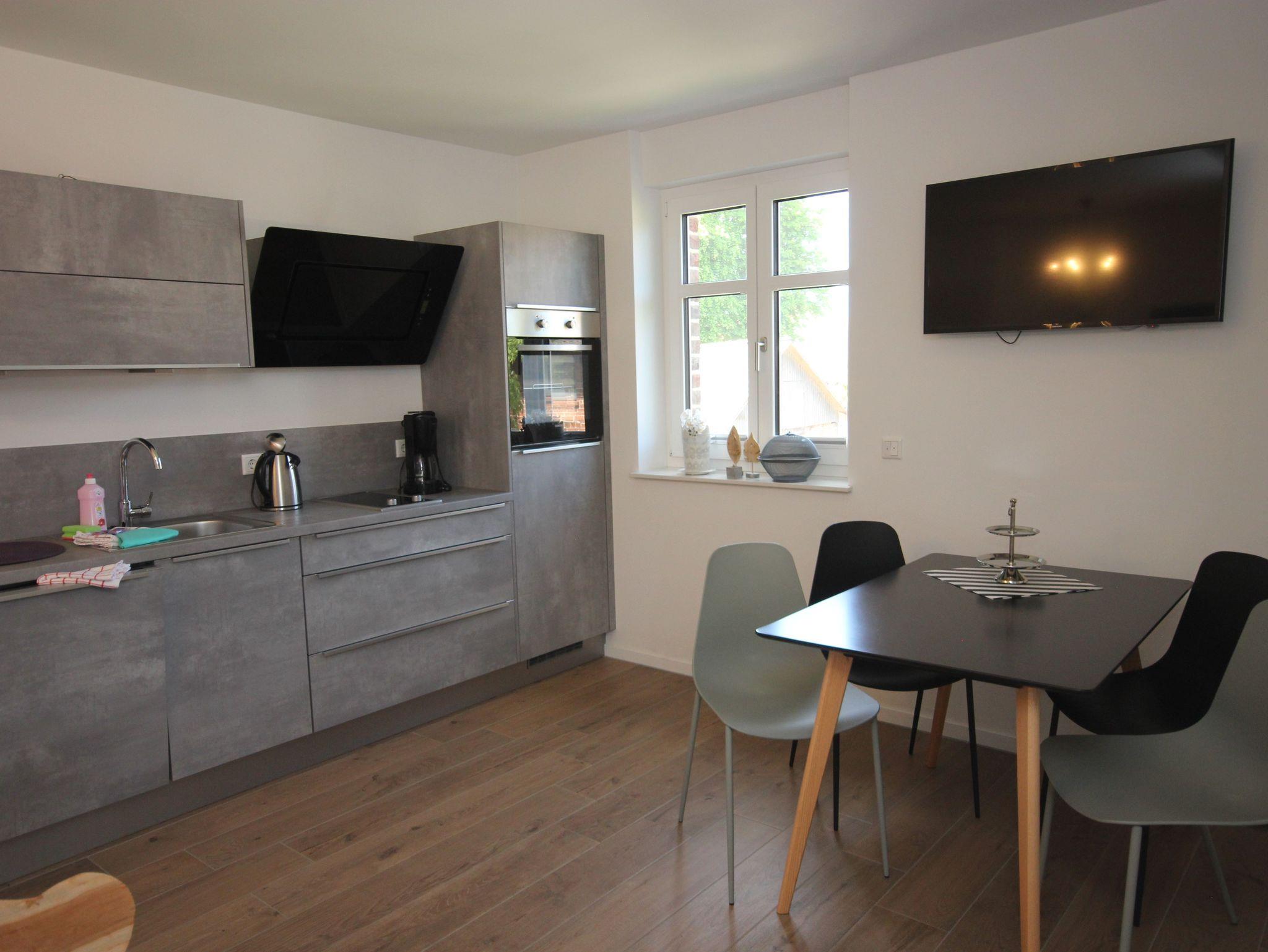 Die offene Wohnküche wurde mit SAT-TV, kostenlosem WLAN-Gastzugang, einer Küchenzeile und einer Schlafcouch ausgestattet.