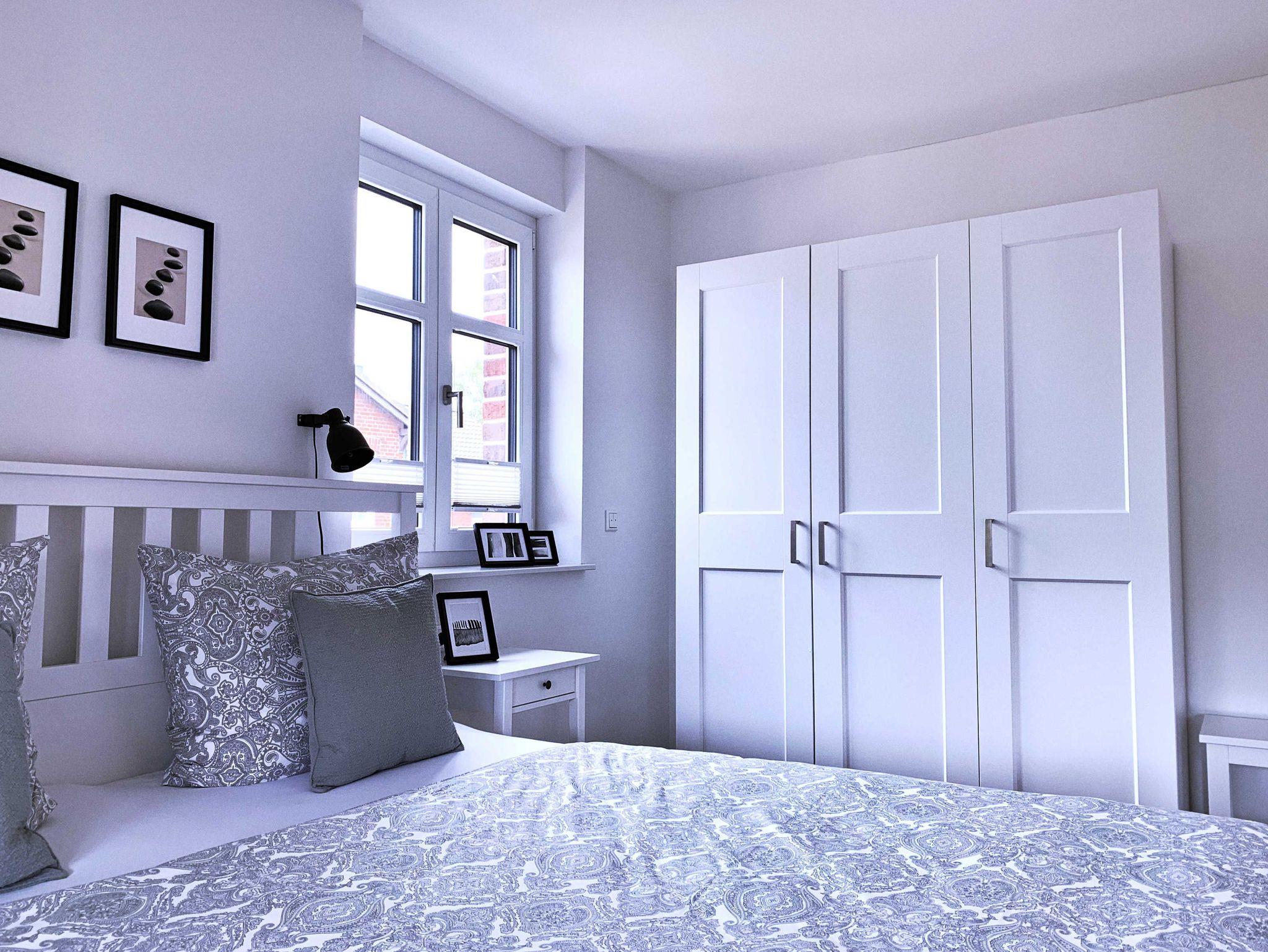 Der Schlafraum besitzt ein Doppelbett (1,80 x 2,00 m) mit getrennten Matratzen und einem Topper sowie einem Kleiderschrank mit genügend Stauraum. Bei Bedarf kann dort ein Kinderreisebett aufgestellt werden.