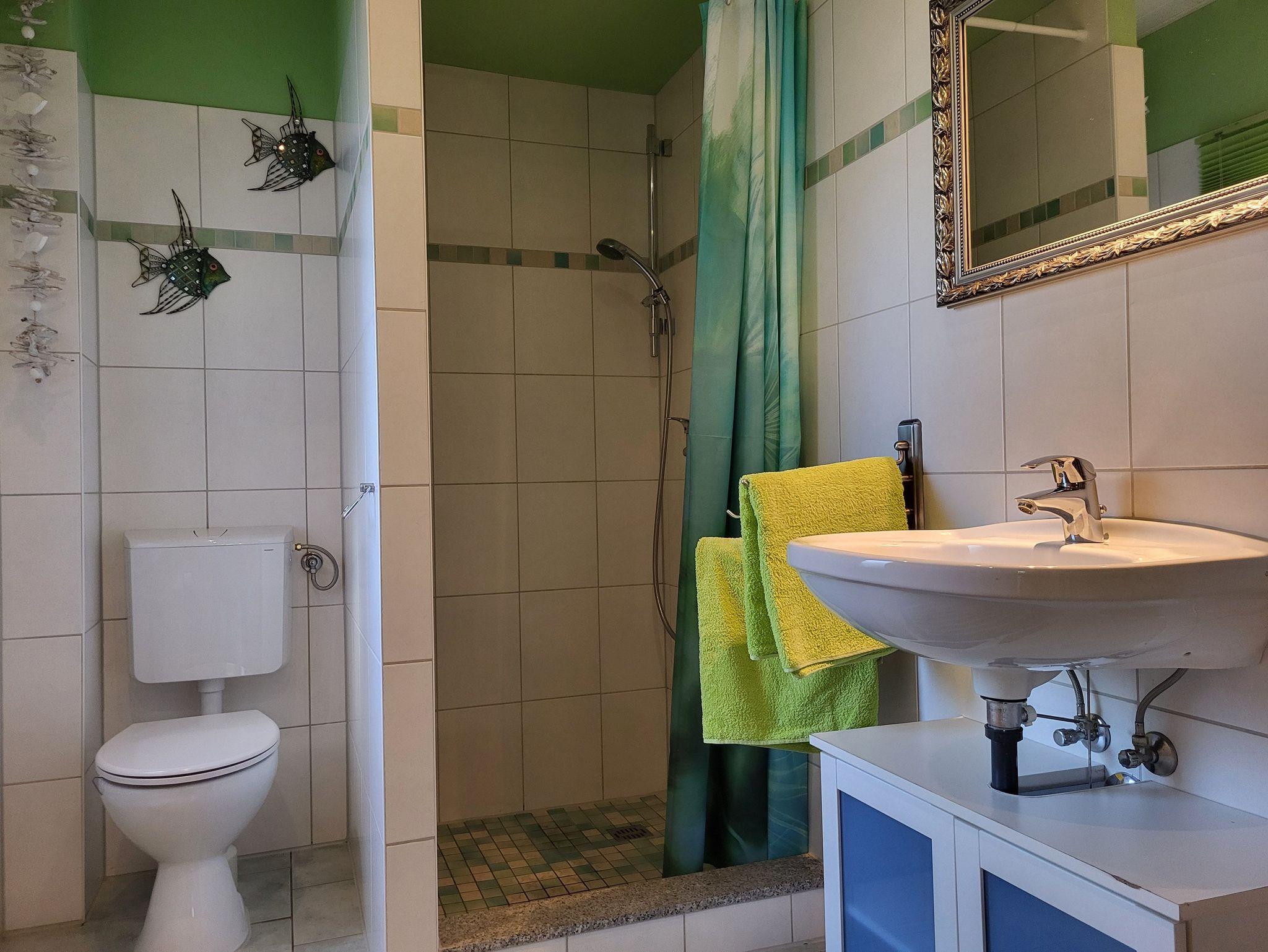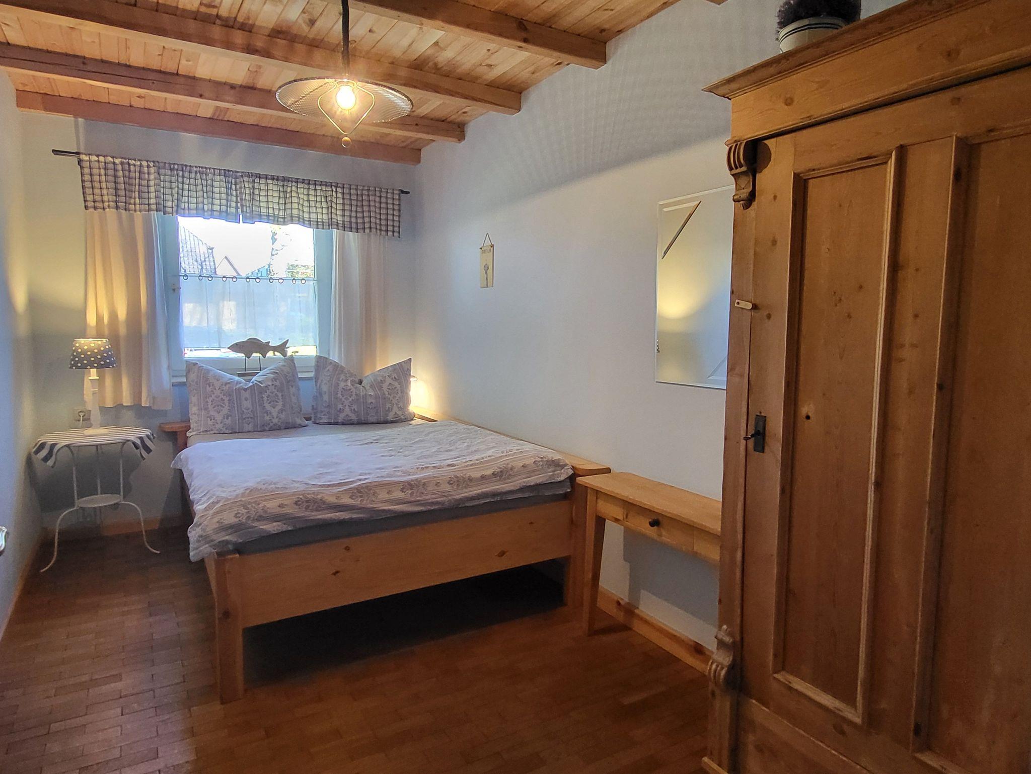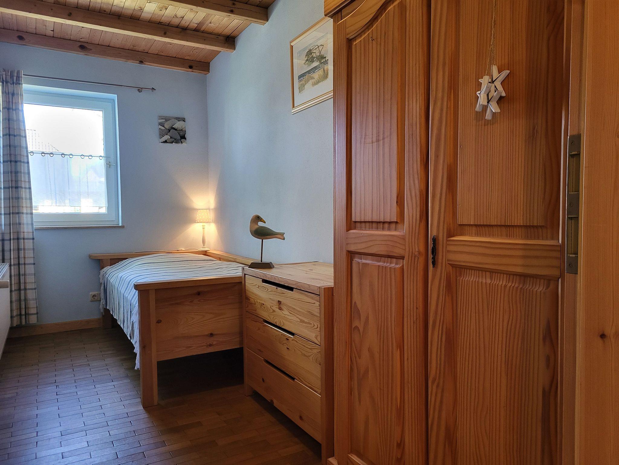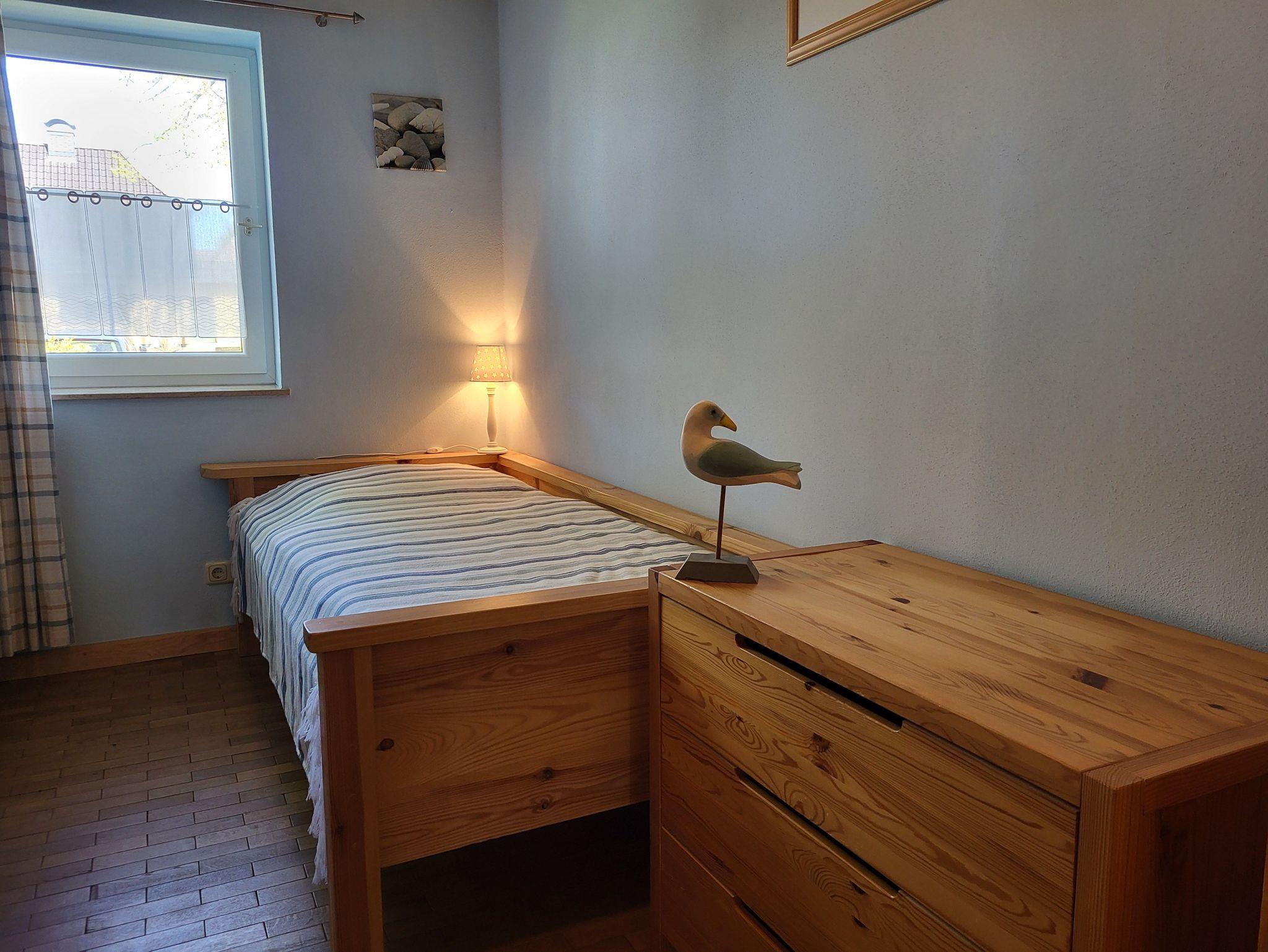 individuell und mit Liebe zum Detail eingerichtete Ferienwohnung im Erdgeschoss und separatem Eingang. Der gemütlich eingerichtete Wohnbereich mit Zugang zur Süderseitgen Terrasse, lädt zum erholen und entspannen ein. Gern können Sie auch im Garten (ca. 200 qm) sich einen gemütlichen und versteckten Platz suchen. Der offene Wohnbereich ist ausgestattet mit einer Couch und einem Kaminofen ( ein Starterpaket steht bereit), daran schließt sich die offene komplett ausgestattete Küchenzeile mit ausreichend Geschirr und umfangreicher Ausstattung an.Das Schlafzimmer ist ausgestattet mit Doppelbett (1,40 x 2,00 m) und das Kinderzimmer mit 1 Einzelbett (0,90 x 1,90 m). Im Bad befindet sich eine Dusche/WC.Die Wohnung wir mit Bettwäsche und Handtücher übergeben. Der Parkplatz befindet sich auf dem Grundstück. Alle Wohnungen sind Nichtraucherwohnungen.