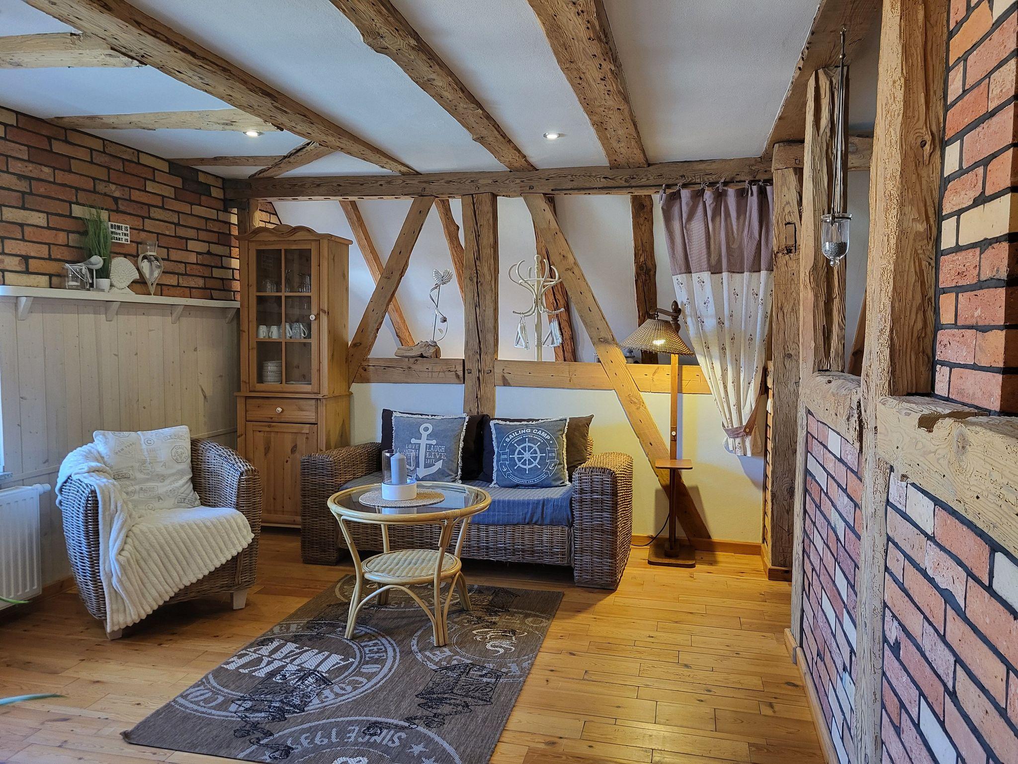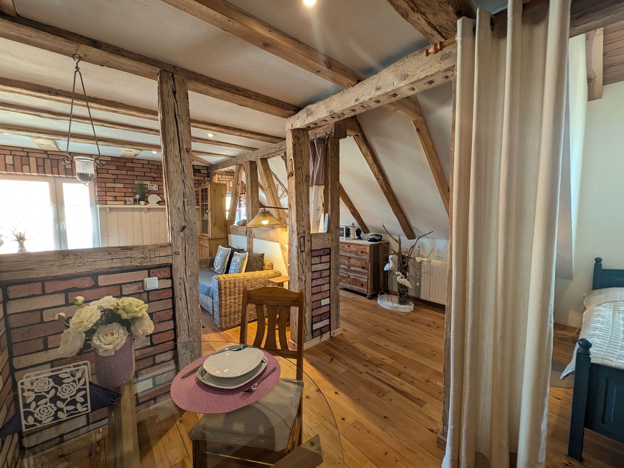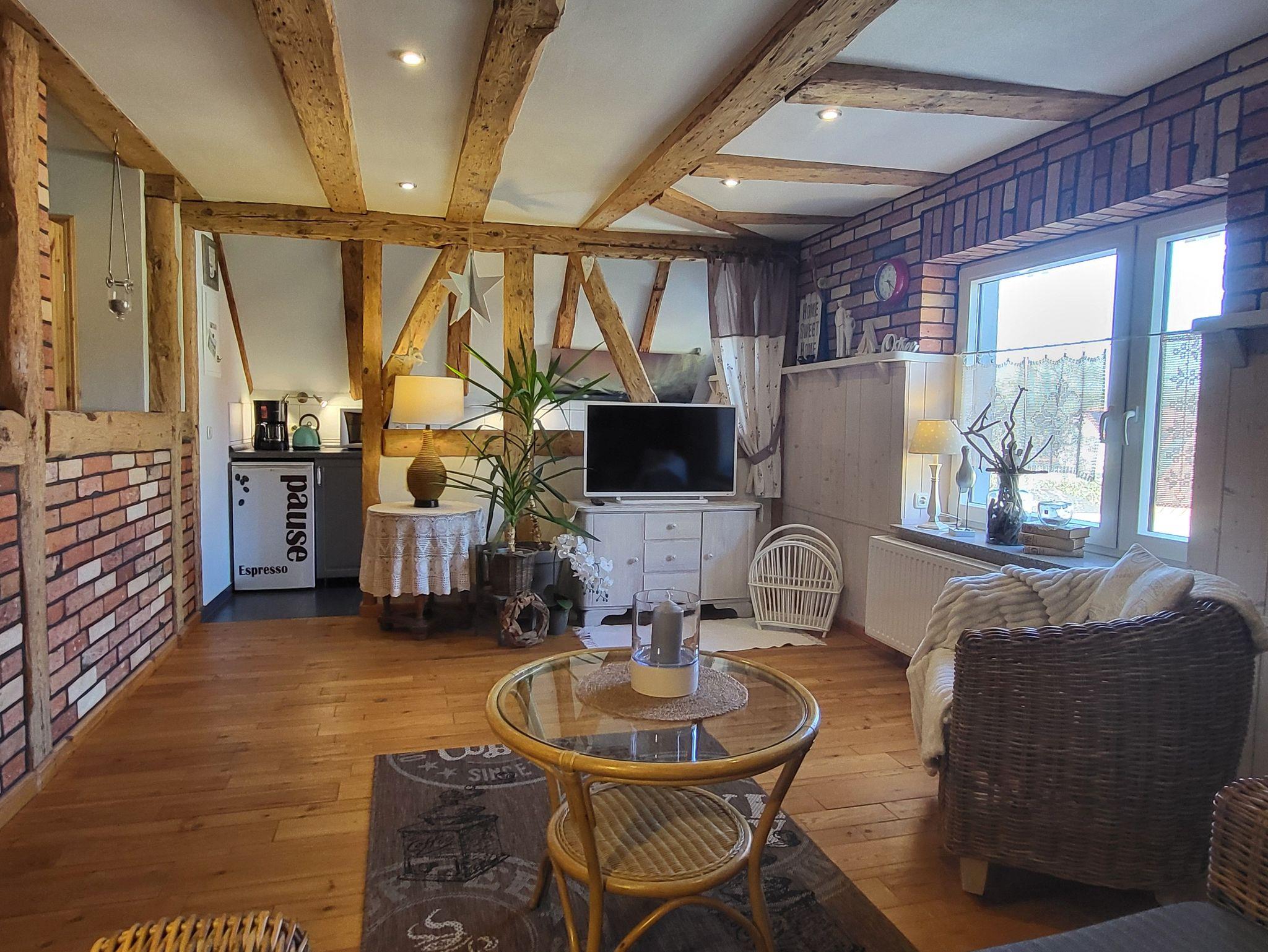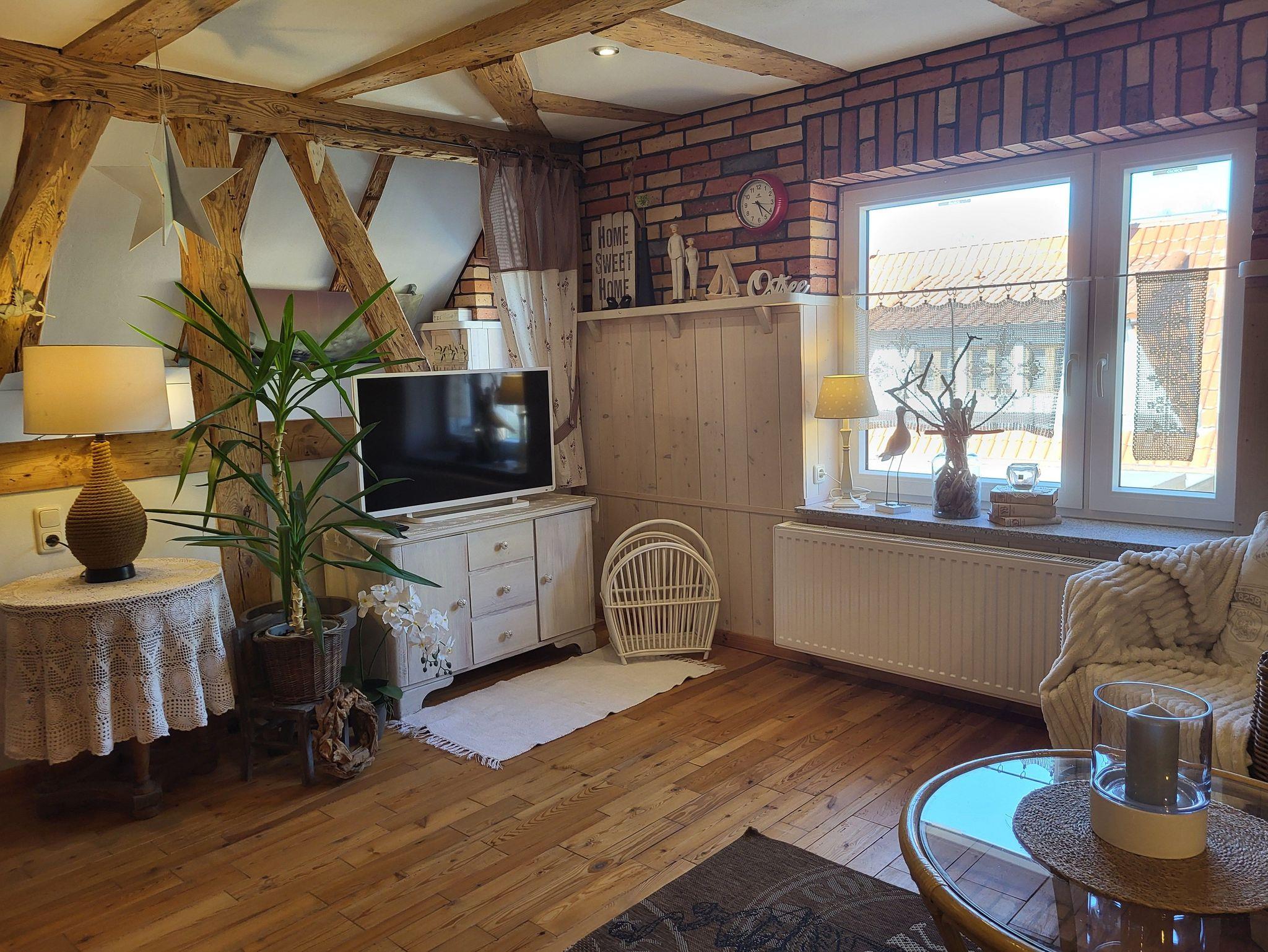 die Ferienwohnung im Obergeschoss. wurde liebevoll und fachgerecht grundsaniert, alles wurde mit natürlichen Baustoffen hergerichtet. Freigelegtes altes Sichtfachwerk und Naturholzböden zeigen die Persönlichkeit der Wohnung. Naturholzmöbel sorgen für ein wohnliches Ambiente. Der offene Wohnstil mit komplett ausgestatteter Küchenzeile, ein lichtdurchflutetes Bad und der großzügige Wohnraum sorgen für Gemütlichkeit. Doppelbett 2,00 x 1,80 m. Im großen naturbelassenen Garten lädt eine sonnige Gemeinschaftsterrasse am alten Apfelbaum zum verweilen ein. Parkplatz auf dem Grundstück. Die Wohnung ist nicht geeignet für Kinder unter 6 Jahren. Die Ferienwohnung wir mit Bettwäsche und Handtücher übergeben.