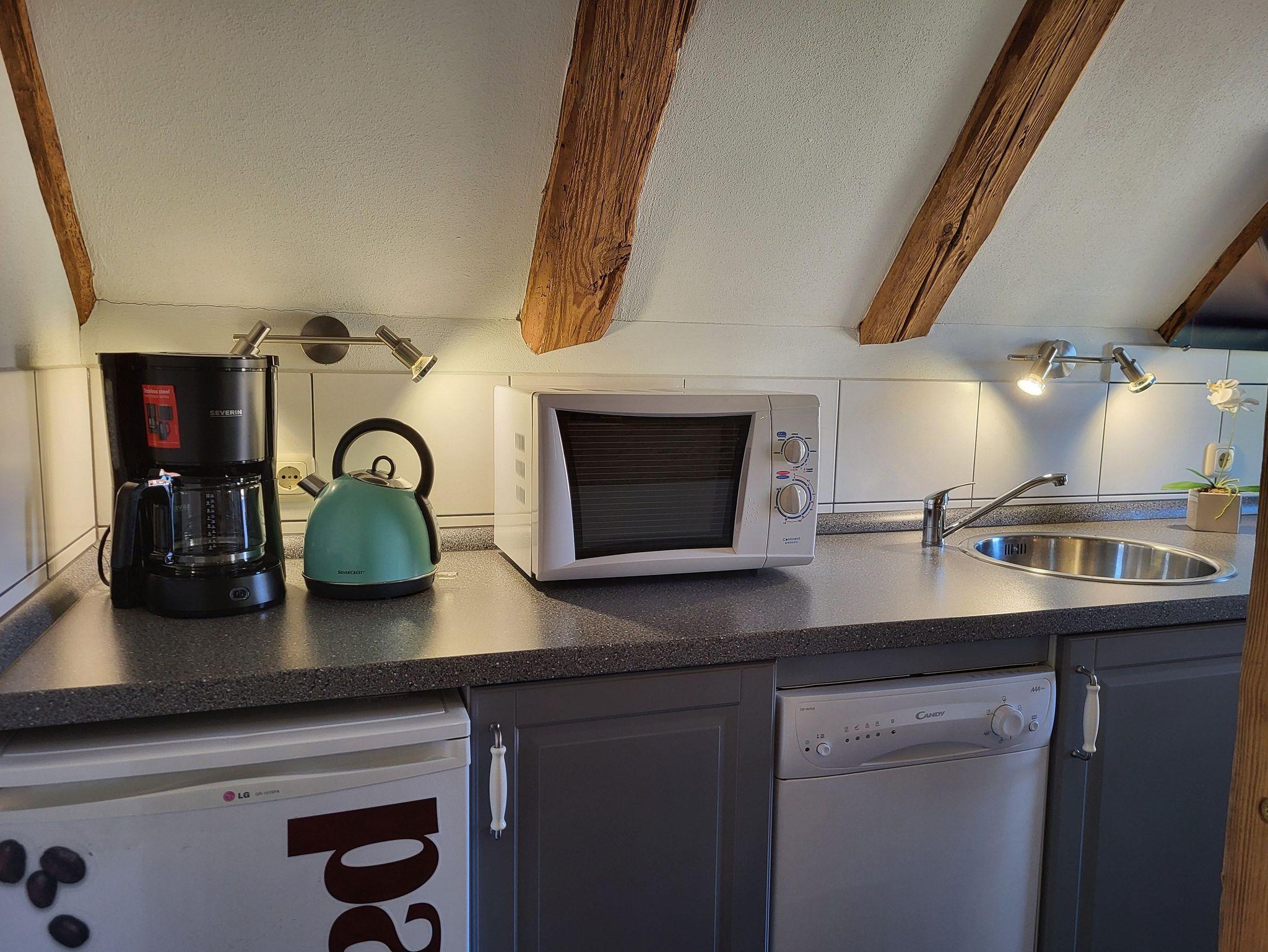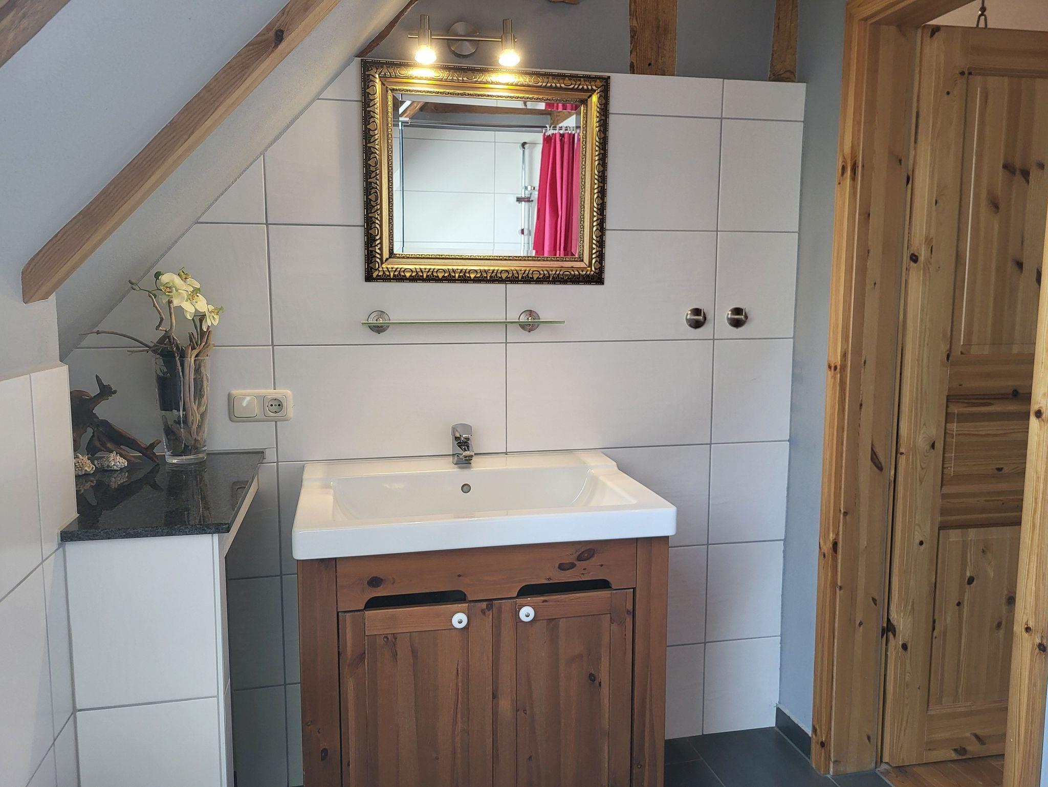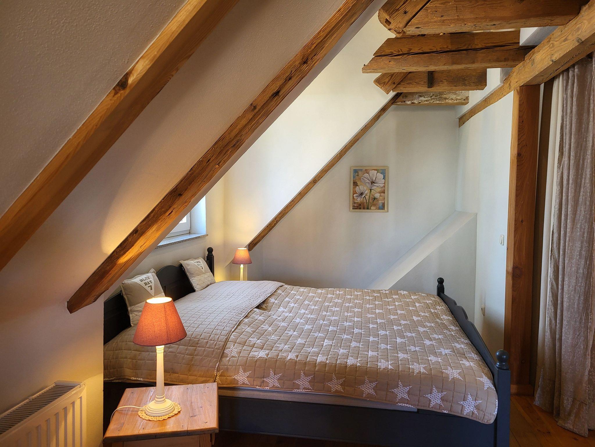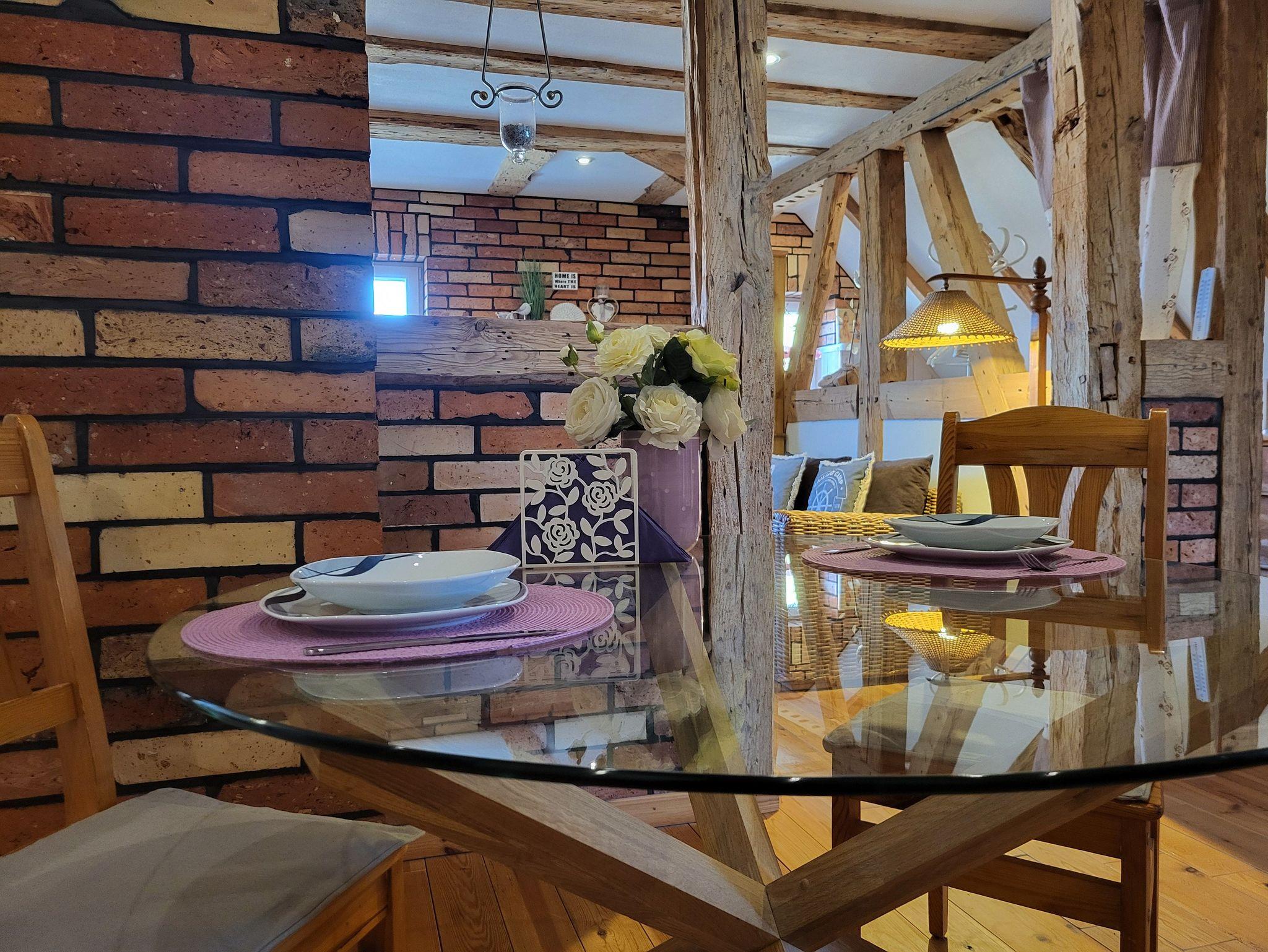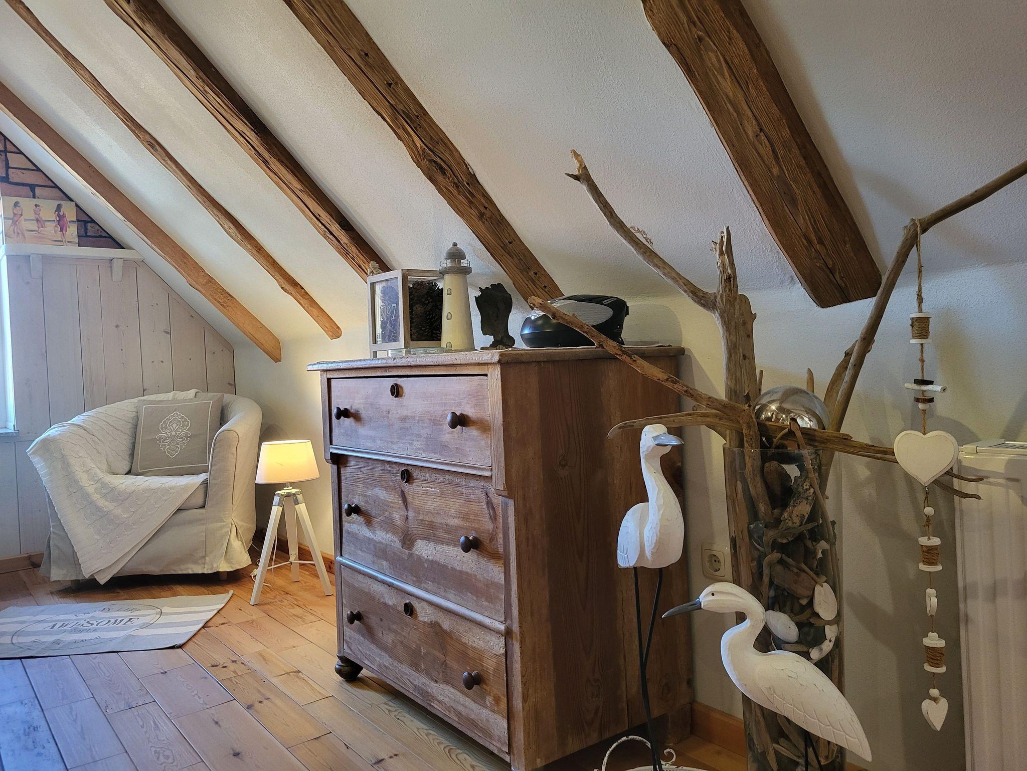 die Ferienwohnung im Obergeschoss. wurde liebevoll und fachgerecht grundsaniert, alles wurde mit natürlichen Baustoffen hergerichtet. Freigelegtes altes Sichtfachwerk und Naturholzböden zeigen die Persönlichkeit der Wohnung. Naturholzmöbel sorgen für ein wohnliches Ambiente. Der offene Wohnstil mit komplett ausgestatteter Küchenzeile, ein lichtdurchflutetes Bad und der großzügige Wohnraum sorgen für Gemütlichkeit. Doppelbett 2,00 x 1,80 m. Im großen naturbelassenen Garten lädt eine sonnige Gemeinschaftsterrasse am alten Apfelbaum zum verweilen ein. Parkplatz auf dem Grundstück. Die Wohnung ist nicht geeignet für Kinder unter 6 Jahren. Die Ferienwohnung wir mit Bettwäsche und Handtücher übergeben.