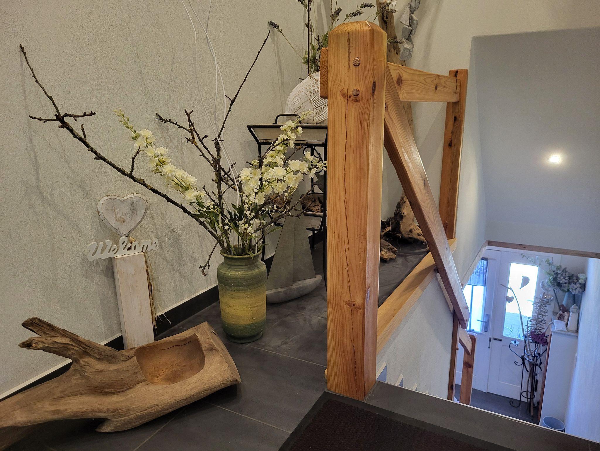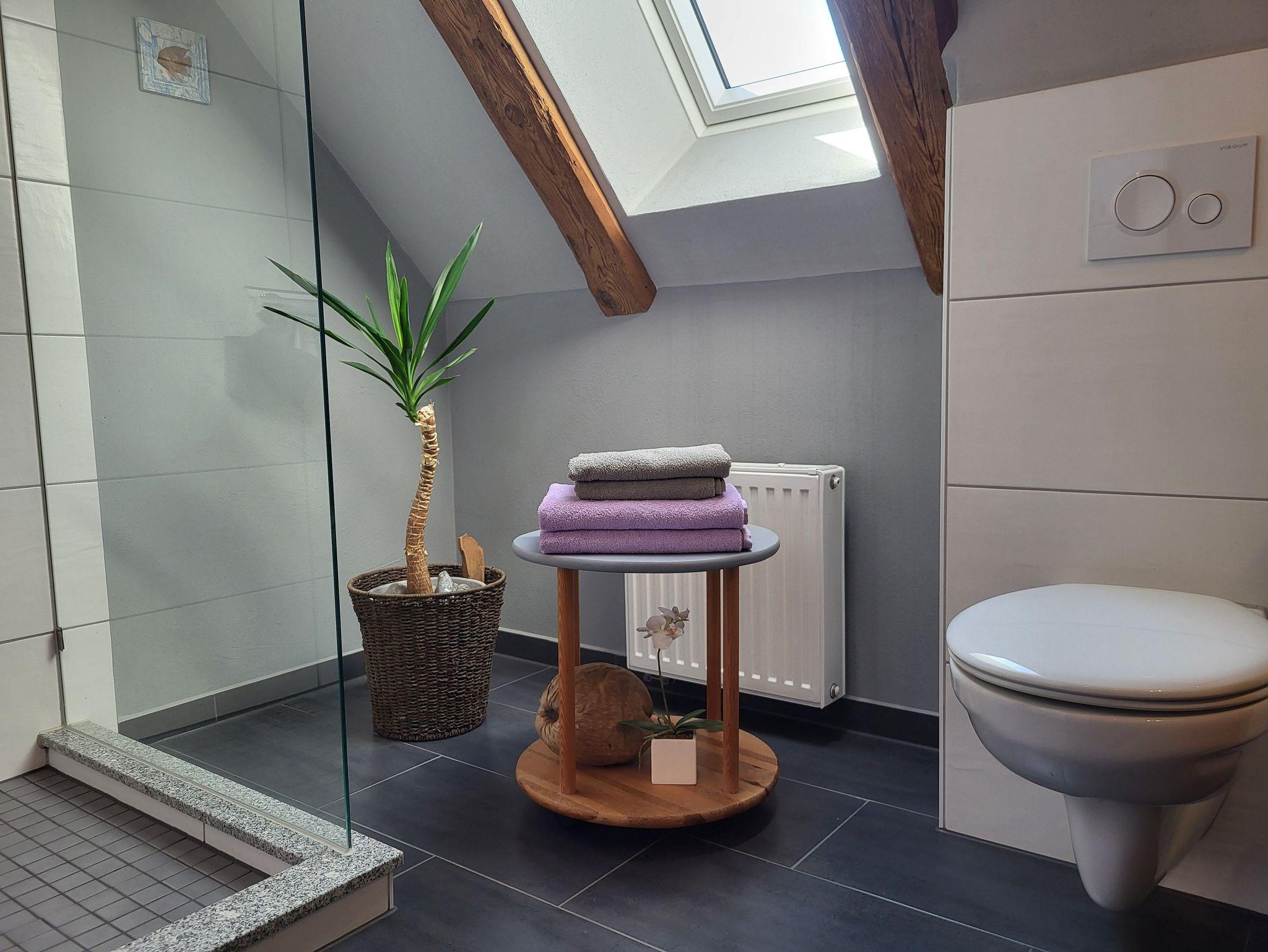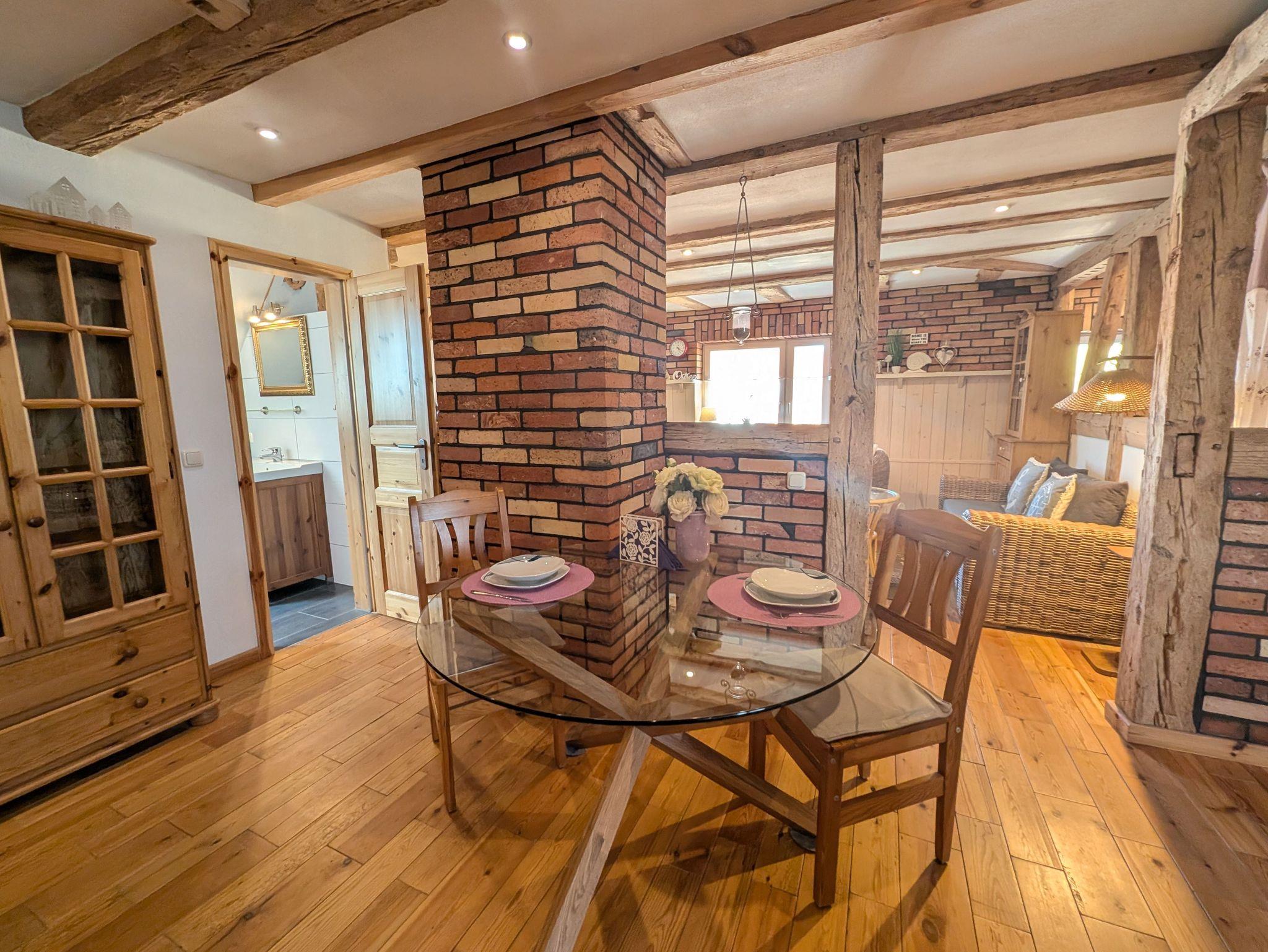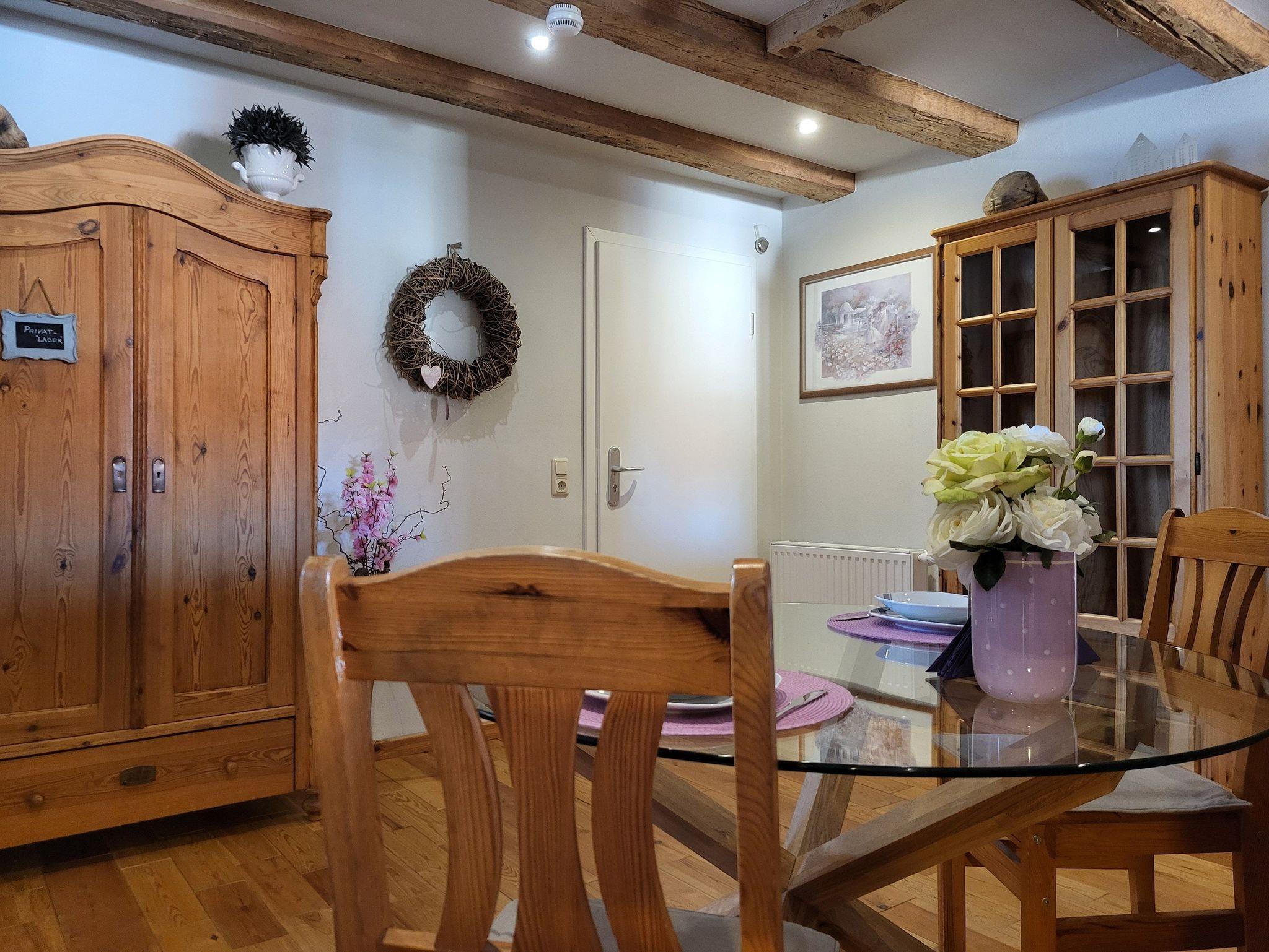 die Ferienwohnung im Obergeschoss. wurde liebevoll und fachgerecht grundsaniert, alles wurde mit natürlichen Baustoffen hergerichtet. Freigelegtes altes Sichtfachwerk und Naturholzböden zeigen die Persönlichkeit der Wohnung. Naturholzmöbel sorgen für ein wohnliches Ambiente. Der offene Wohnstil mit komplett ausgestatteter Küchenzeile, ein lichtdurchflutetes Bad und der großzügige Wohnraum sorgen für Gemütlichkeit. Doppelbett 2,00 x 1,80 m. Im großen naturbelassenen Garten lädt eine sonnige Gemeinschaftsterrasse am alten Apfelbaum zum verweilen ein. Parkplatz auf dem Grundstück. Die Wohnung ist nicht geeignet für Kinder unter 6 Jahren. Die Ferienwohnung wir mit Bettwäsche und Handtücher übergeben.
