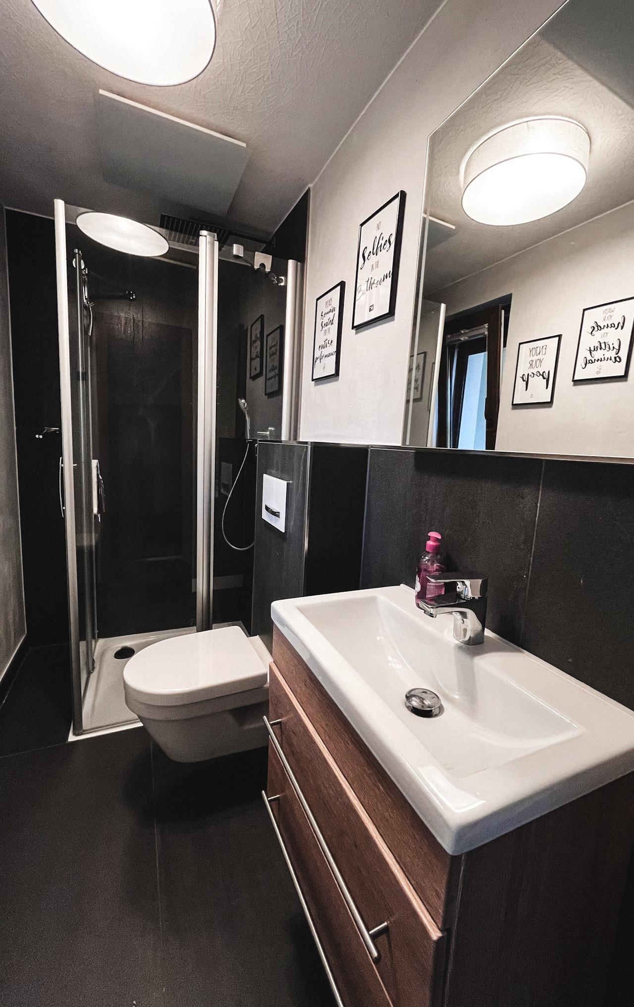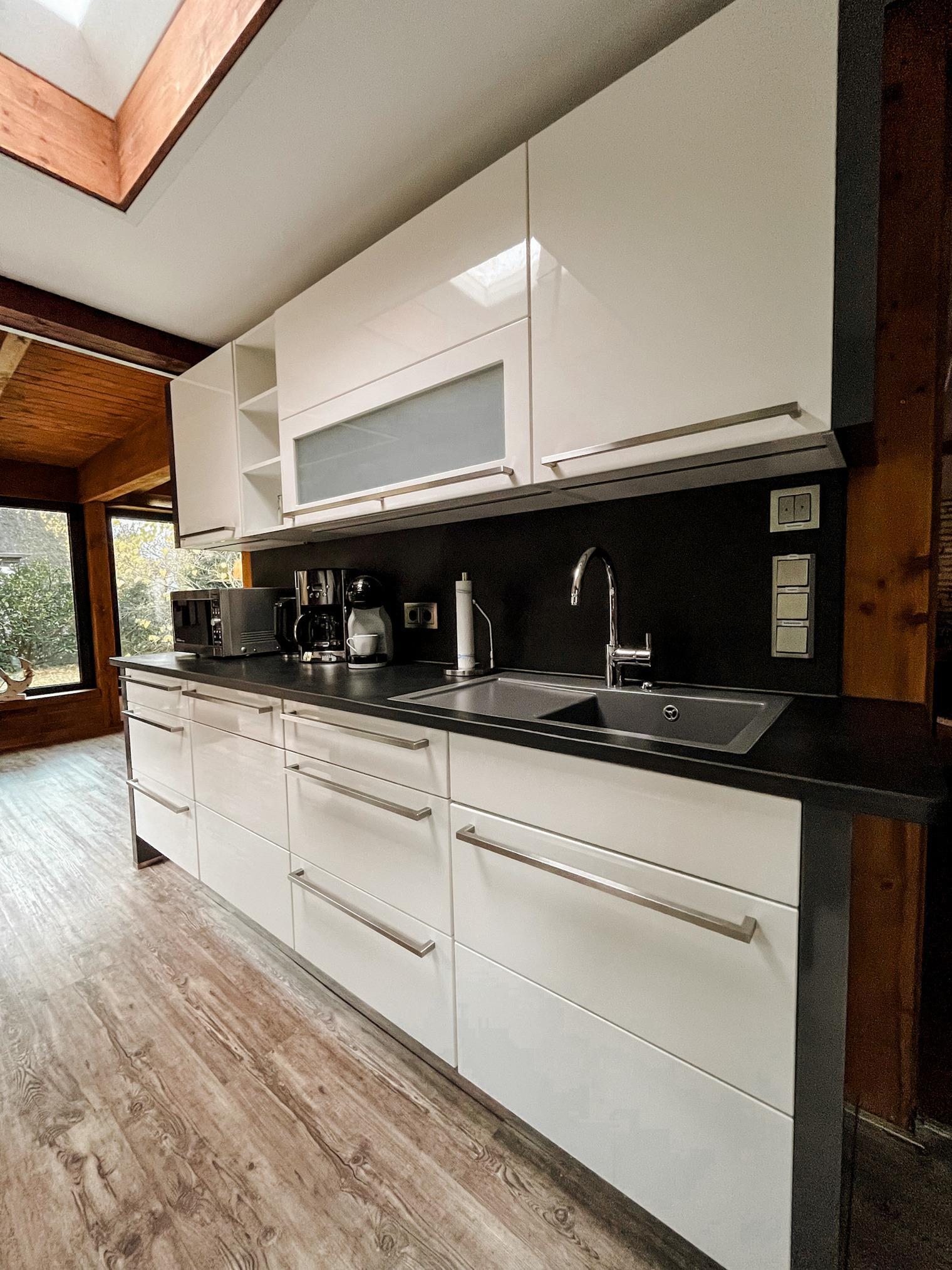 Das Haus verfügt über einen großzügigen Wohnbereich mit Kamin und einem Essbereich mit Blick in den Garten. Nach einem Umbau befindet sich seit Mai 2020 ein kleines Bad mit Dusche und WC neben dem Wohnbereich. Die offene Küche ist modern und vollständig eingerichtet.