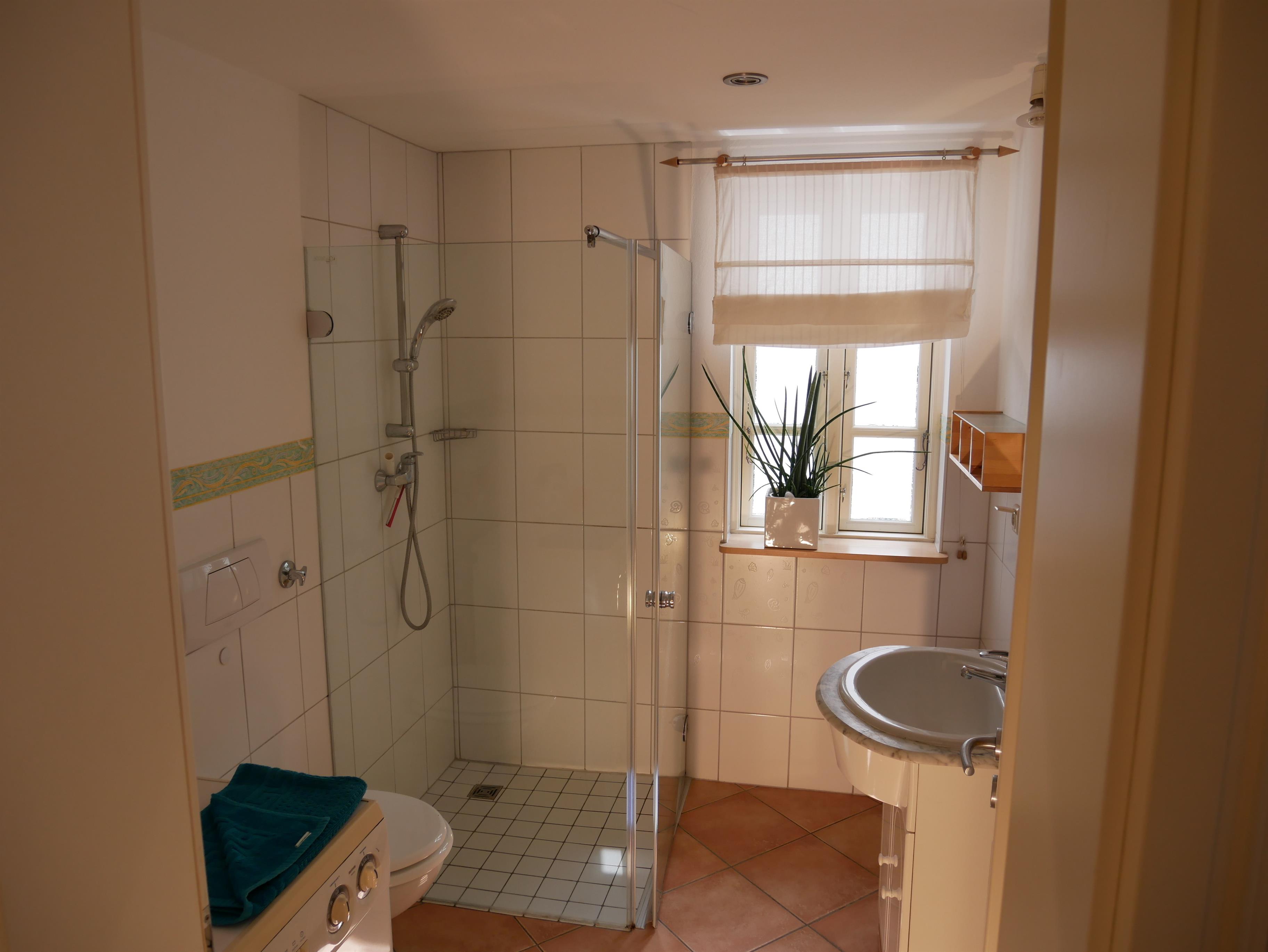 Das Tageslicht - Bad mit Dusche, Waschtisch und WC.