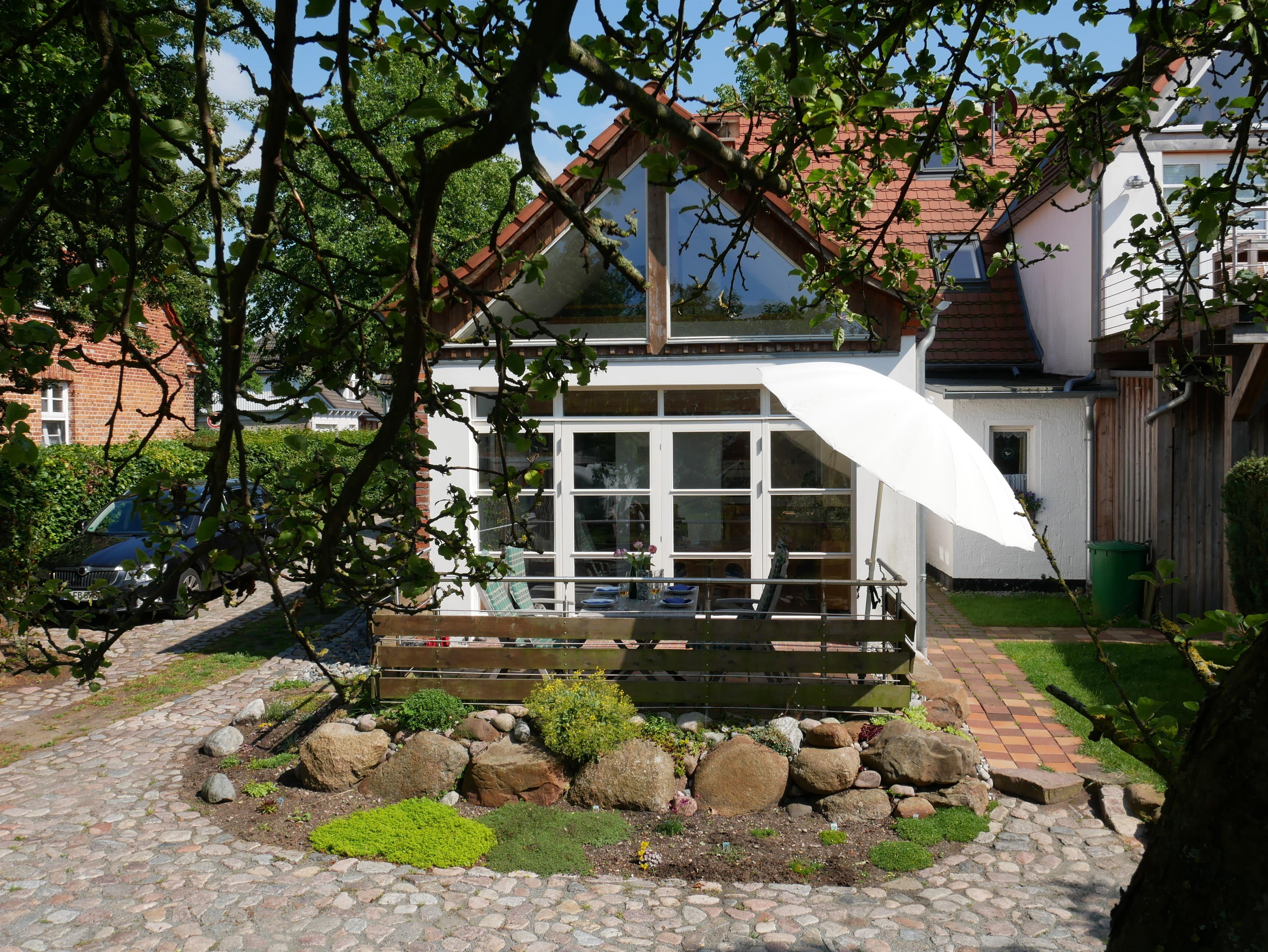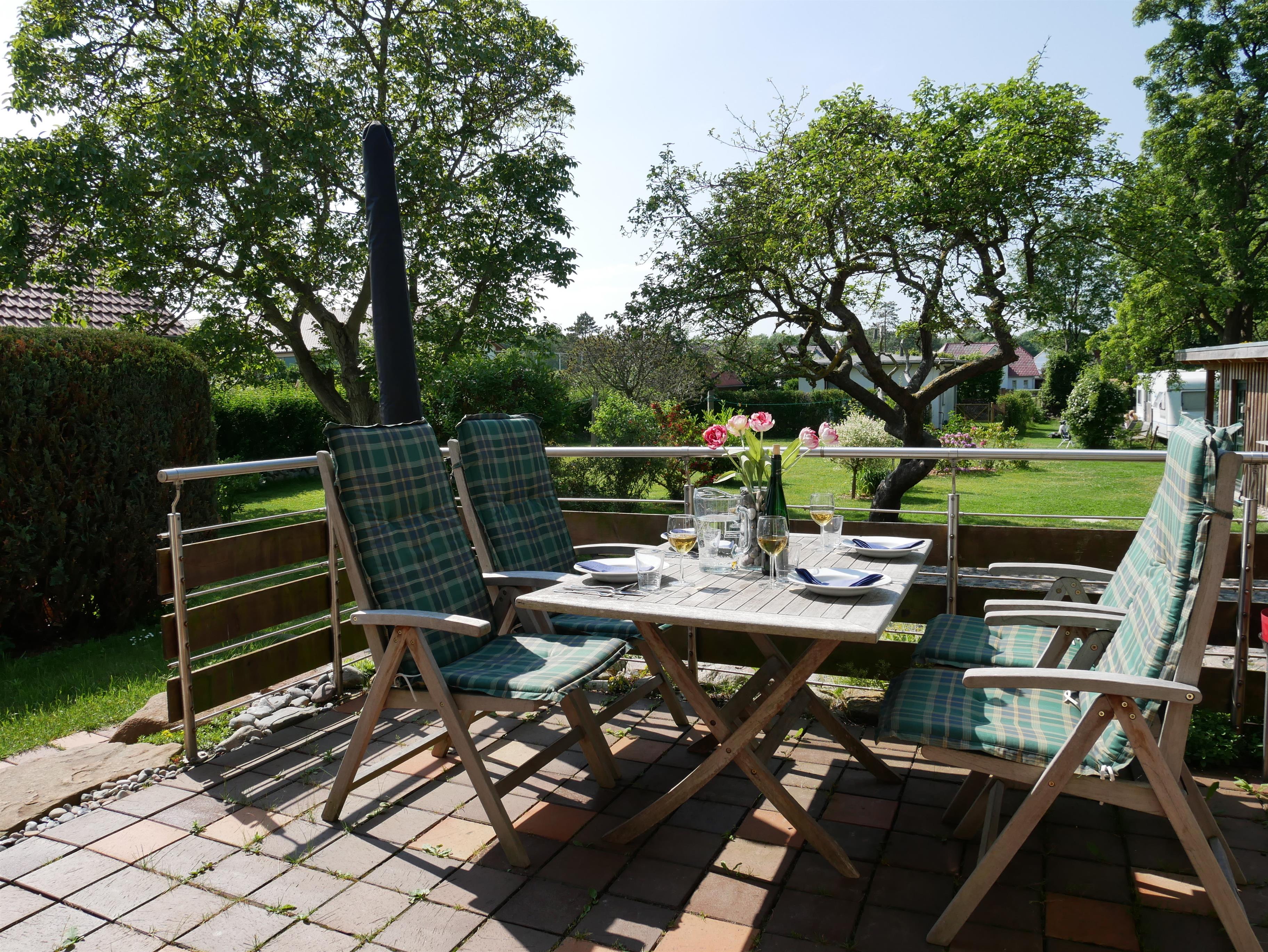 Gemütliche Ferienwohnung Sonnendeck in Wustrow mit Terrasse und Blick in den Garten.