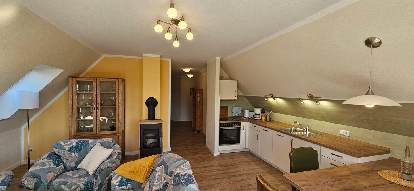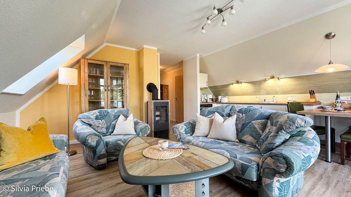 Die Wohnung liegt nur 500 Meter vom feinen Sandstrand entfernt und bietet somit eine tolle Ausgangsbasis für Strandliebhaber. Nach einem Tag am Meer können Sie in der großzügigen Sofaecke des hellen Wohnzimmers entspannen, das mit einem Kaminofen ausgestattet ist und eine gemütliche Atmosphäre schafft. Hier lassen sich die Abende bei einem Glas Wein oder einem spannenden Film auf dem digitalen TV wunderbar ausklingen. Dank des offenen Küchenbereichs müssen Sie auf nichts verzichten – alle notwendigen Küchenutensilien, wie Herd, Backofen, Geschirrspüler und Kaffeemaschine, stehen Ihnen zur Verfügung, um leckere Gerichte zuzubereiten.
