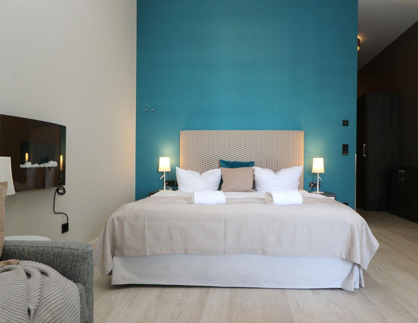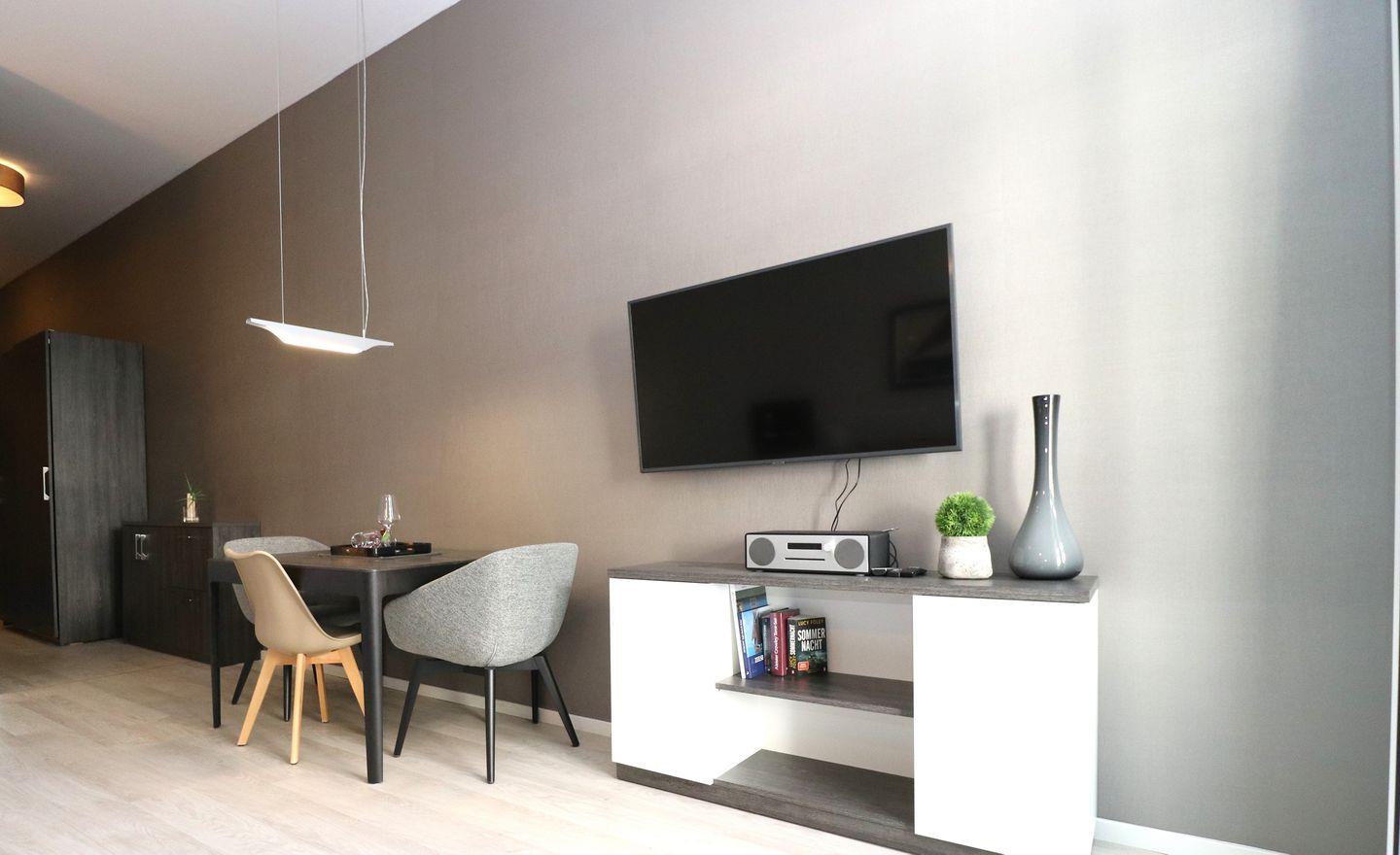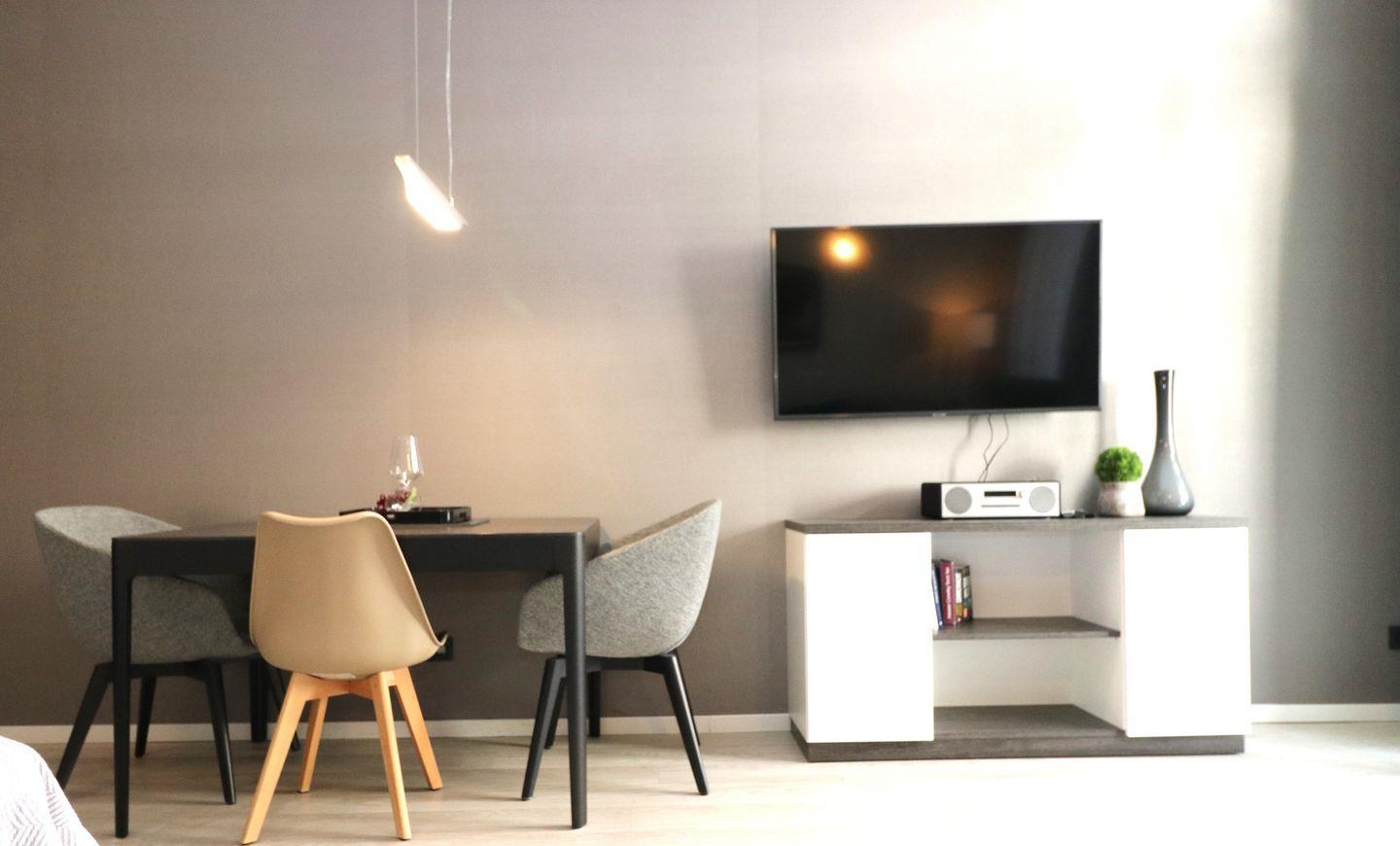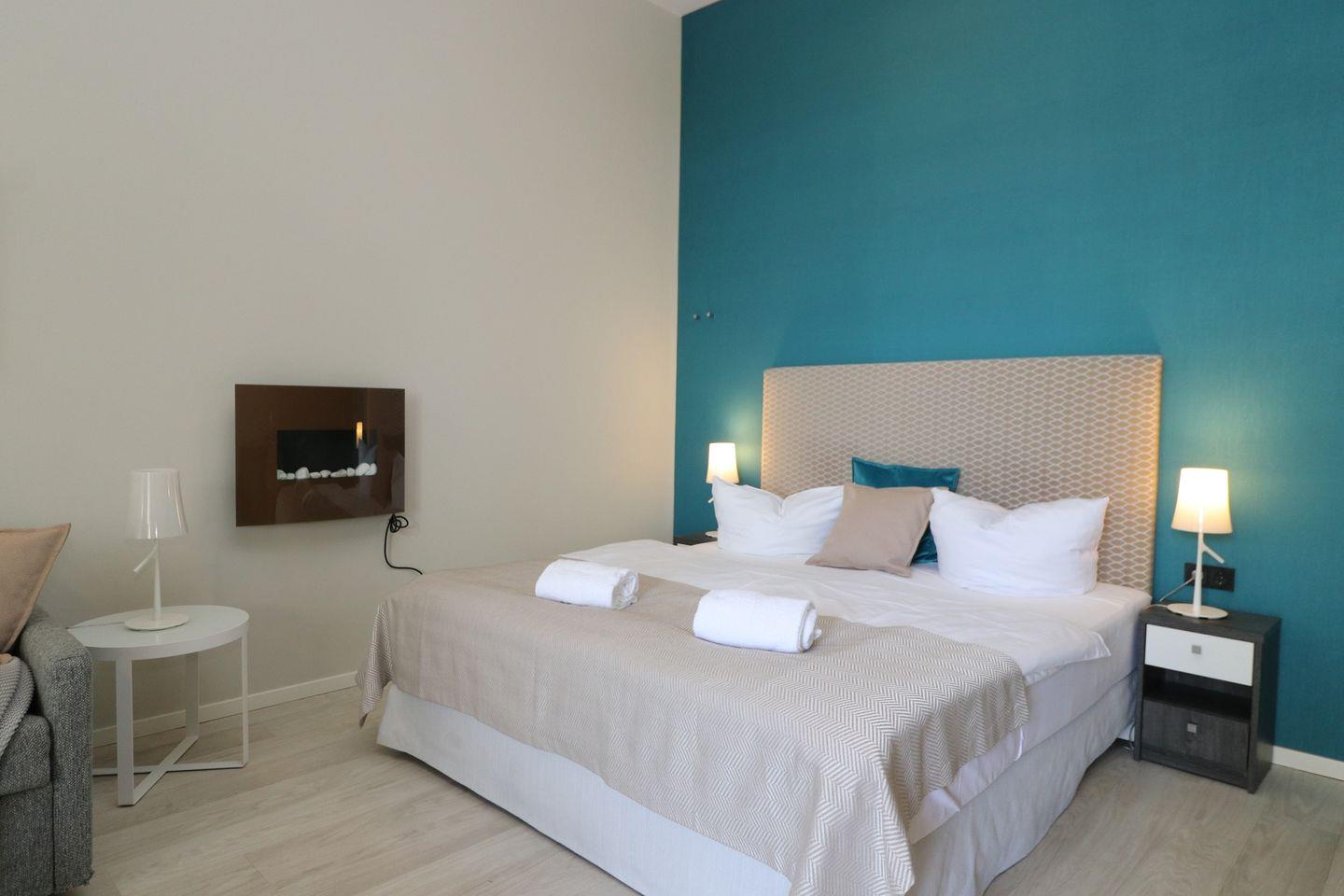 Das lichtdurchflutete Ferienapartment mit großen Panoramafenstern besticht mit seinem elektrischen Kamin im Wohn-/ Ess- und Schlafbereich. Dieser strahlt sowohl Wärme, als auch Gemütlichkeit aus. Ein Sofa, sowie ein Sessel laden zum entspannten Beisammensein ein. Angrenzend befindet sich der Schlafbereich mit einem bequemen Boxspringbett (180cm x 200cm) und zwei Nachttischen mit Nachttischlampen. Gardinen oder Rollläden zur Verdunklung sorgen für eine angenehme Nachtruhe. Für bequeme Sitzmöglichkeiten im Essbereich stehen zwei Sitzschalenstühle und ein Tisch bereit. Auf dem Grundstück steht Ihnen der Pkw-Stellplatz Nr. 09 , das W-Lan sowie die Fahrradabstellplätze in der Tiefgarage kostenlos zur Verfügung.